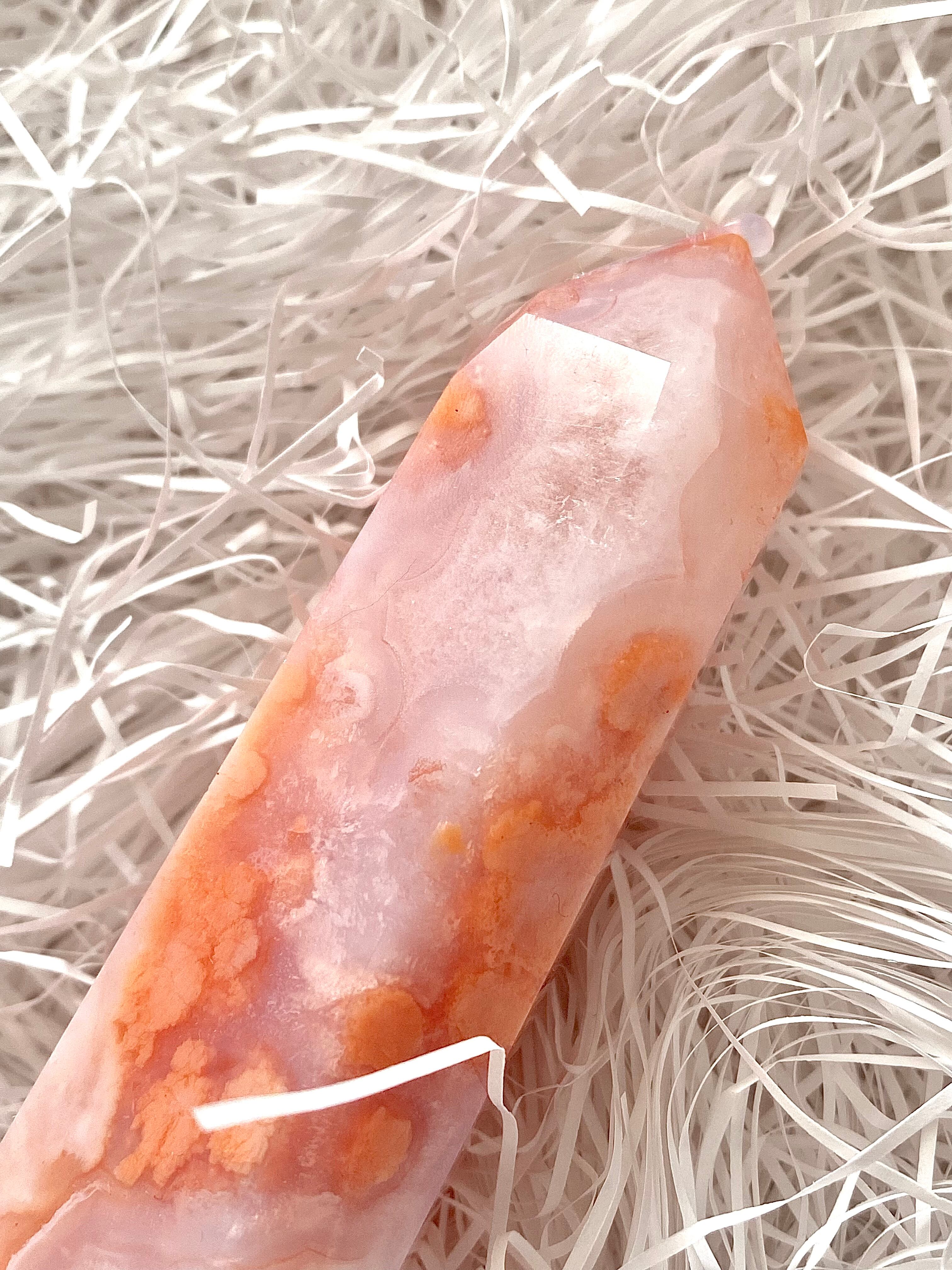 ベースのミルキーピンクの瑪瑙の中にカーネリアンの淡いオレンジ色が混じり合いながら桜瑪瑙の花を咲かせています。