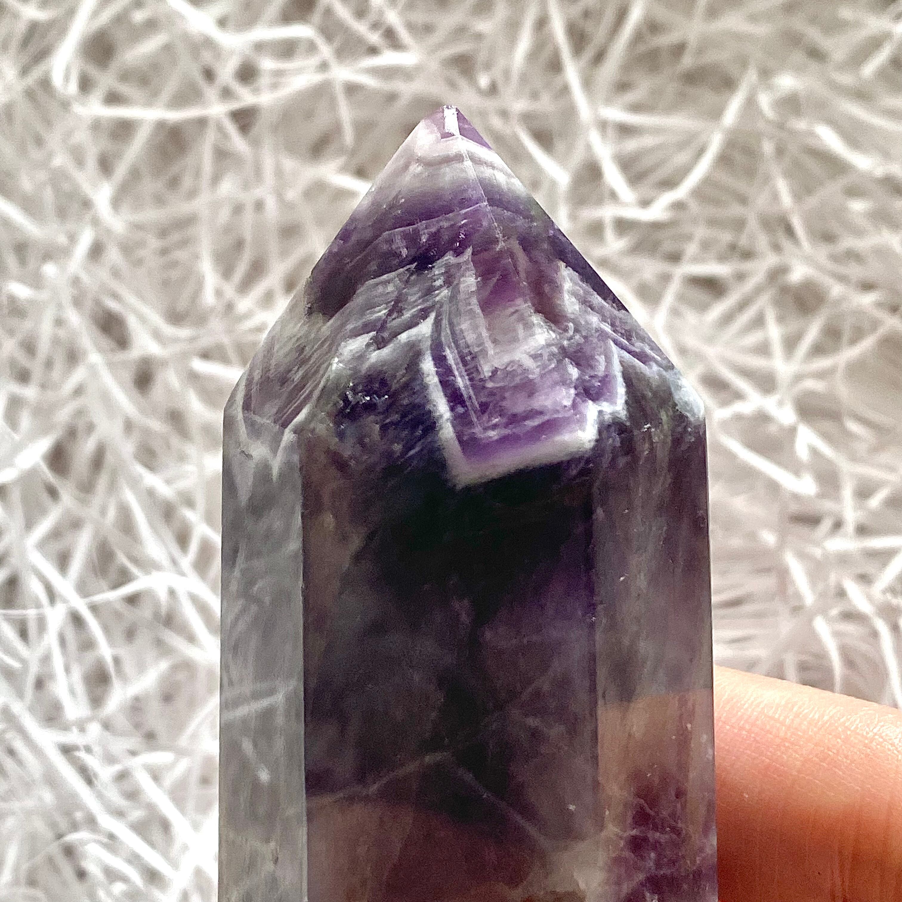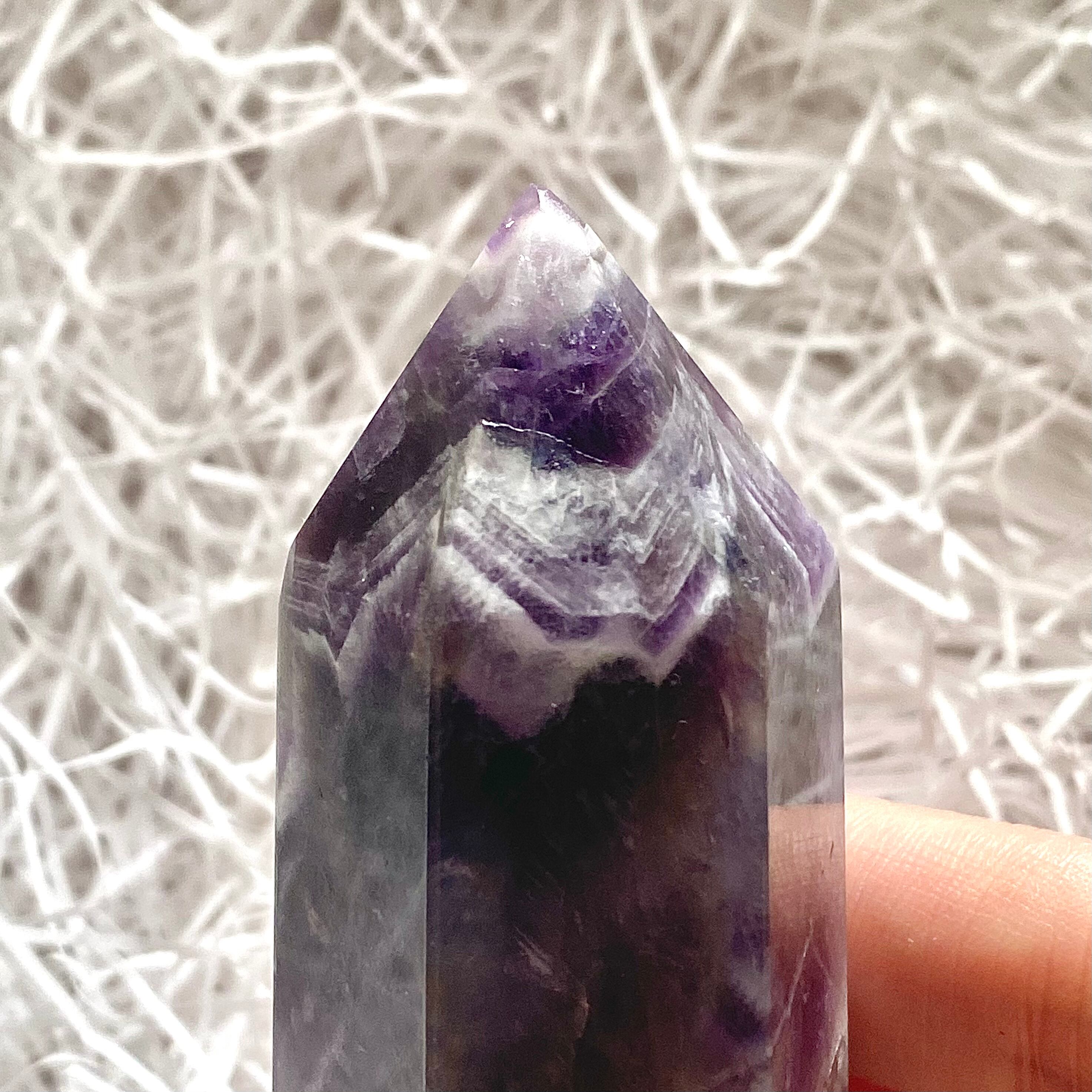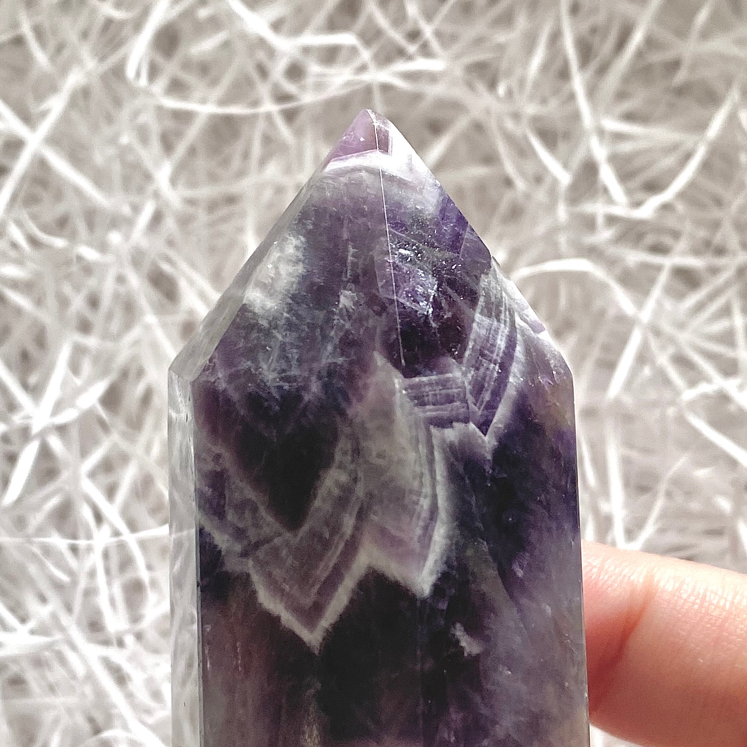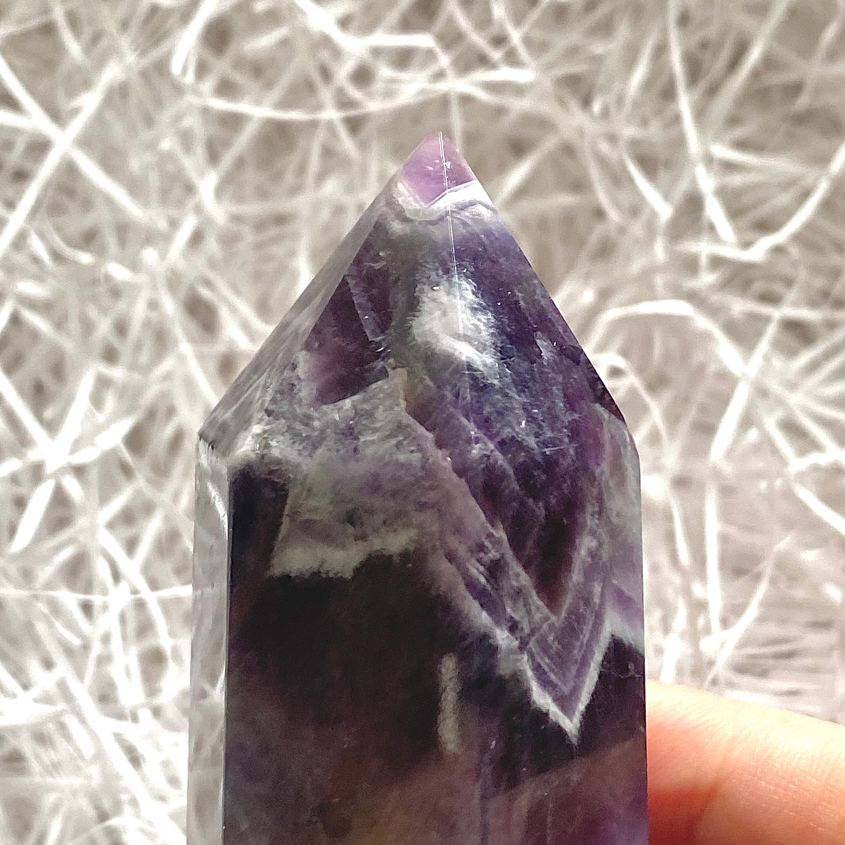 地色は濃い紫ですが中央部分は色の濃淡がある為夜空のような色合いです。ジグザグ模様の境界線がはっきりしていてシェブロンアメジストらしいタワーだと思います。