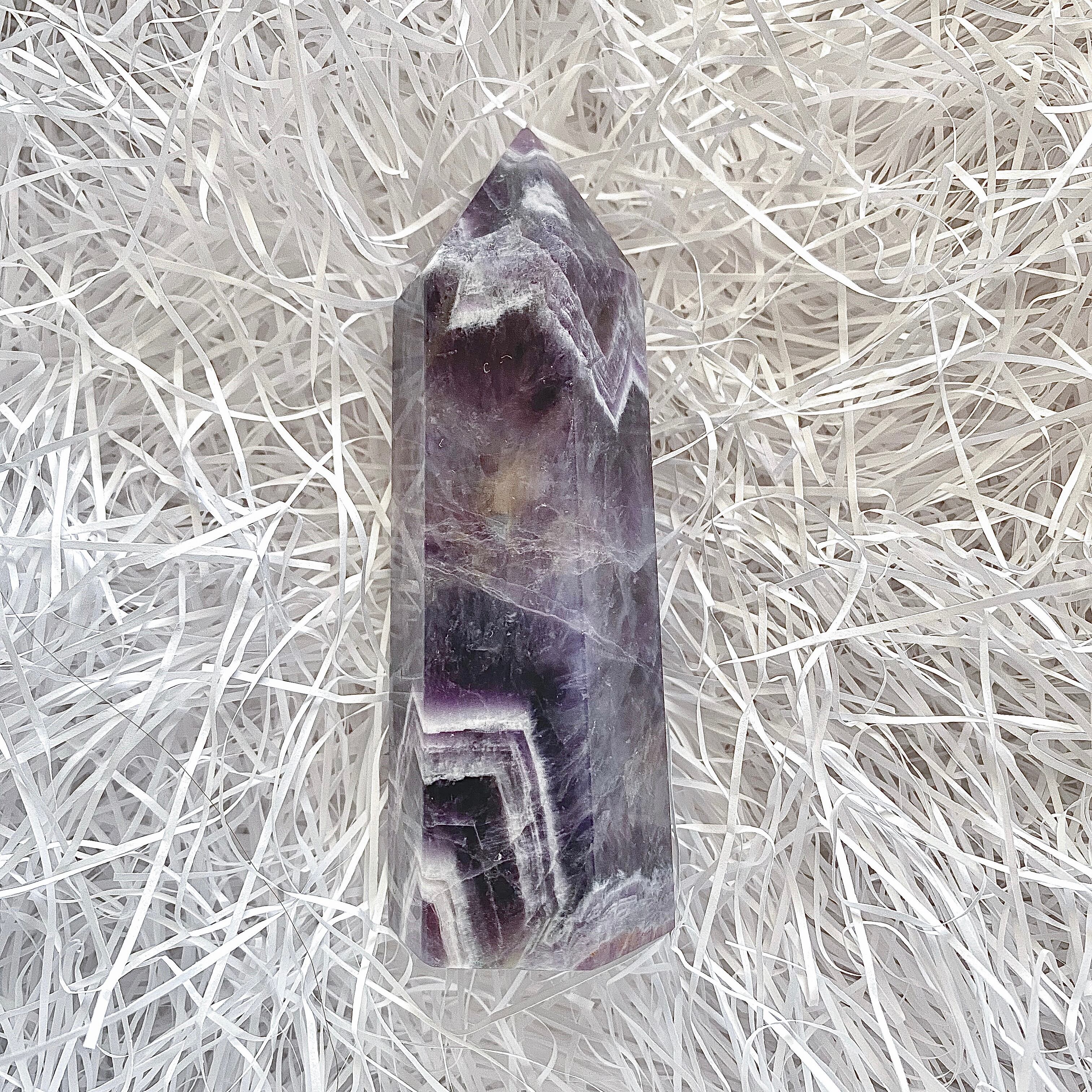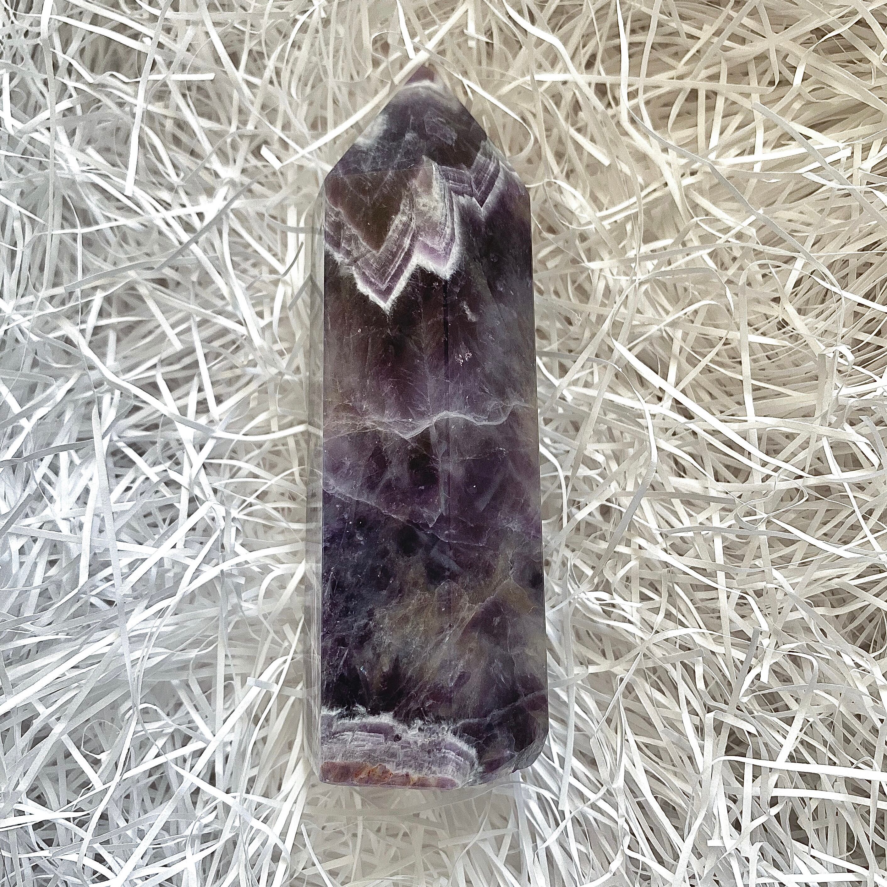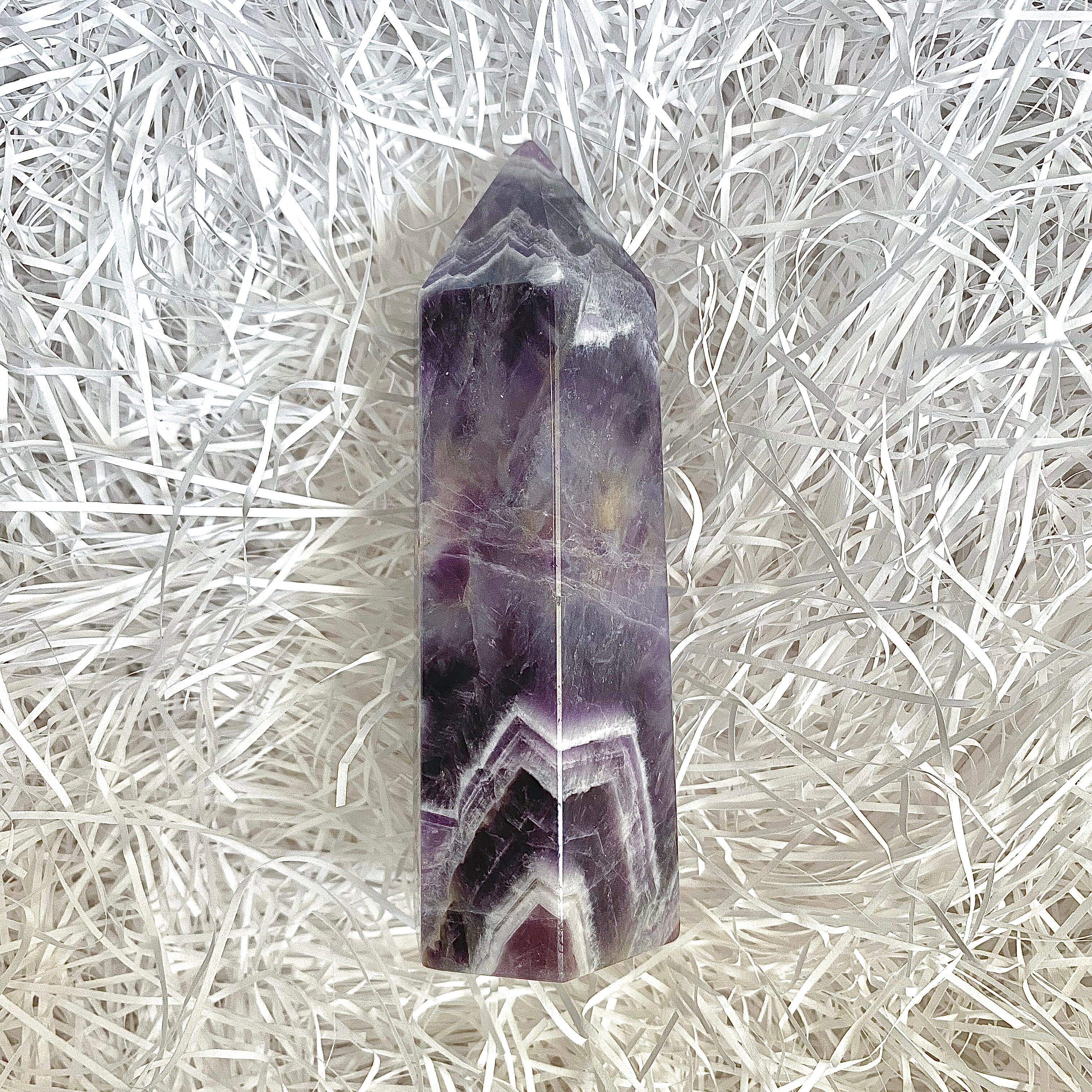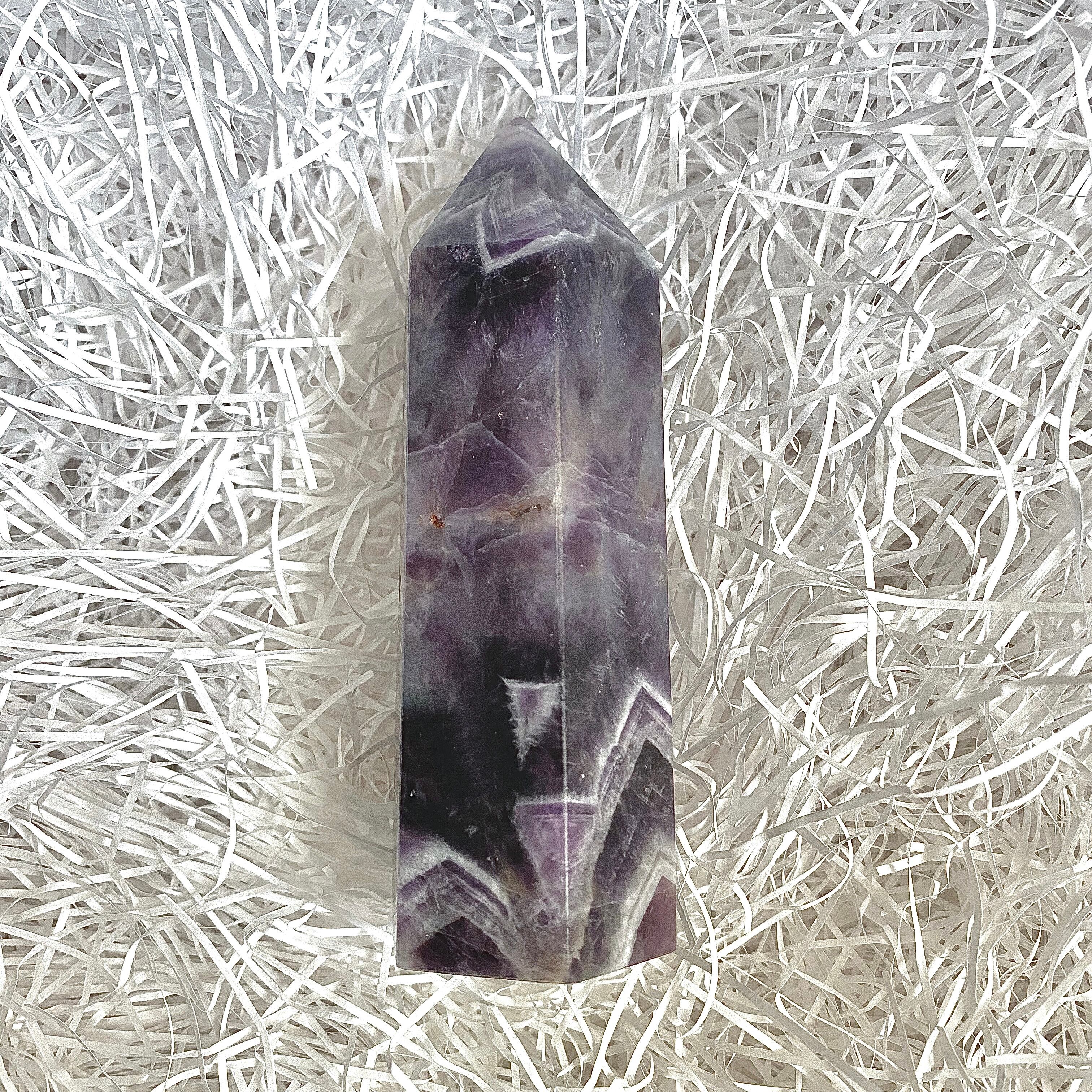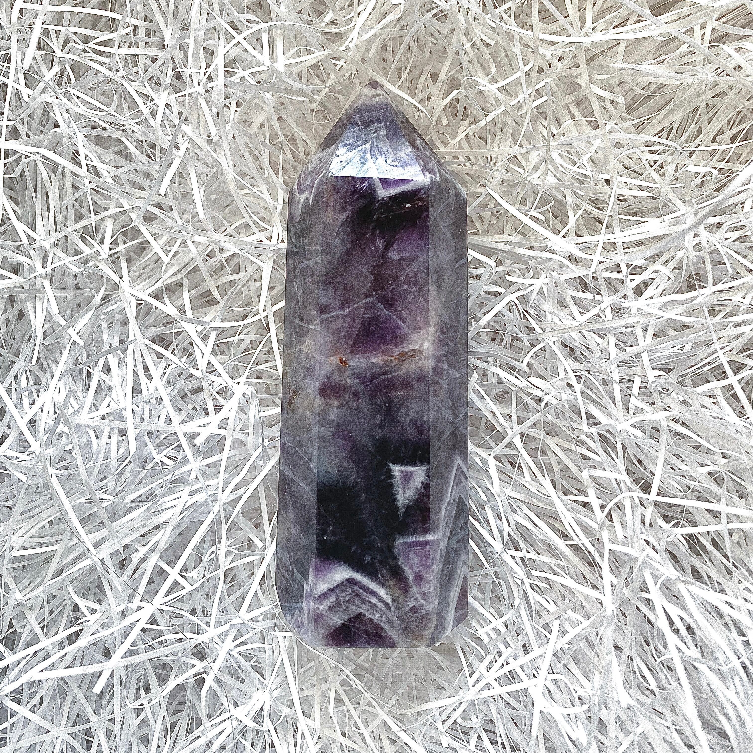 地色は濃い紫ですが中央部分は色の濃淡がある為夜空のような色合いです。ジグザグ模様の境界線がはっきりしていてシェブロンアメジストらしいタワーだと思います。