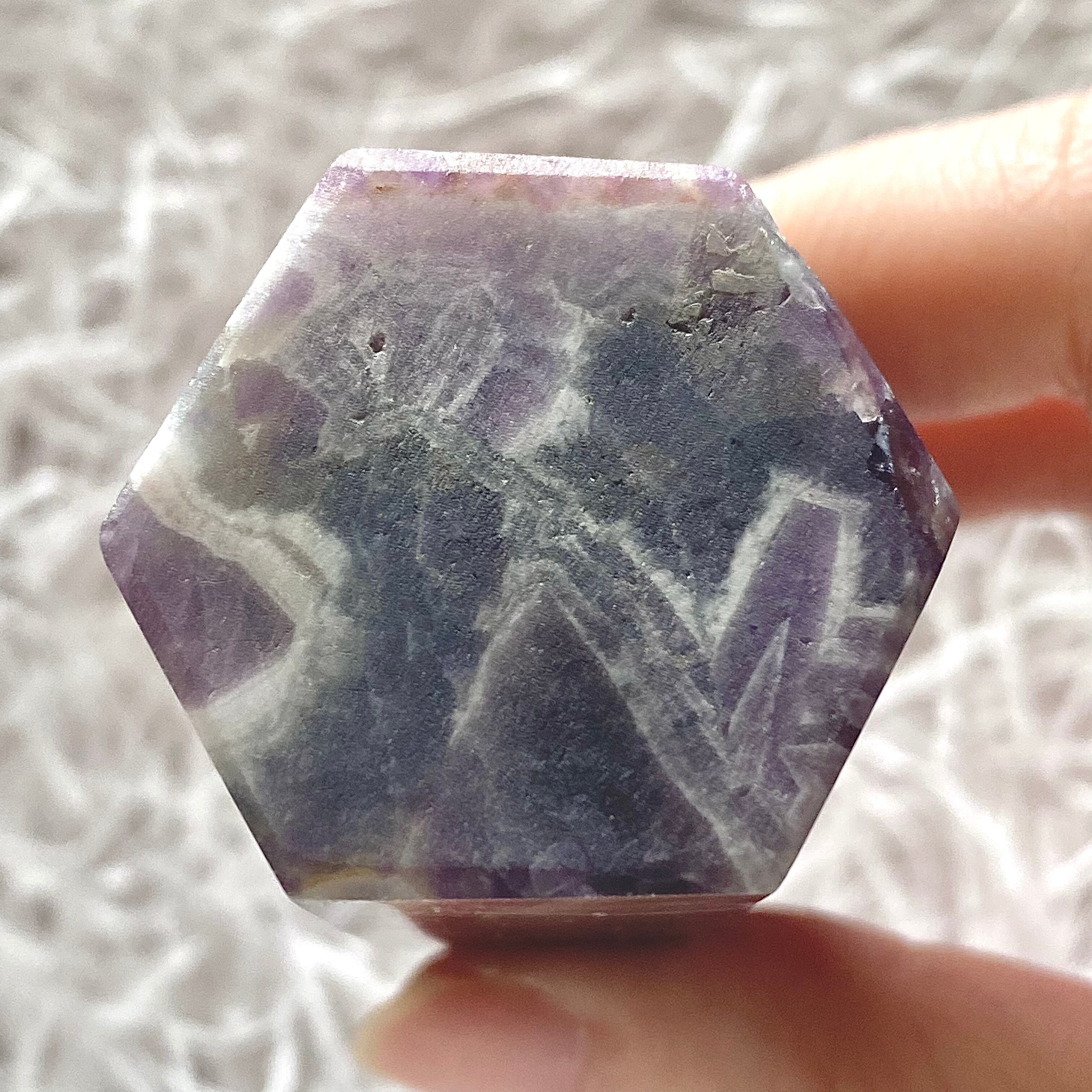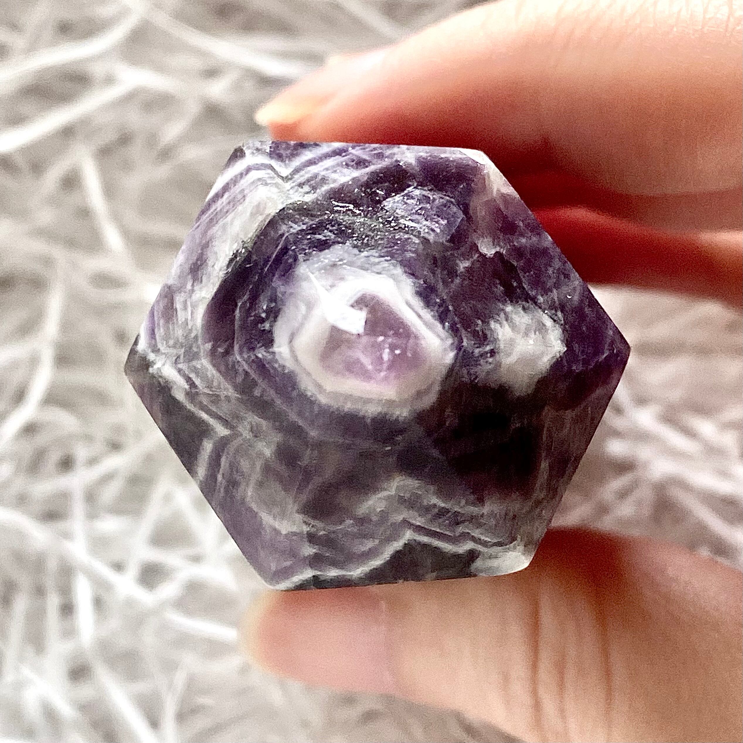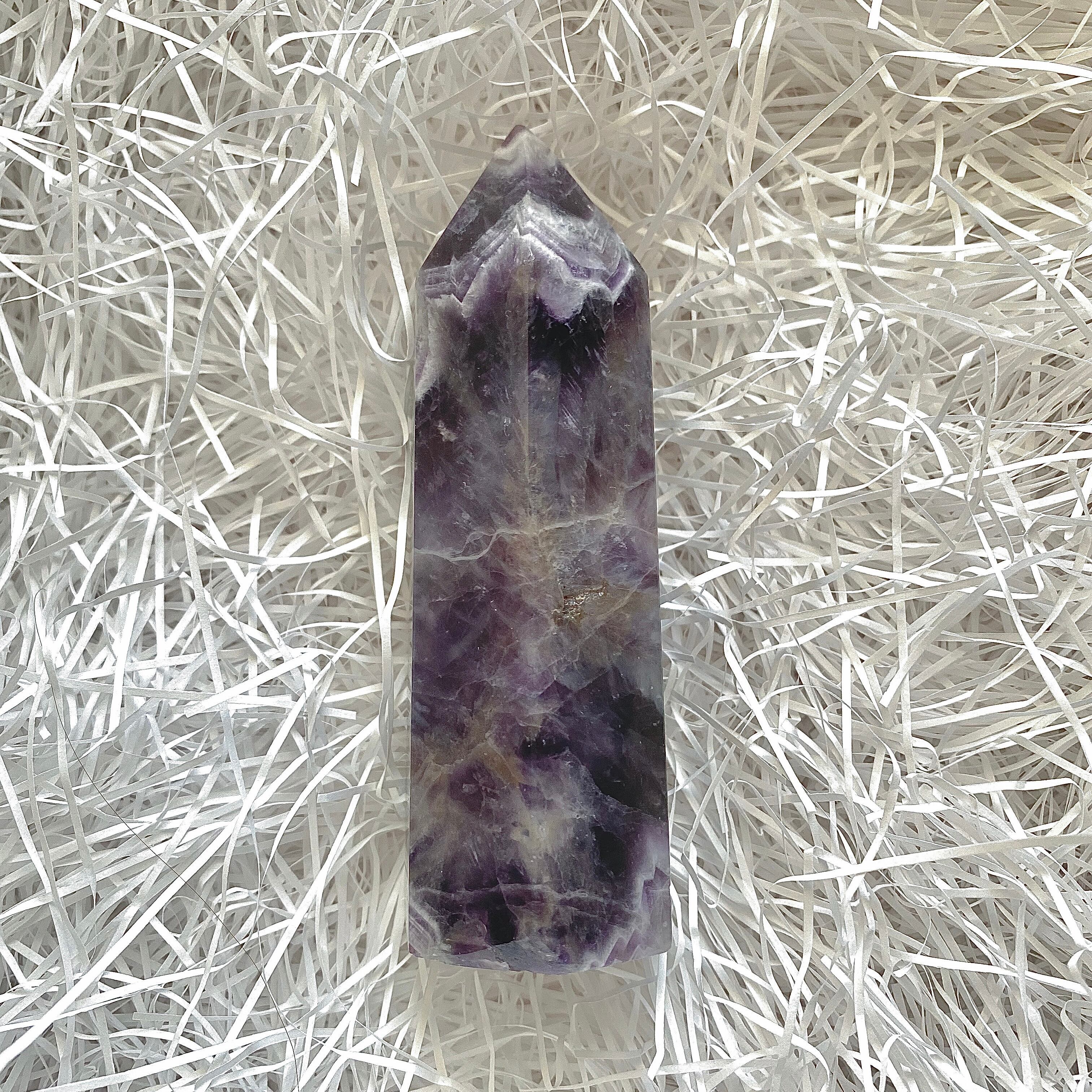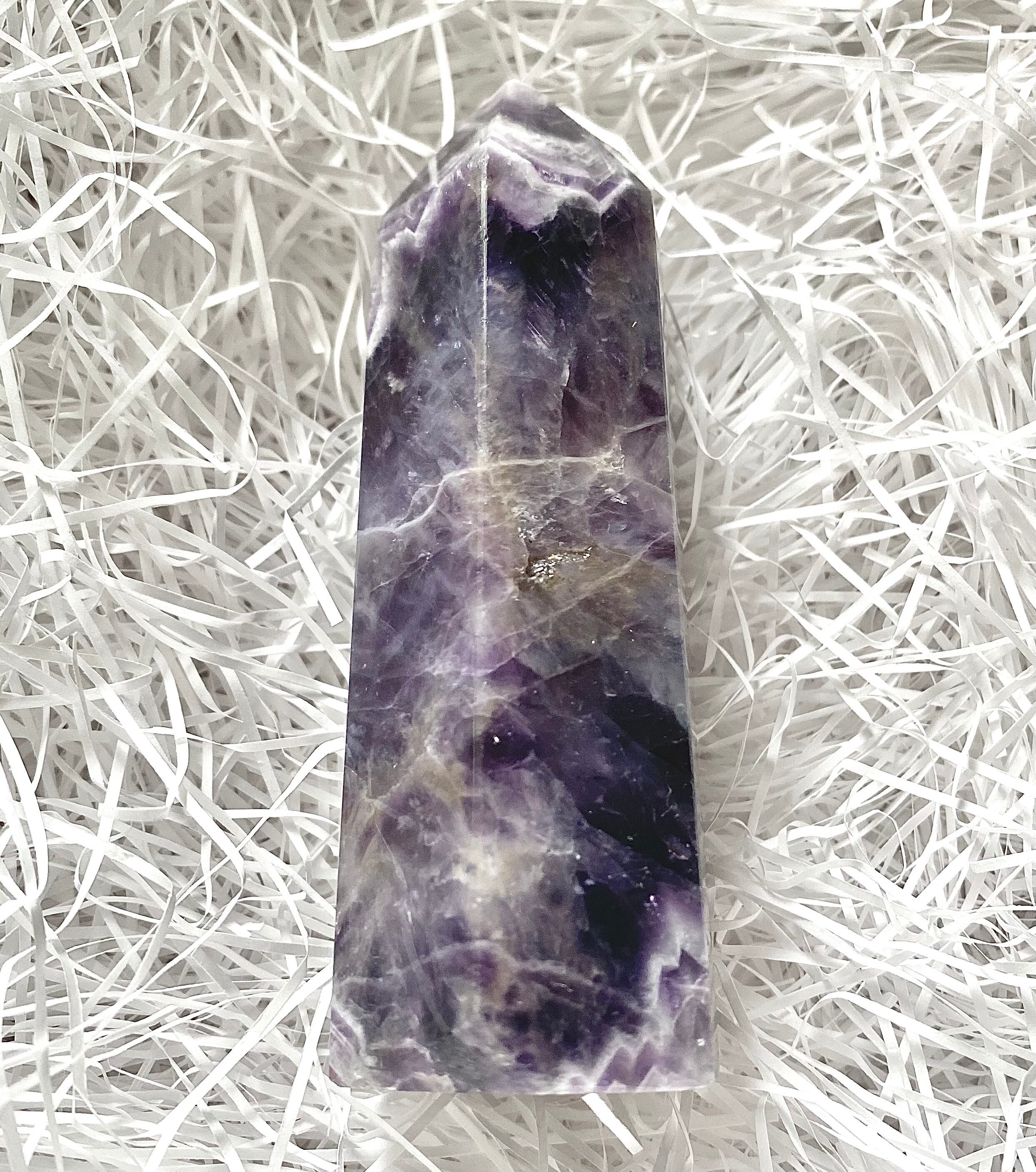 地色は濃い紫ですが中央部分は色の濃淡がある為夜空のような色合いです。ジグザグ模様の境界線がはっきりしていてシェブロンアメジストらしいタワーだと思います。