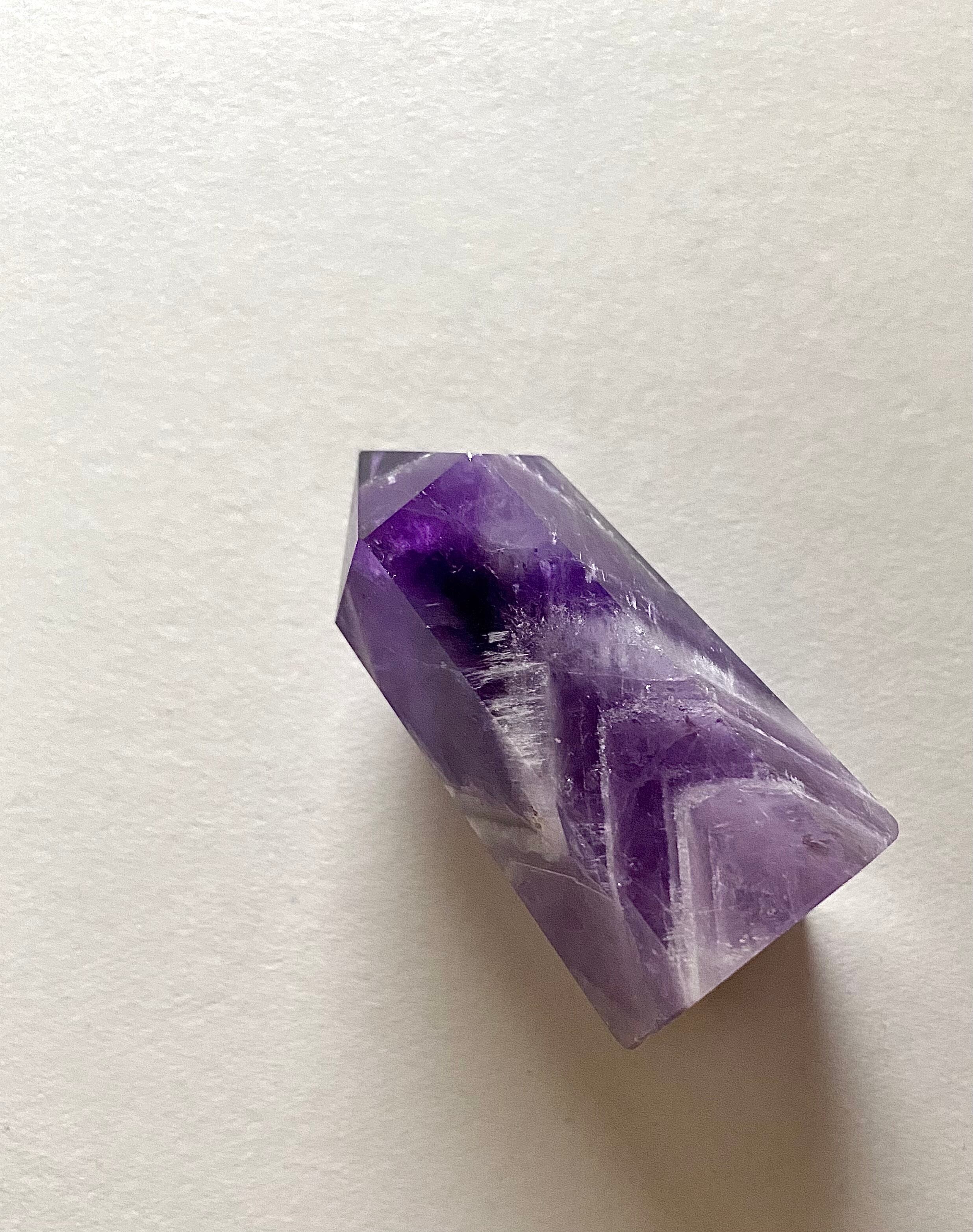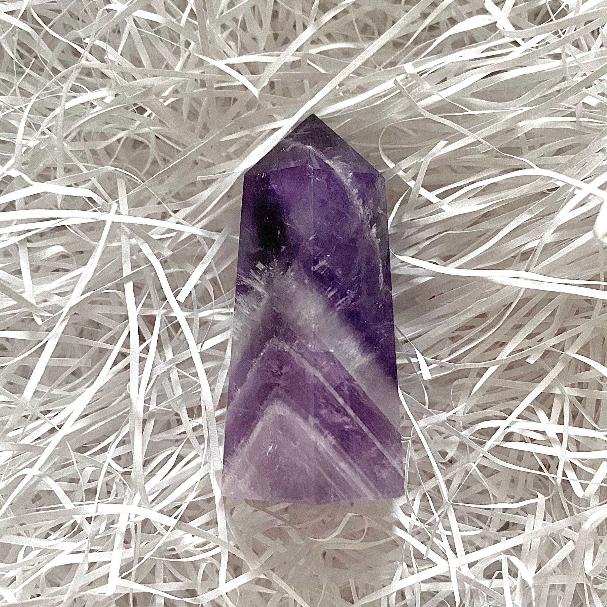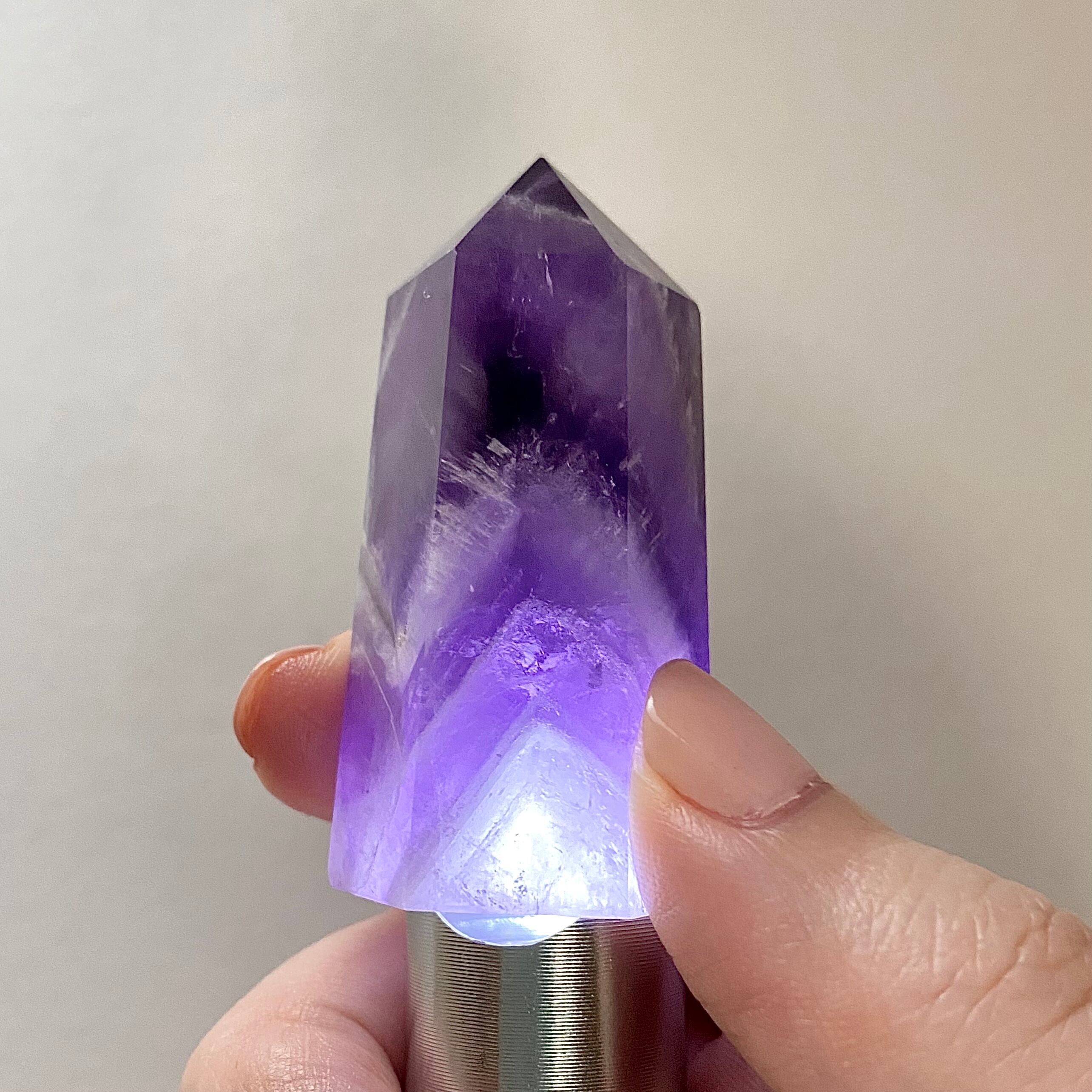 こちらは上部の濃いアメジストからシェブロン柄を経て下部はラベンダーアメジストになっています。ラベンダーアメジストの部分は透明感がありますので下から照明などを当てても素敵だと思います。黄みがかった部分の見られないすっきりとしたカラーのタワーです。