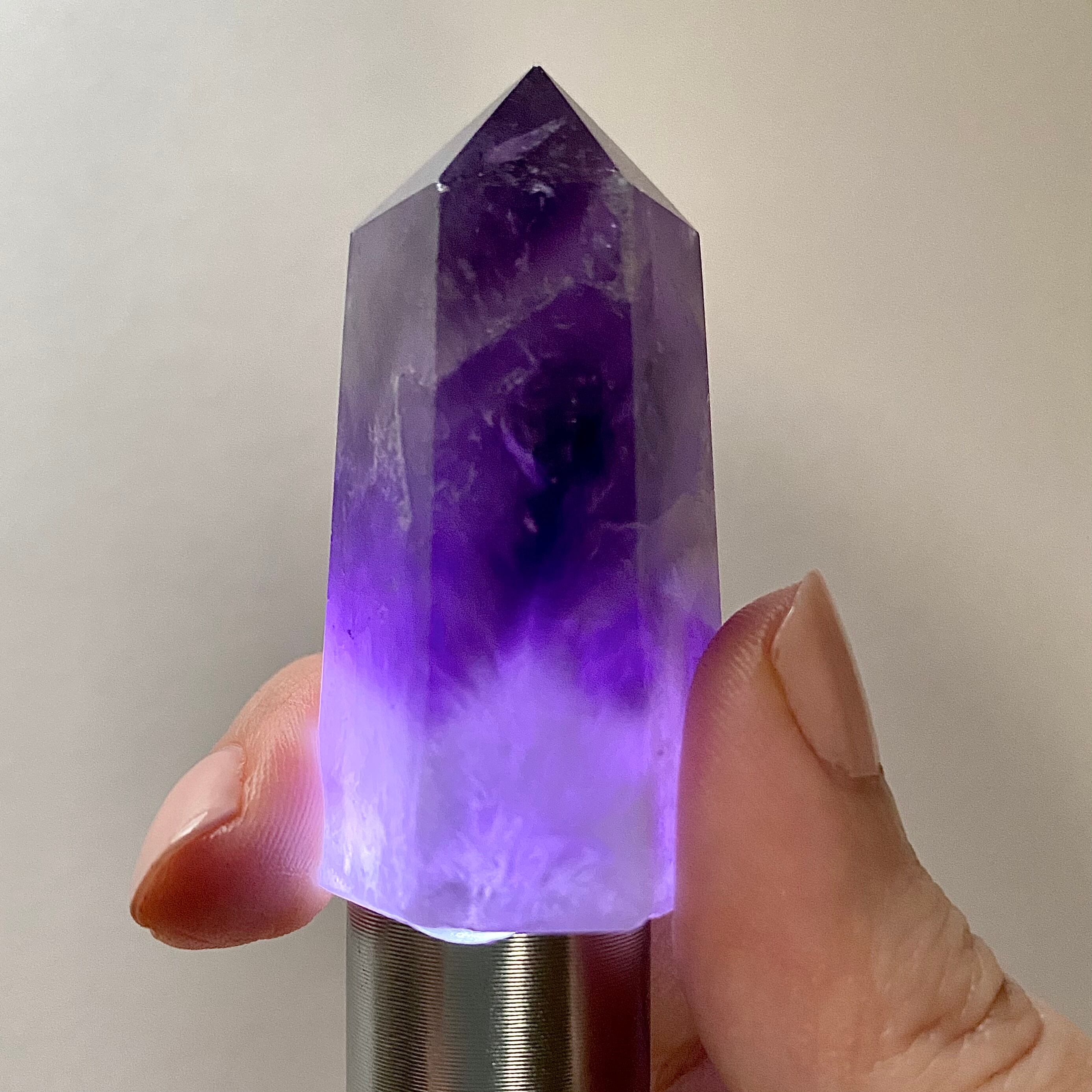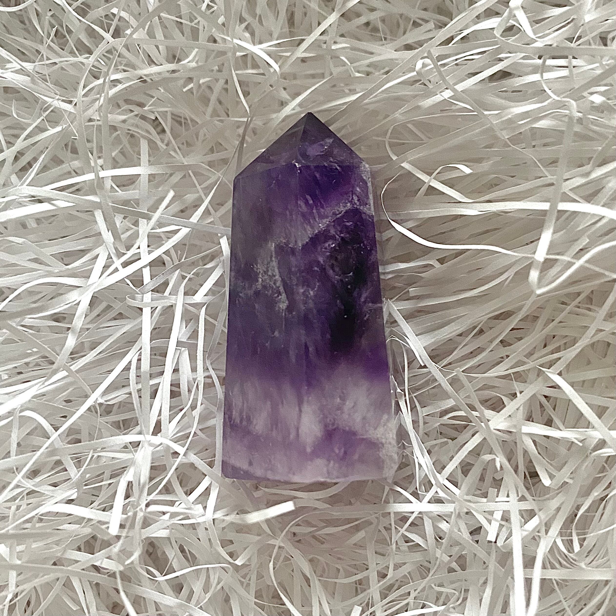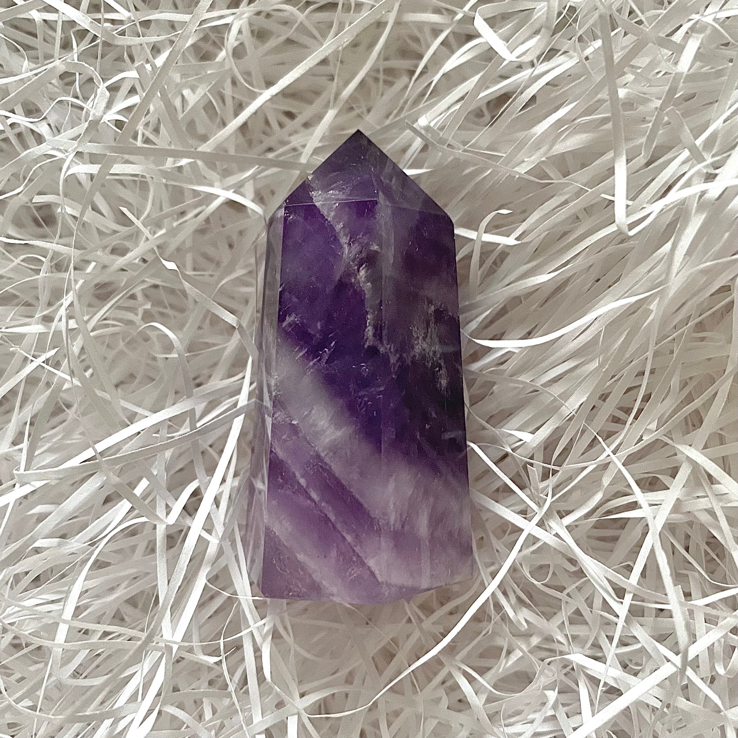 こちらは上部の濃いアメジストからシェブロン柄を経て下部はラベンダーアメジストになっています。ラベンダーアメジストの部分は透明感がありますので下から照明などを当てても素敵だと思います。黄みがかった部分の見られないすっきりとしたカラーのタワーです。