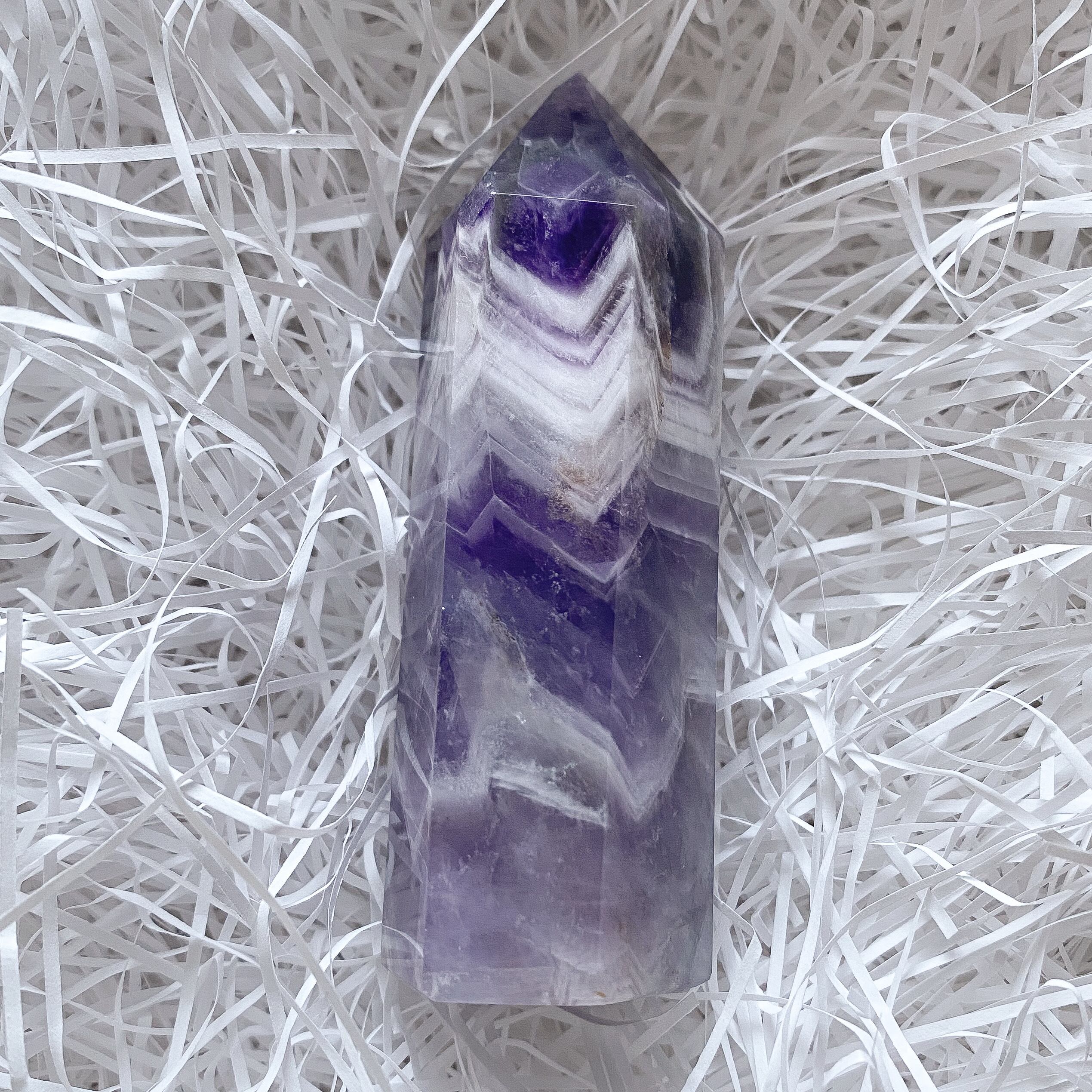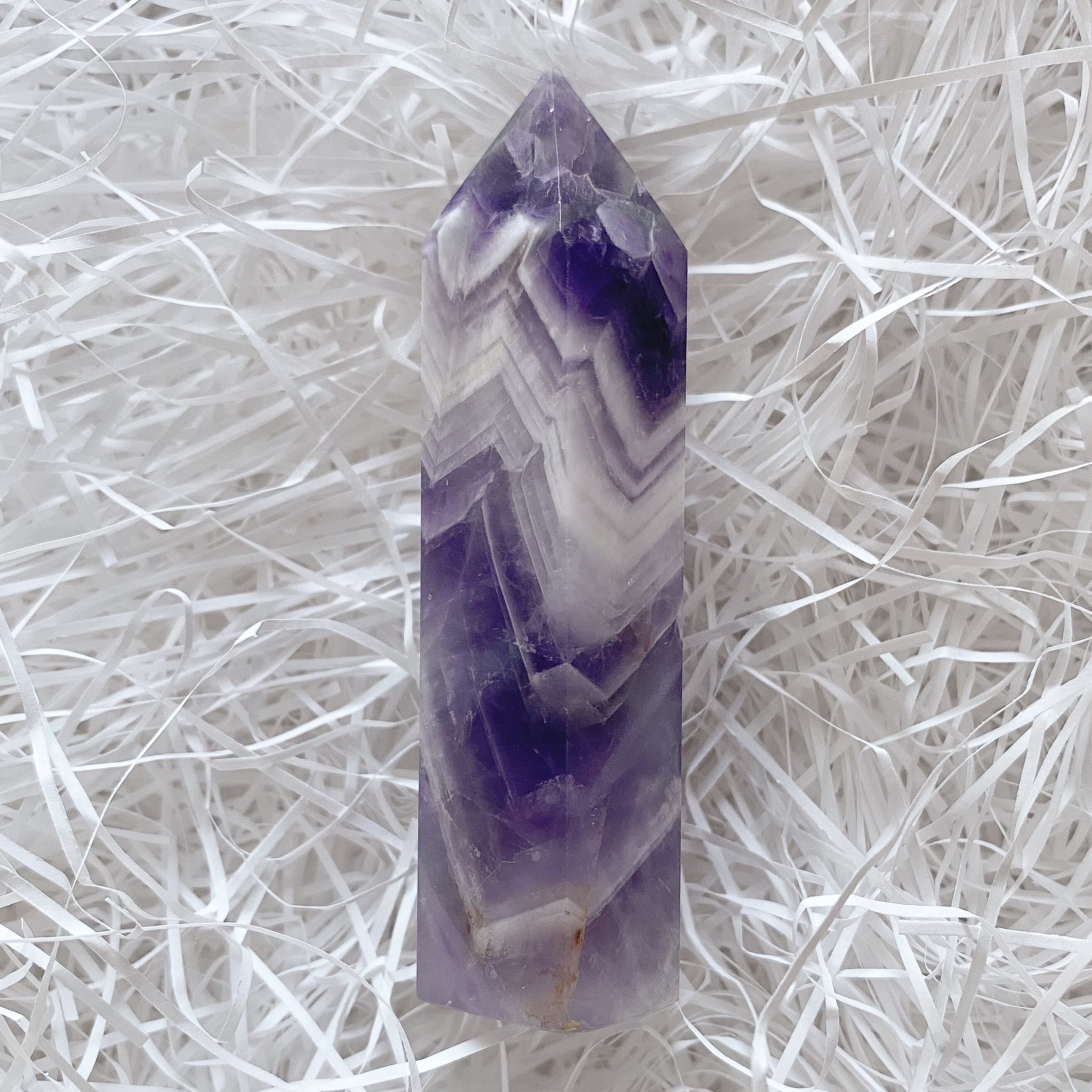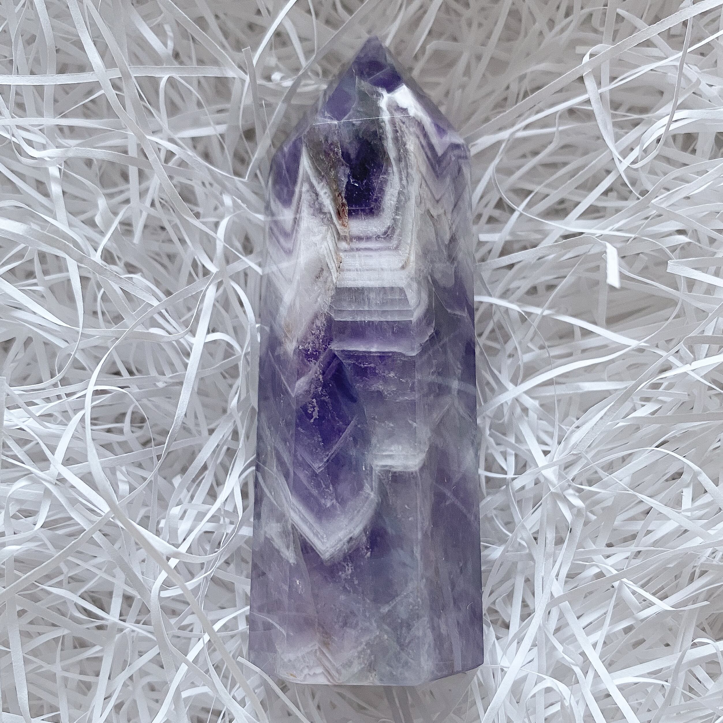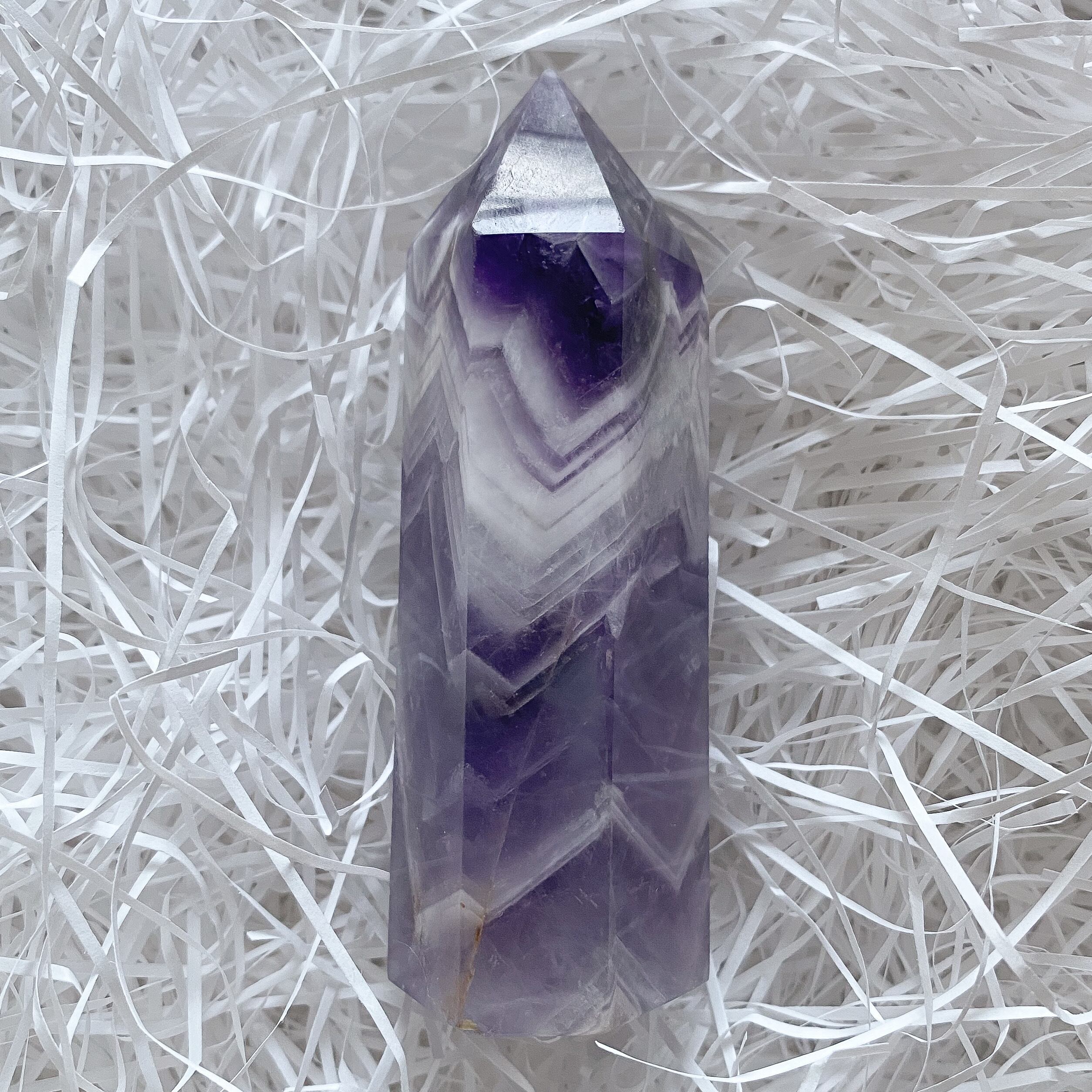 濃い紫色とホワイトとのコントラストが鮮やかなシェブロンアメジストです。柄の入り方が良くタワー全面に山形の模様が広がっています。シェブロンアメジストならではのアメジストの層や色合い、模様を楽しめるタワーポイントだと思います。