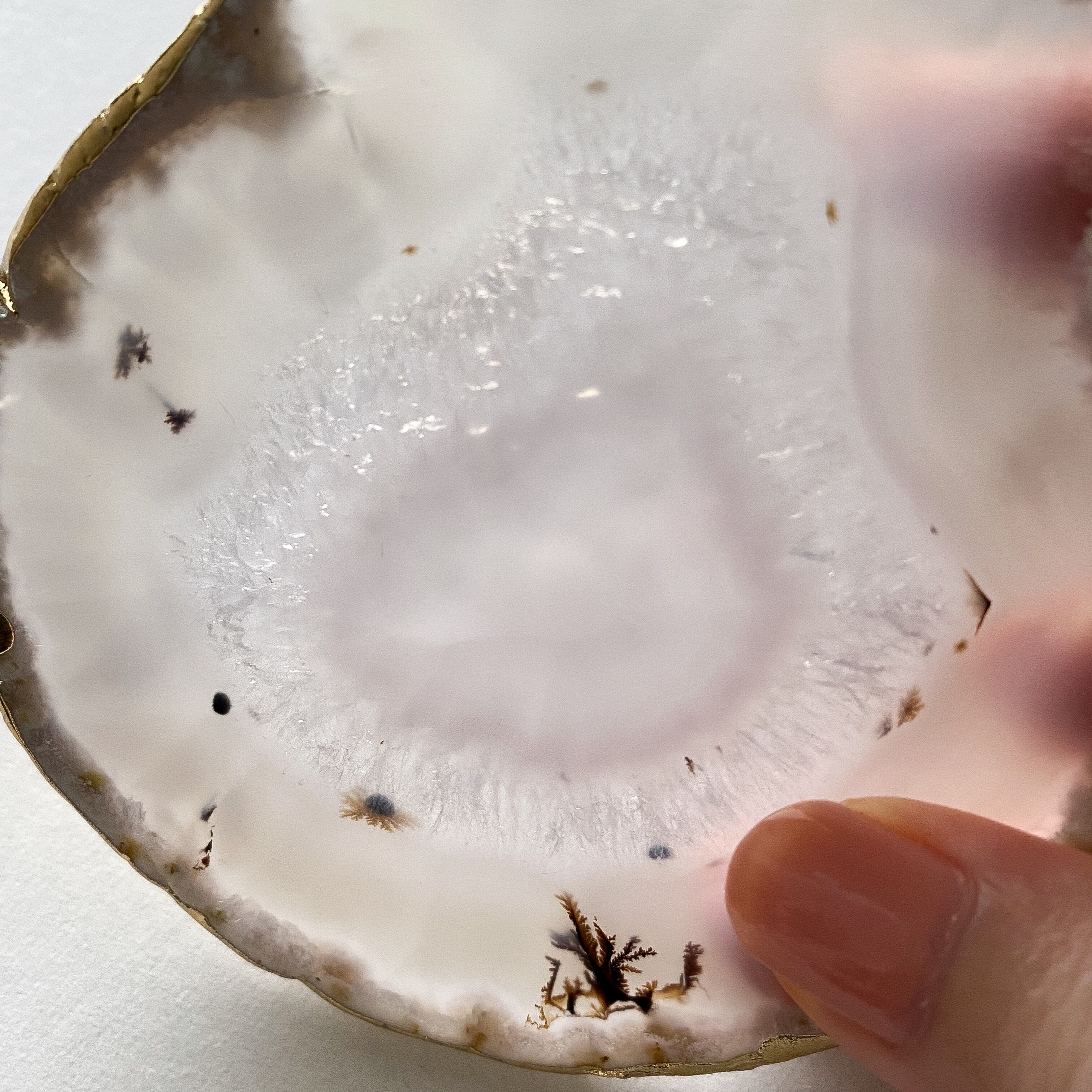 柄の入り方、形共に良く半透明の瑪瑙の間に結晶質が入ります。縁にデンドライトも見られ、光に透かすと雲のような地の模様が浮かび上がってきます。