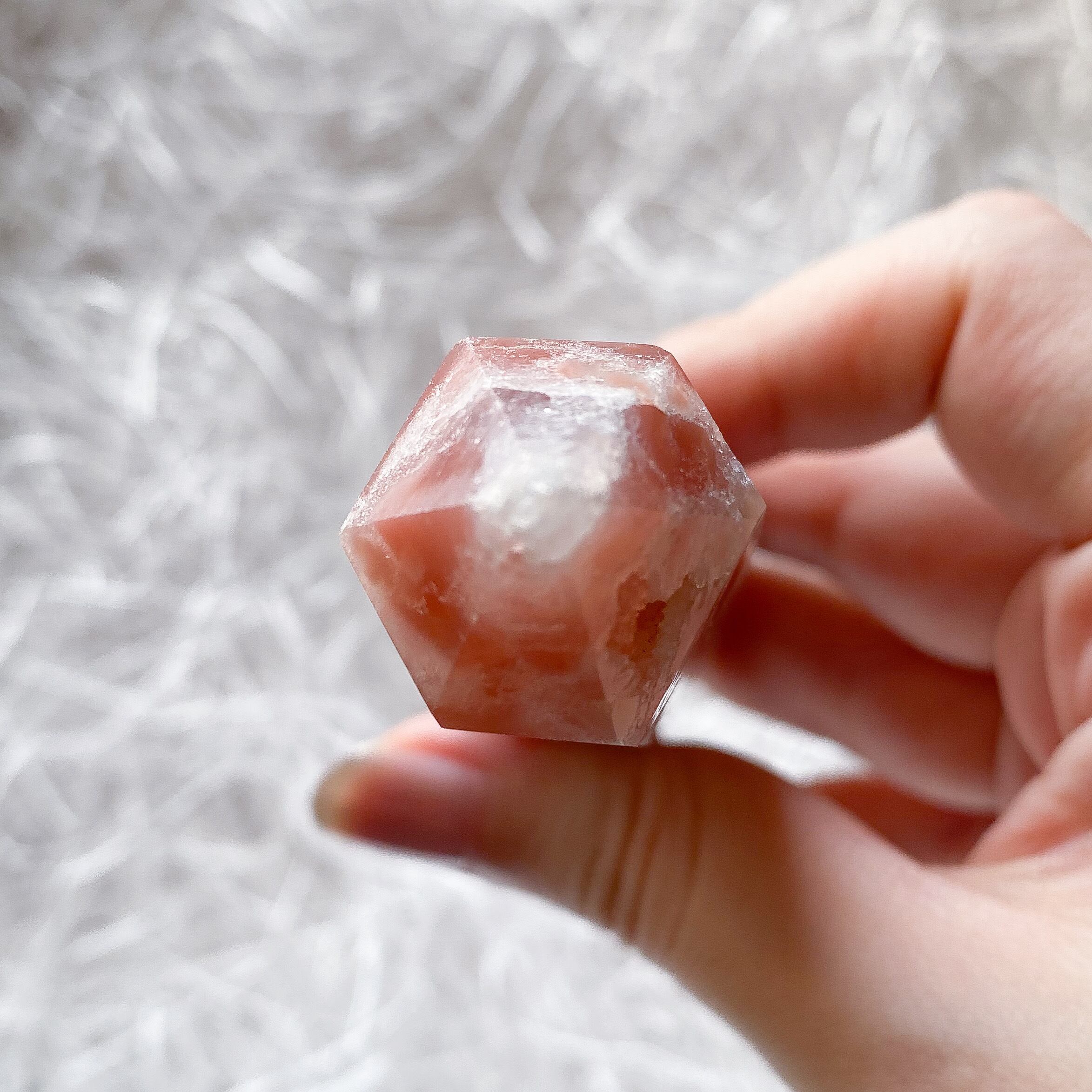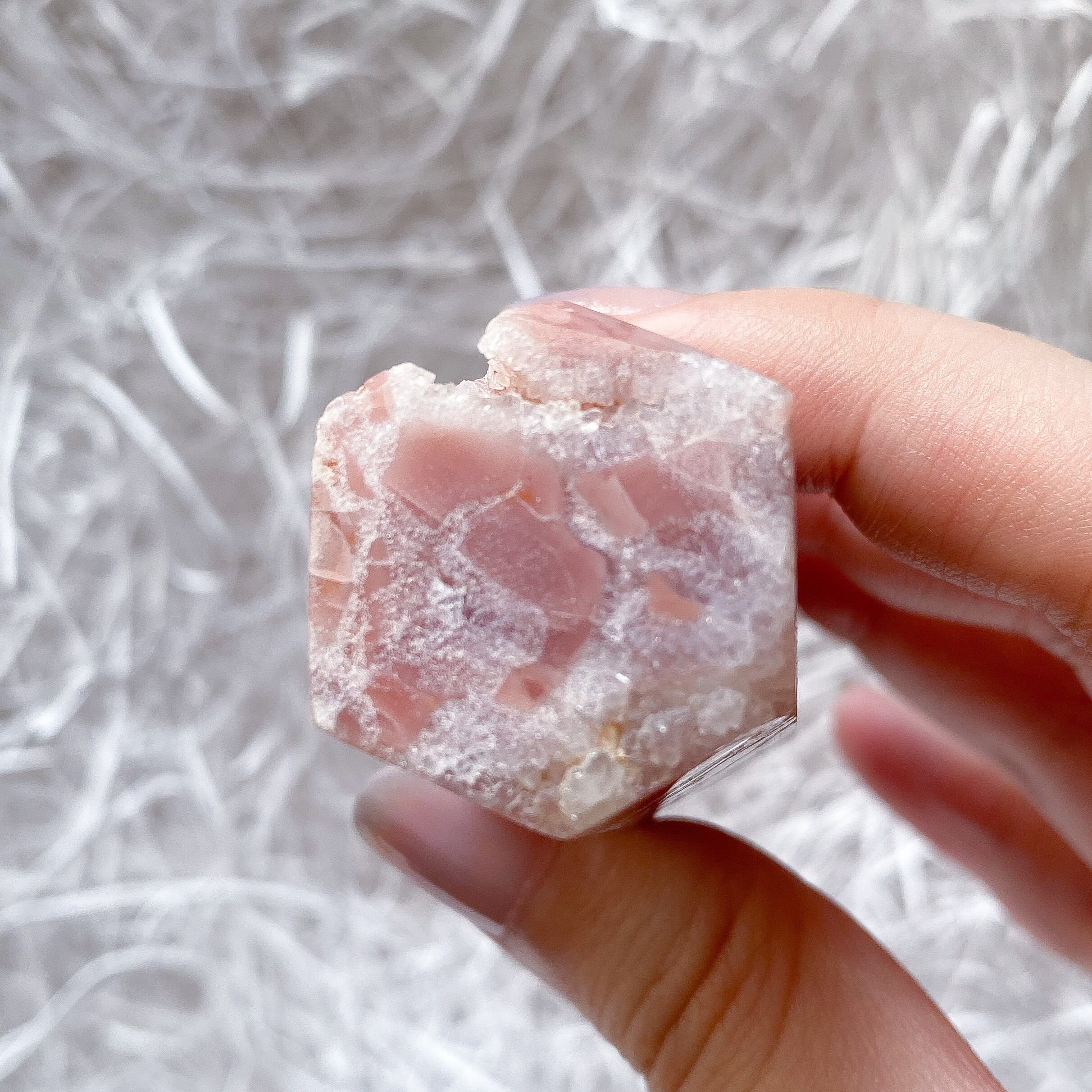 無加工でありながらクラック水晶のような亀裂の入った瑪瑙です。同じく無加工の爆裂阿拉善瑪瑙と雰囲気が似ていますがアラシャンが多色なのに対しこちらはピンク一色となります。
