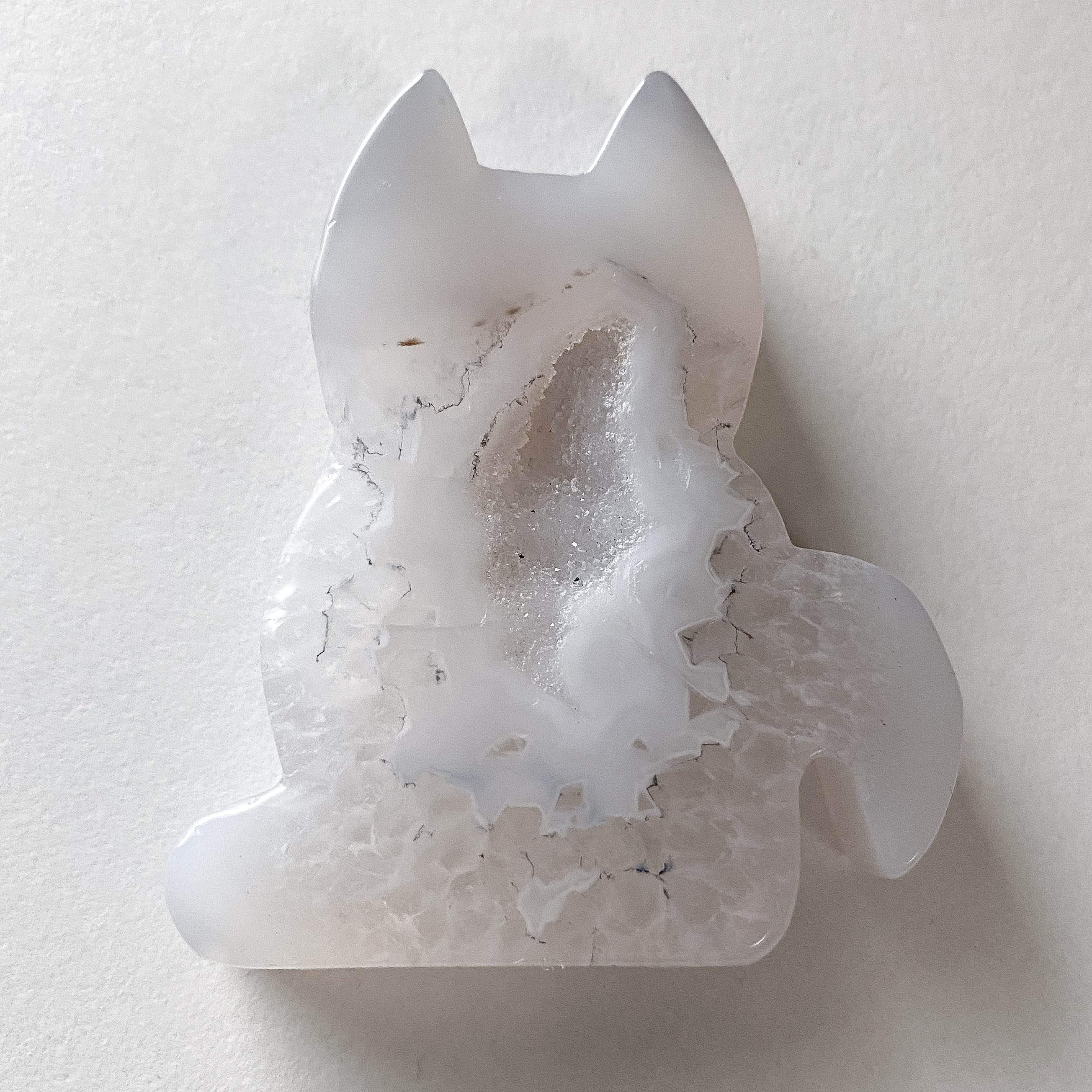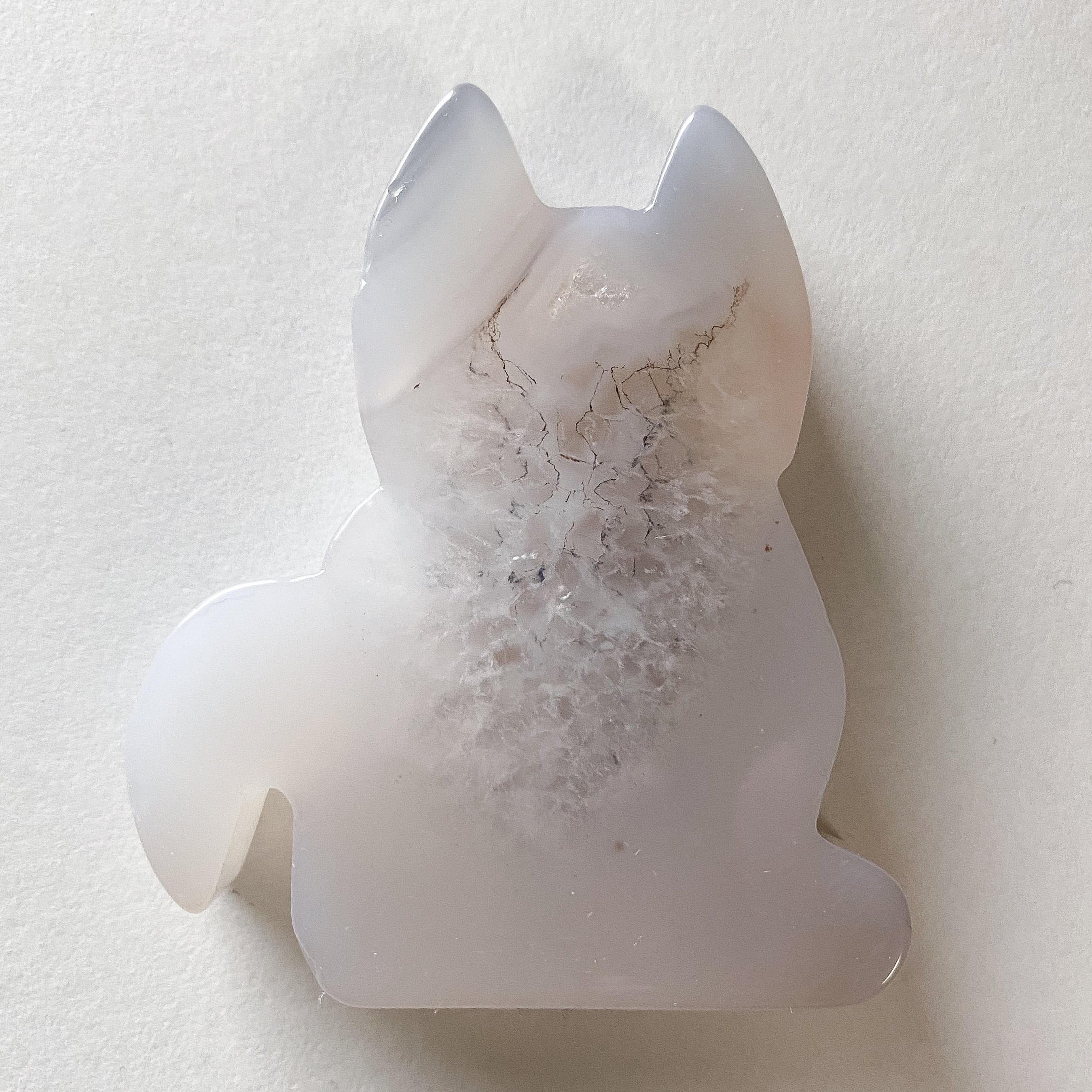 白色の瑪瑙の中央がドゥルージーアゲートになっている猫ちゃんのプレートです。自立可能です。