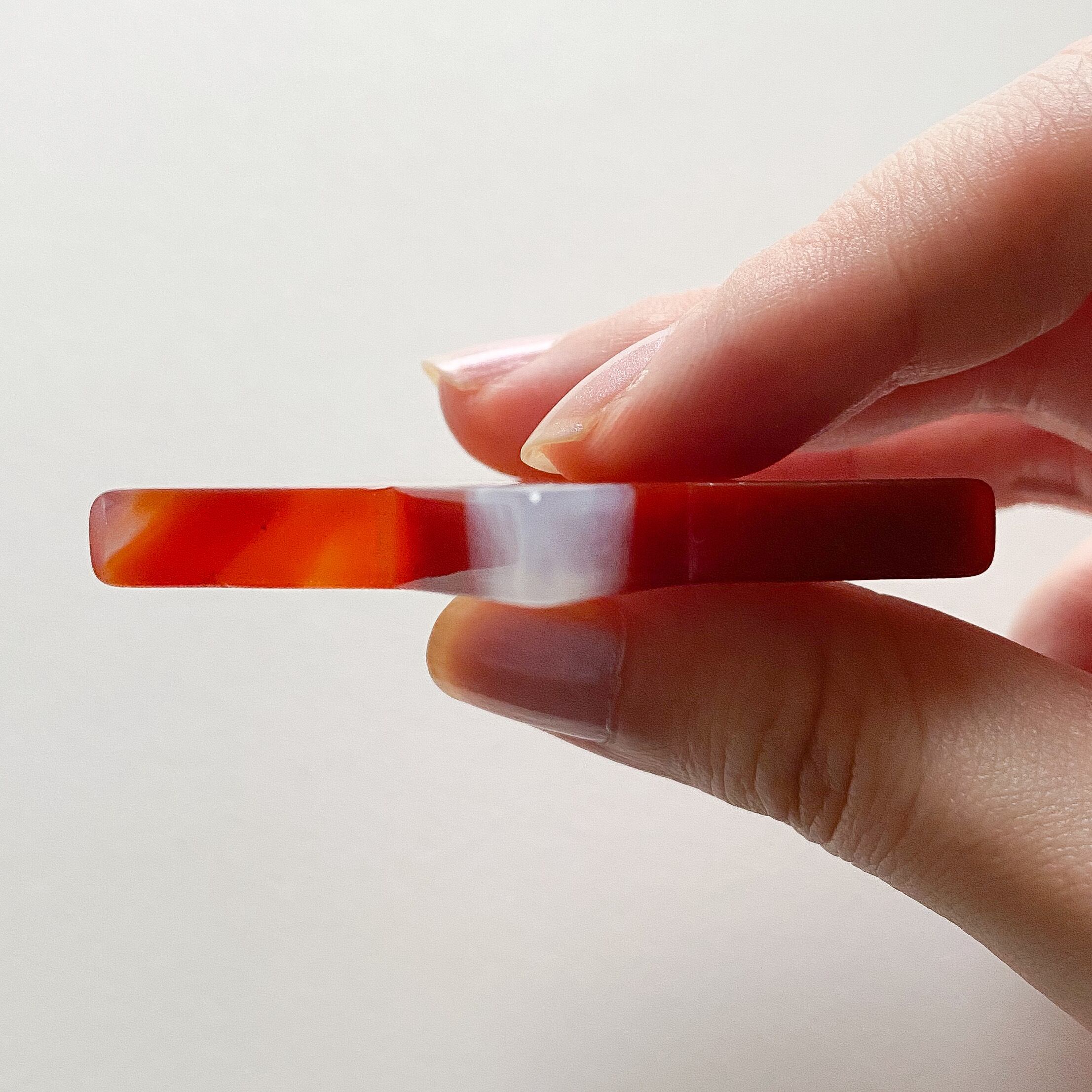 瑪瑙の中でも特に赤色の瑪瑙を赤瑪瑙又はカーネリアン、サードオニキスと呼びます。厳密には違いがあり、縞目のものを赤瑪瑙/サードオニキスと呼び、縞目のない玉髄のタイプをカーネリアンとするという区別はありますが、現在では纏めてカーネリアンと呼ぶことが多いです。