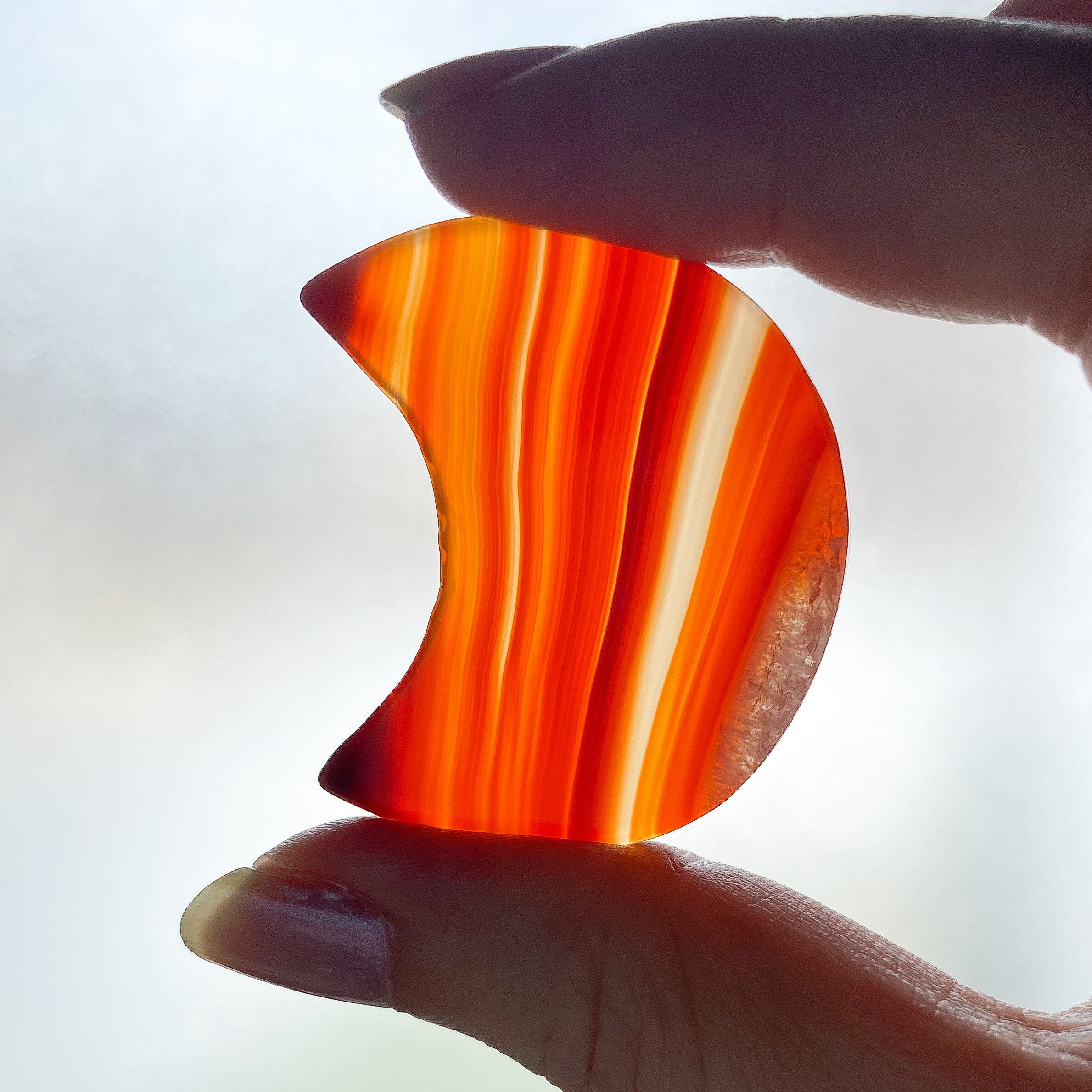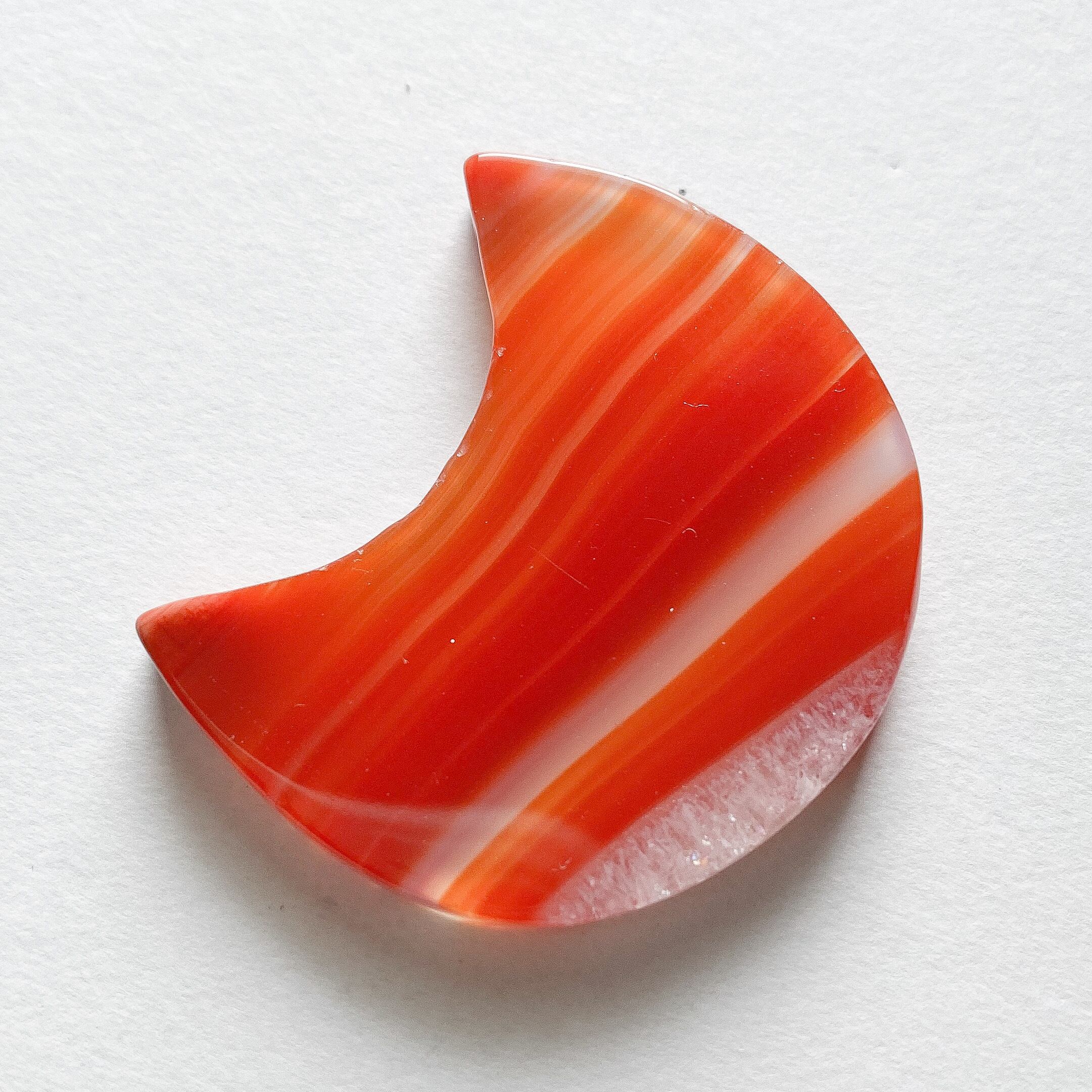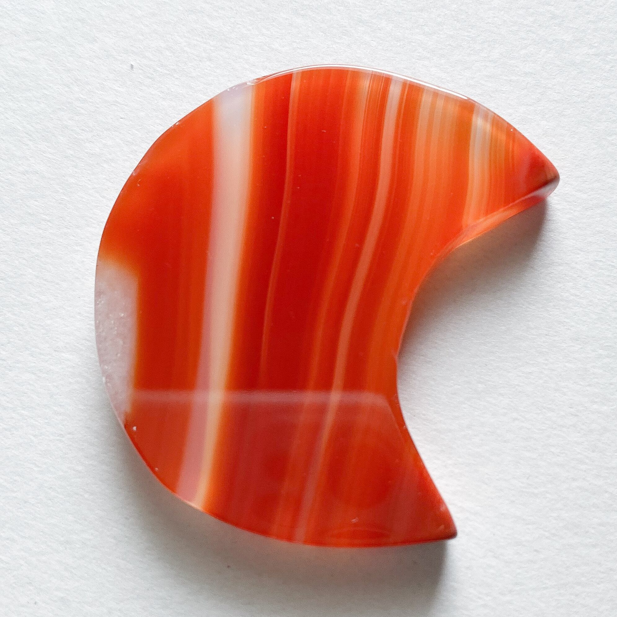 スターシェイプは五芒星のラインに合う角度のついた縞模様、ムーンシェイプは優しい直線のラインの端っこが結晶化しているカーネリアンです。