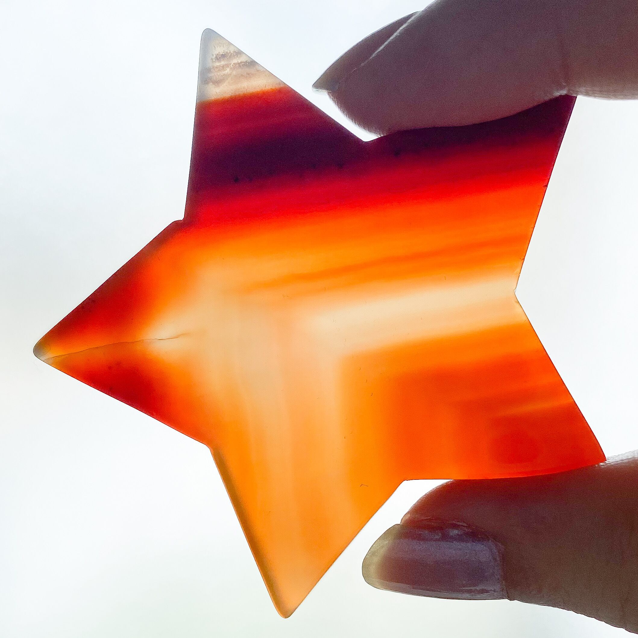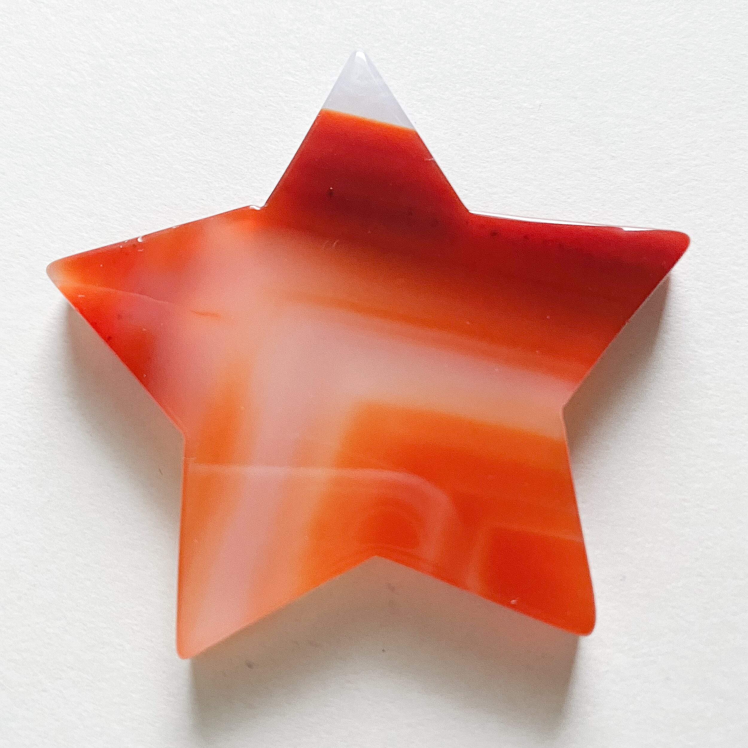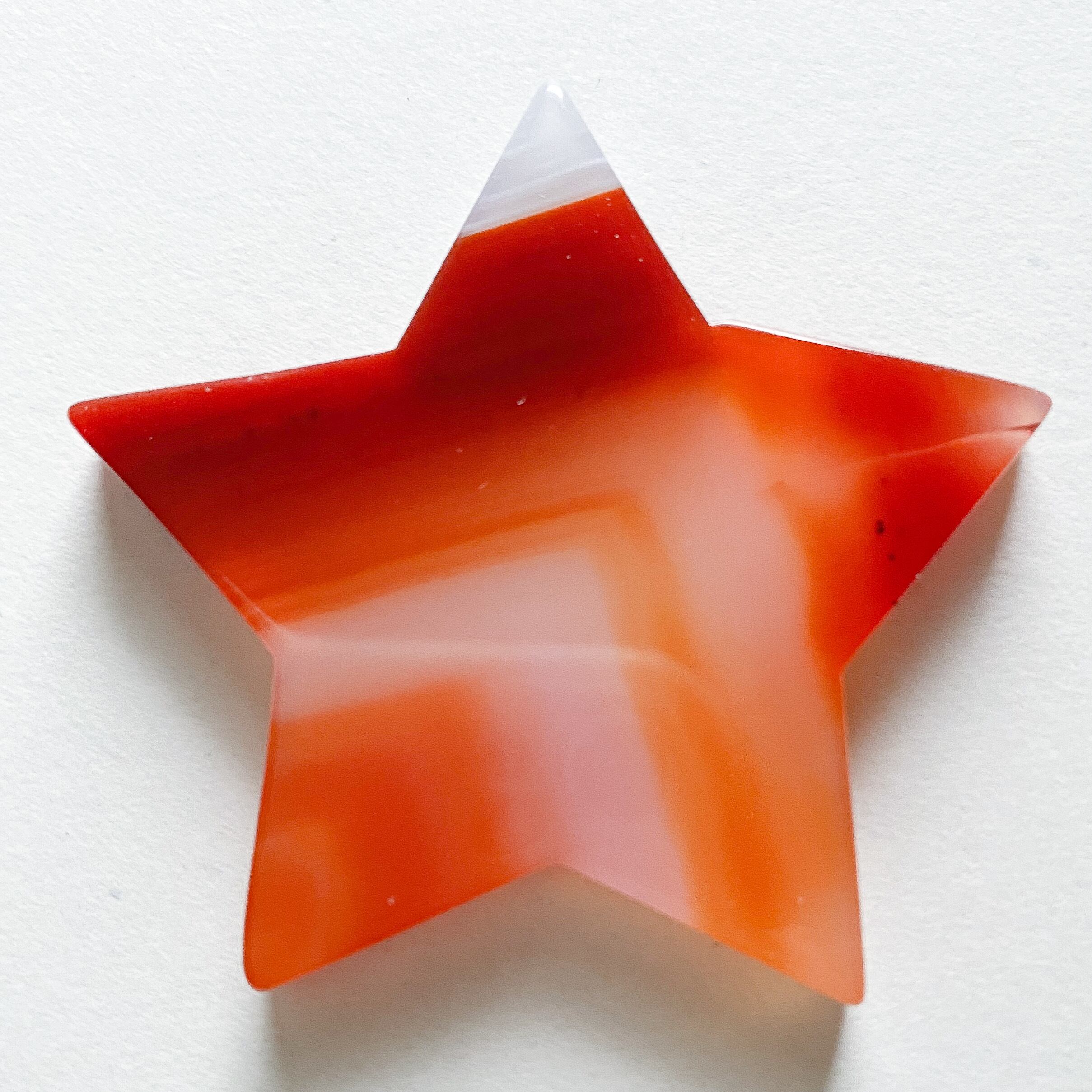 スターシェイプは五芒星のラインに合う角度のついた縞模様、ムーンシェイプは優しい直線のラインの端っこが結晶化しているカーネリアンです。