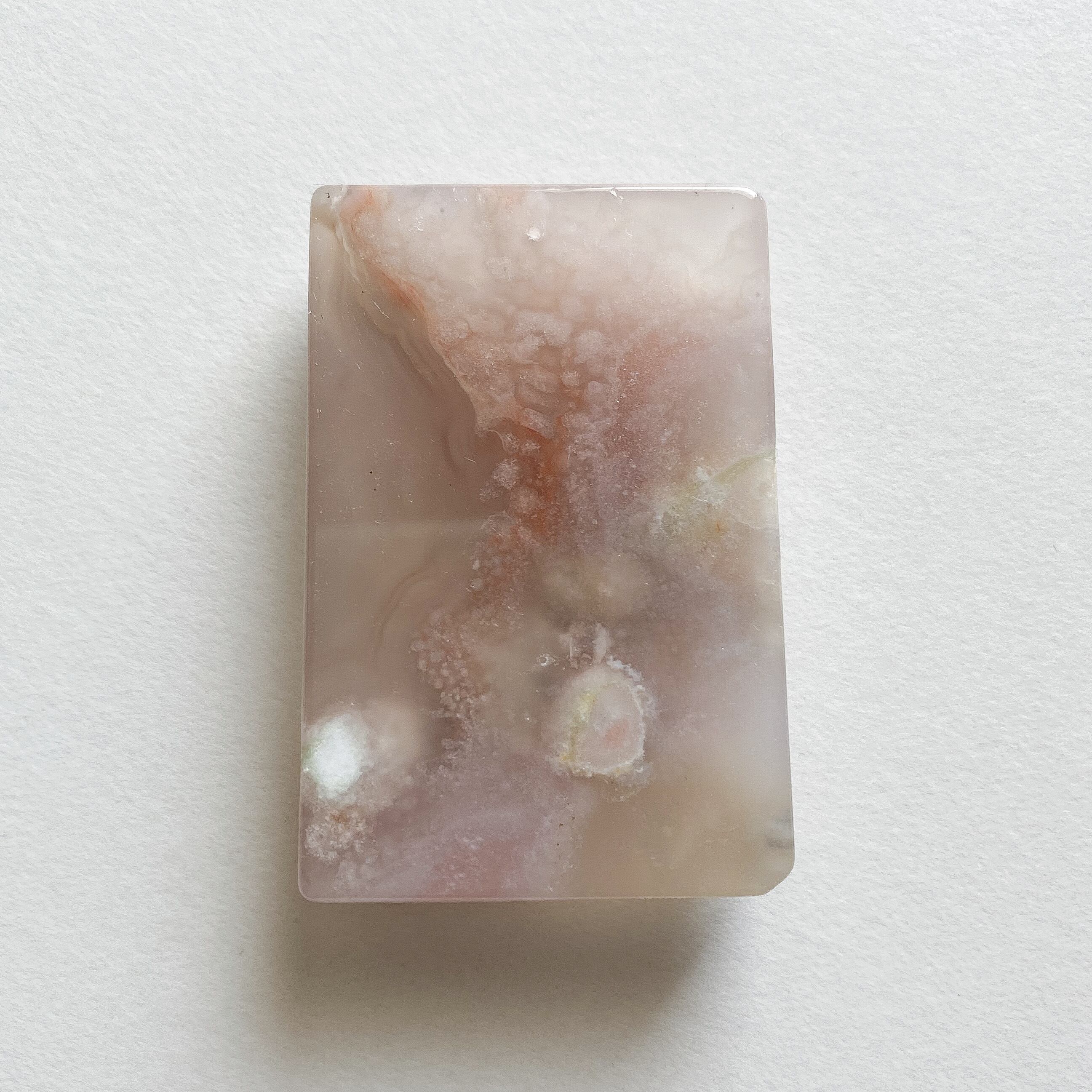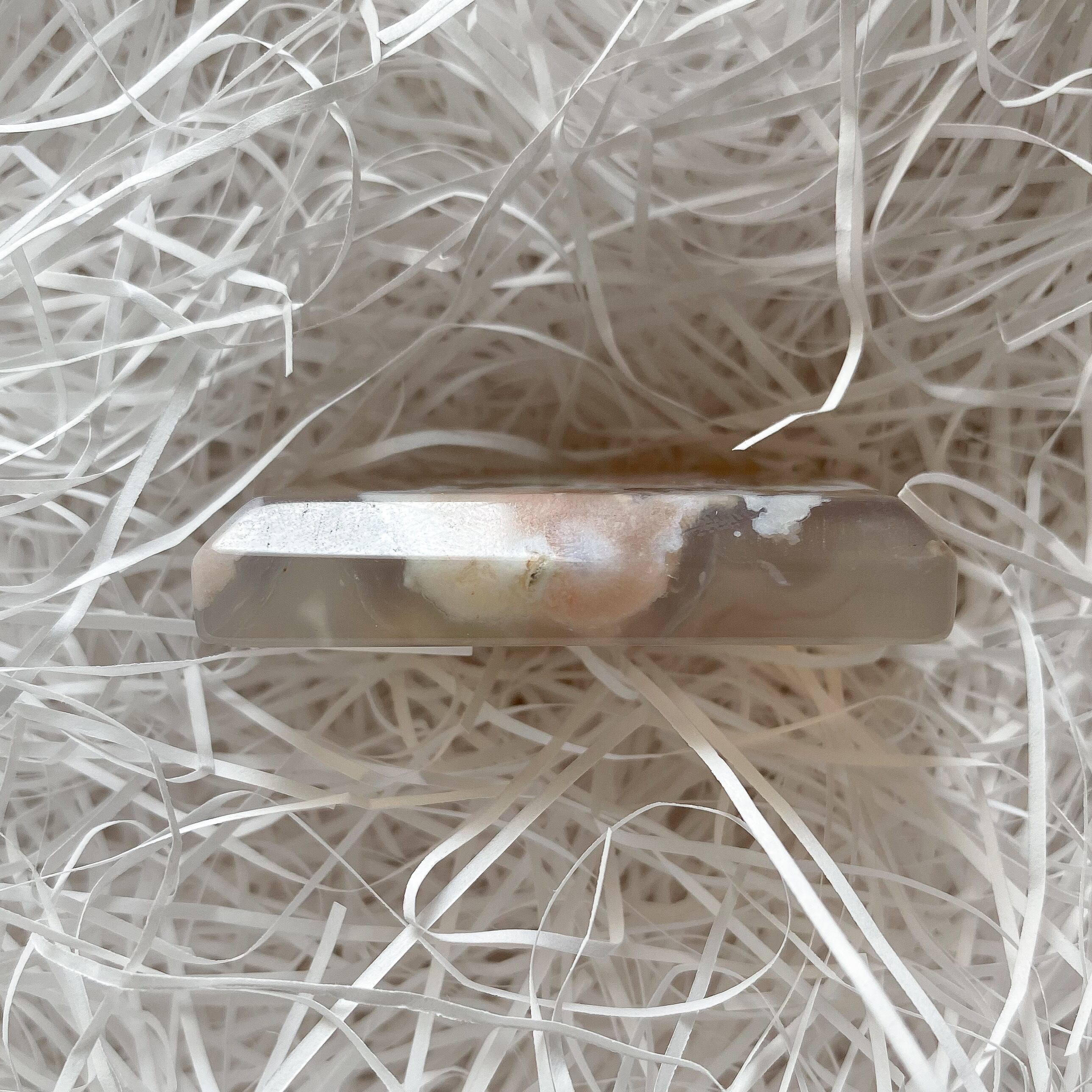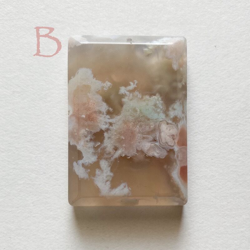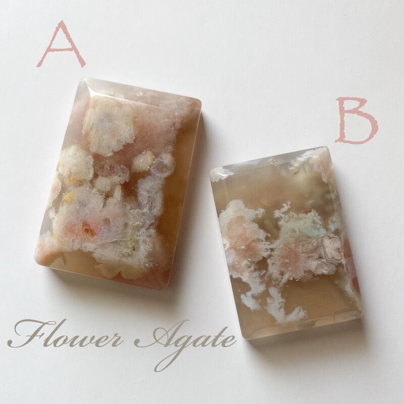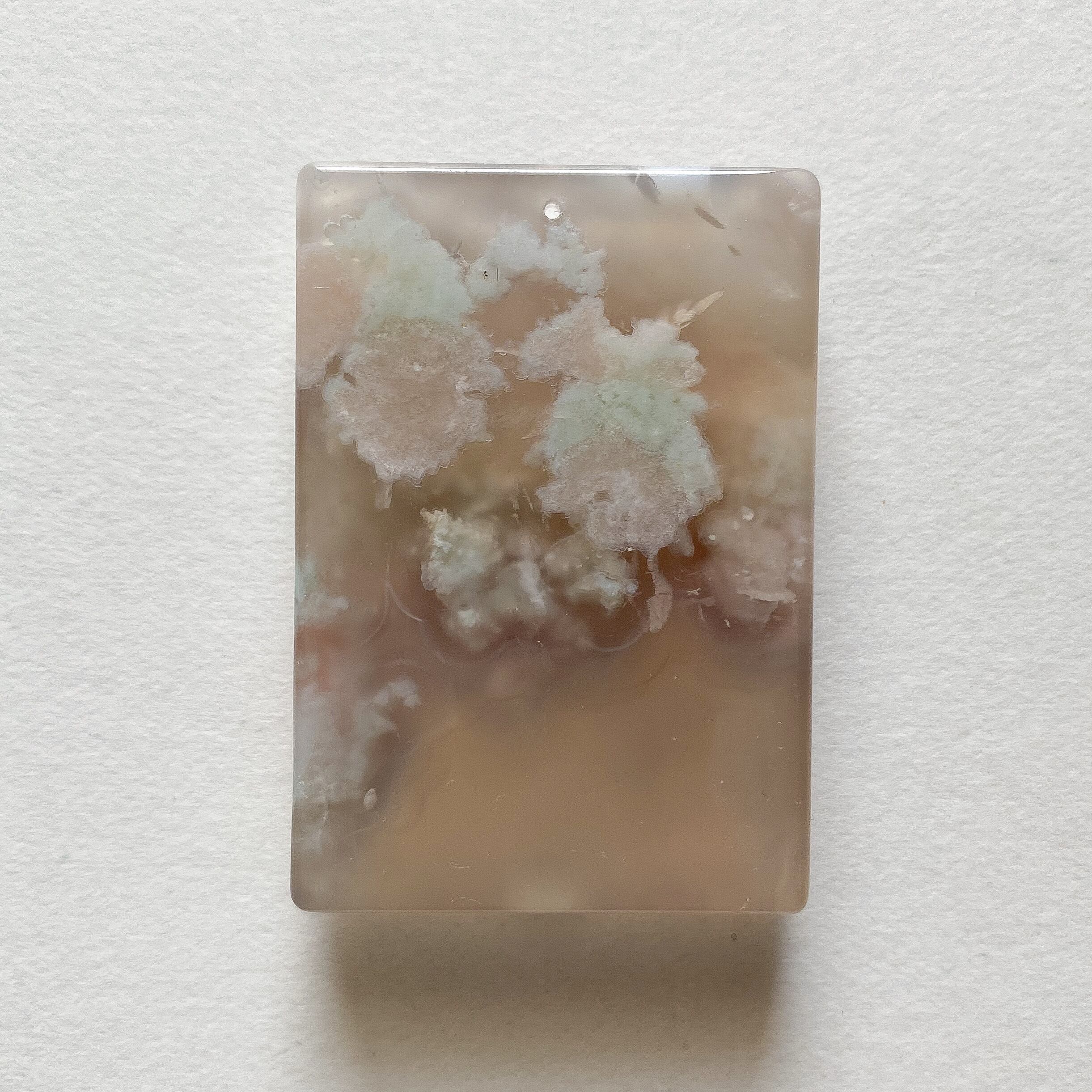 フラワーアゲート(チェリーブロッサムアゲート)のスクエアカットプレートです。2つは別売りです。トップ穴が開いていますのでペンダントトップやチャーム等に加工して頂けます。どちらもベージュ〜ピンクのニュアンスカラーで花の部分はピンク色です。柄の出方が個人的に華やかで綺麗だと思うものを選びました。