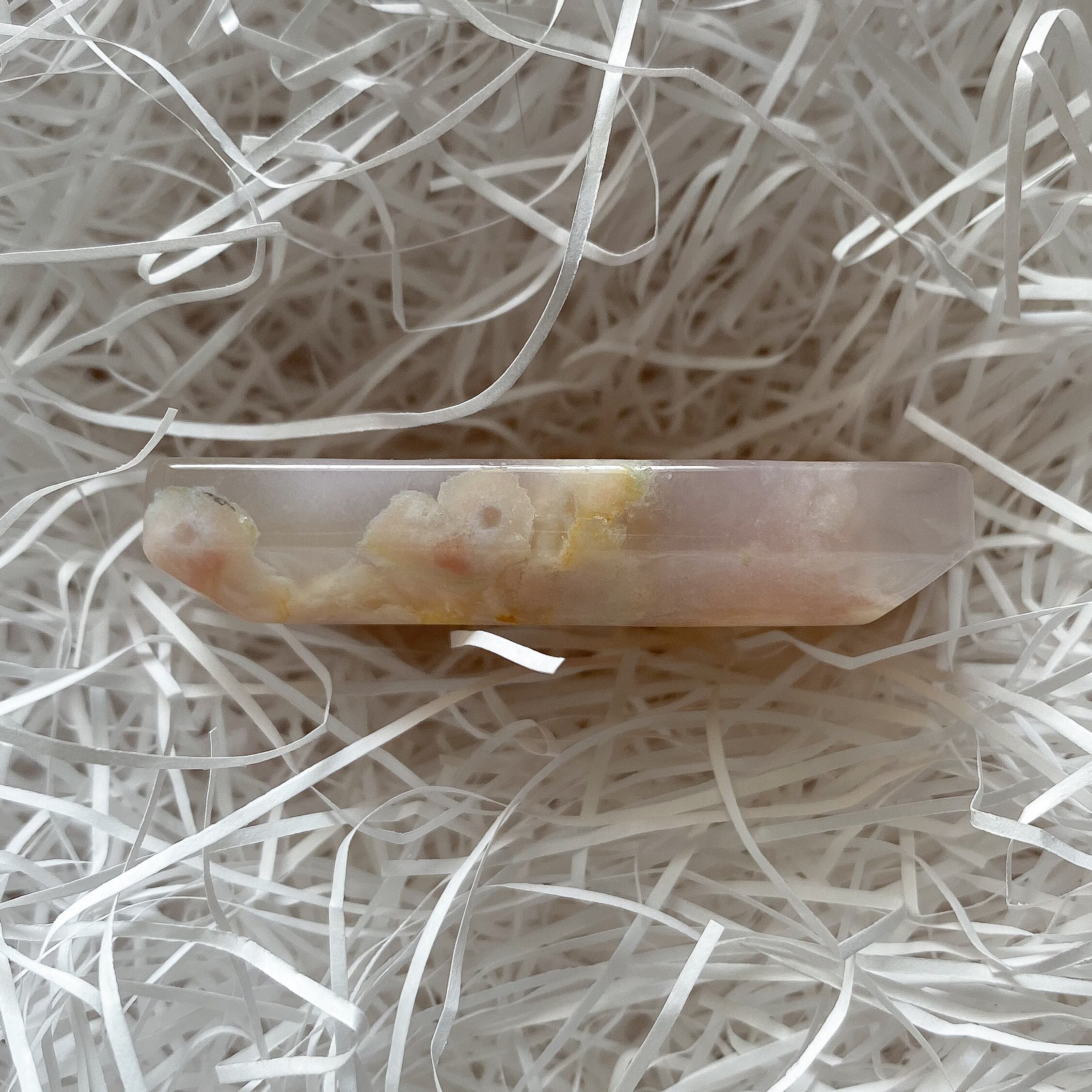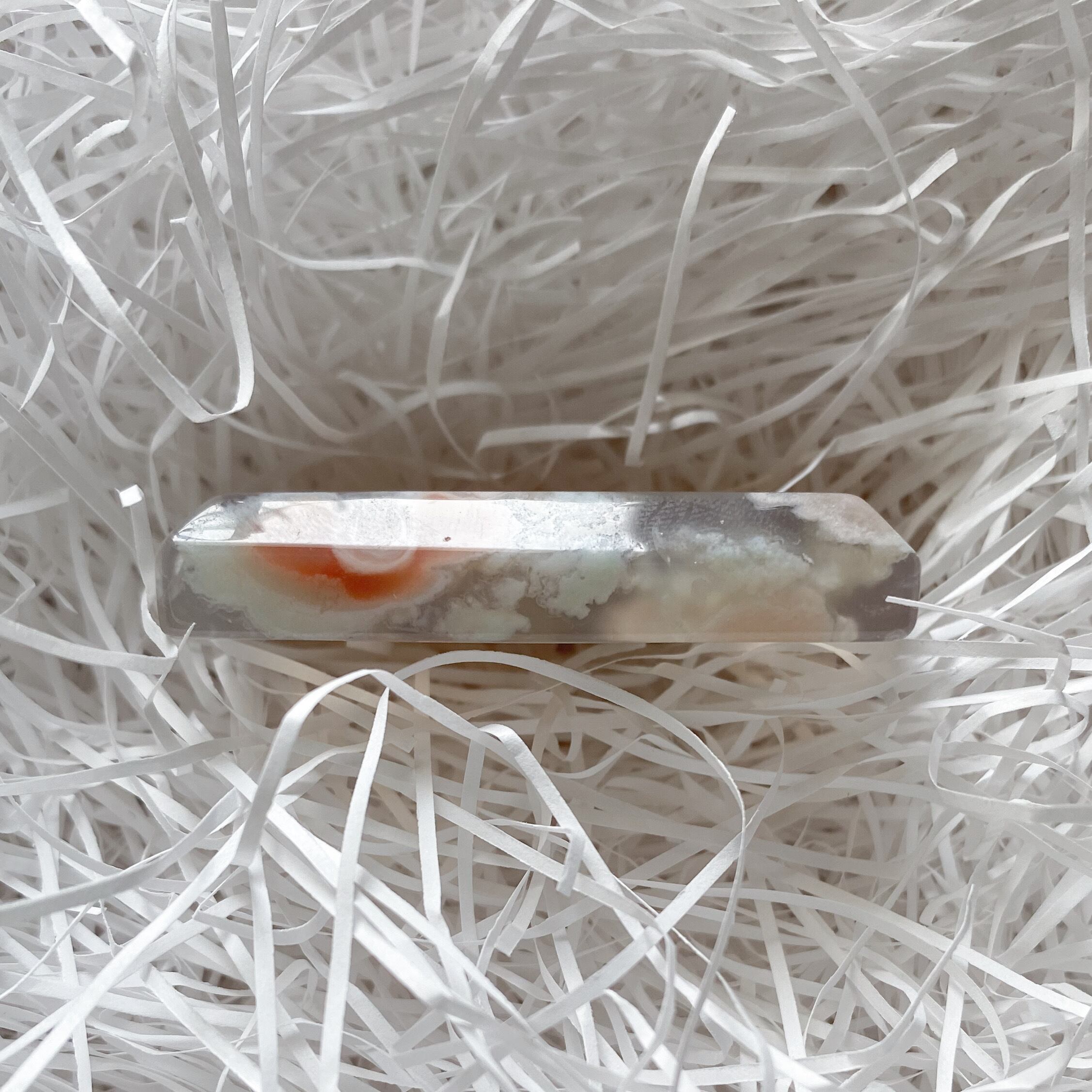 柔らかな色と花模様の可愛らしさだけではなく組み合わせによって様々な美しいタイプが存在しますが、その模様の複雑さから再度似た模様や同じようなものを探すのが非常に困難な石で、一期一会の出会いになることがとても多いです。