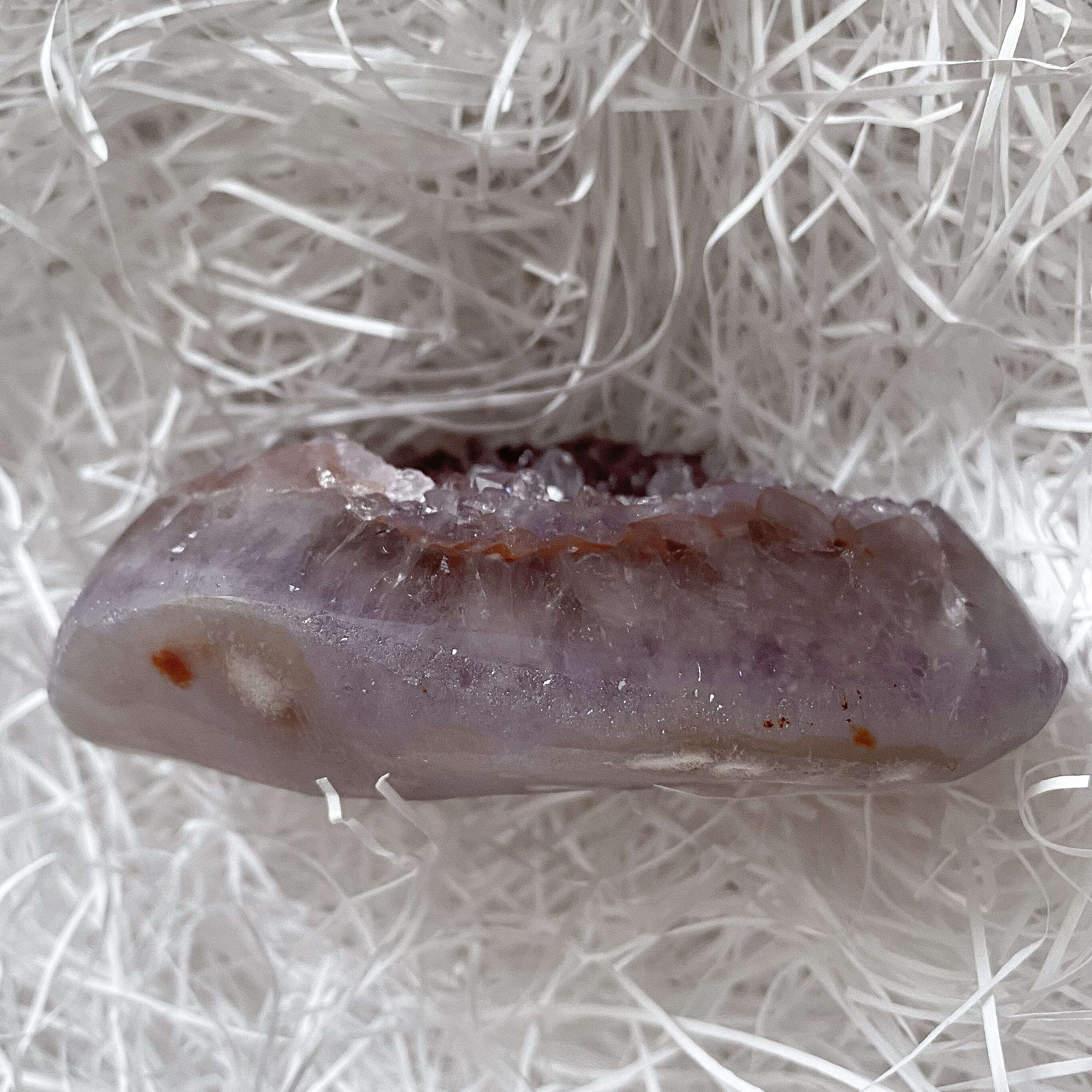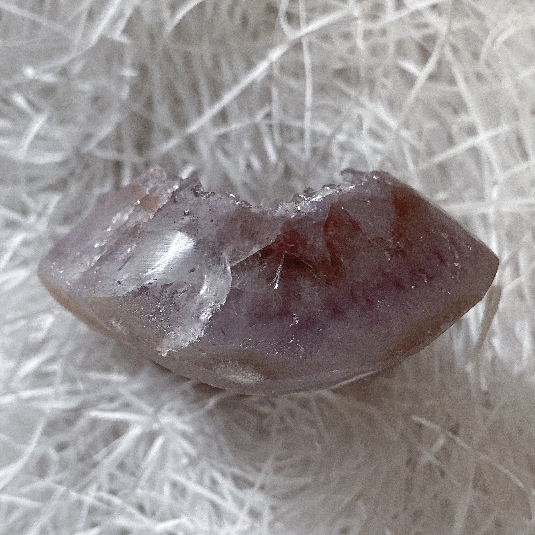 拡大して見てみますとアメジストクラスターが一度レッドファントムになり、その上から淡いカラーのアメジストが再結晶しているので間のレッドカラーがアメジストから透けて見えて赤みがかって見えているようです。