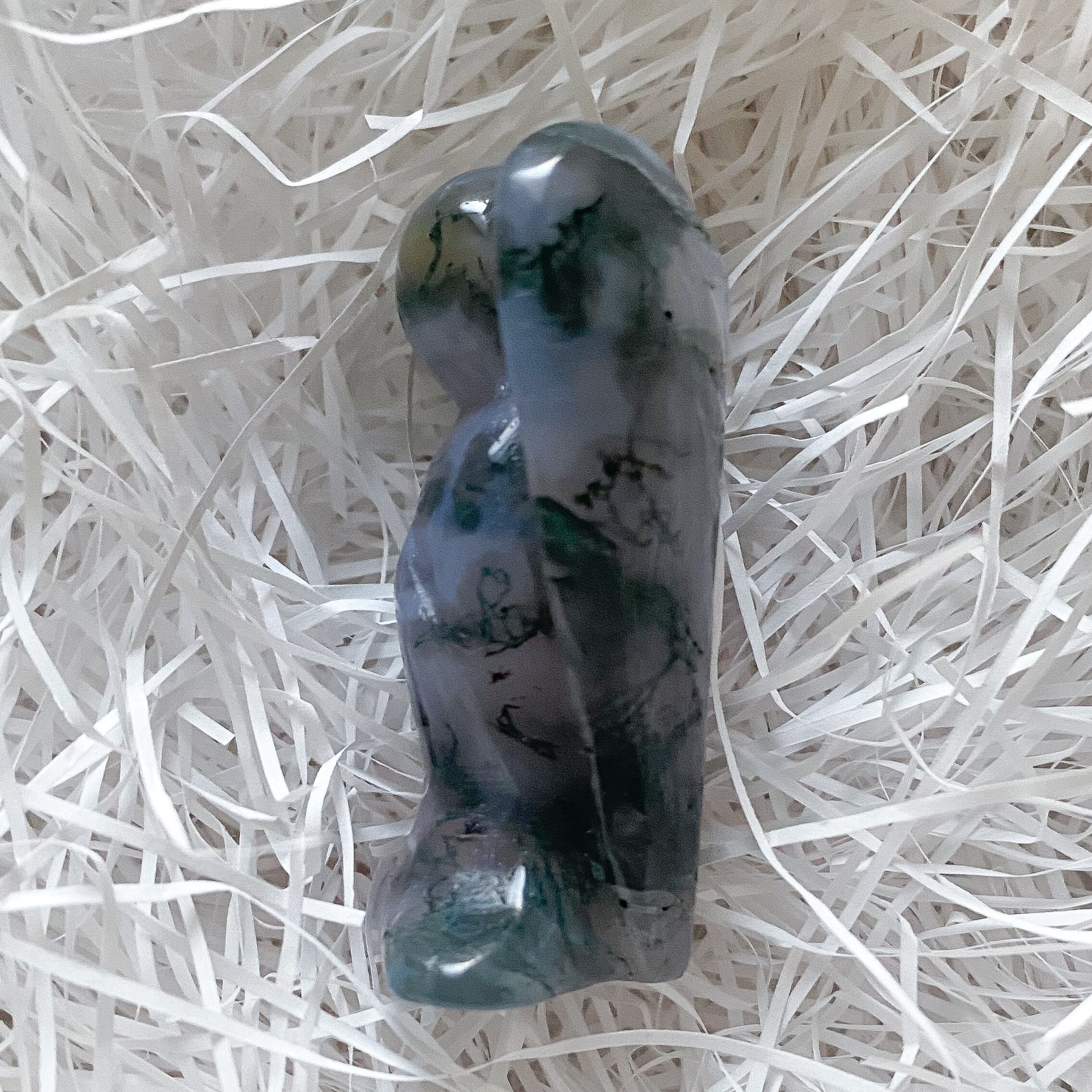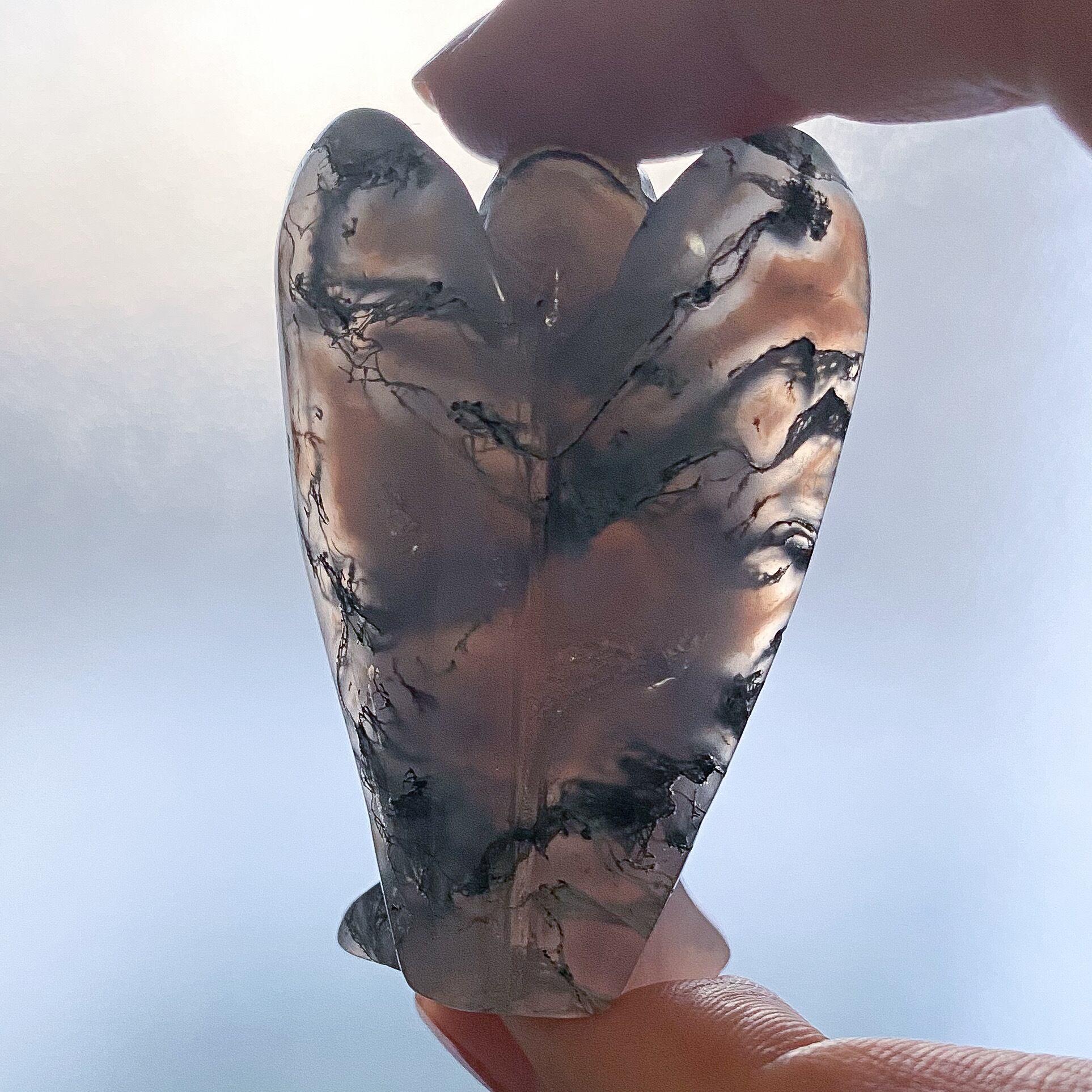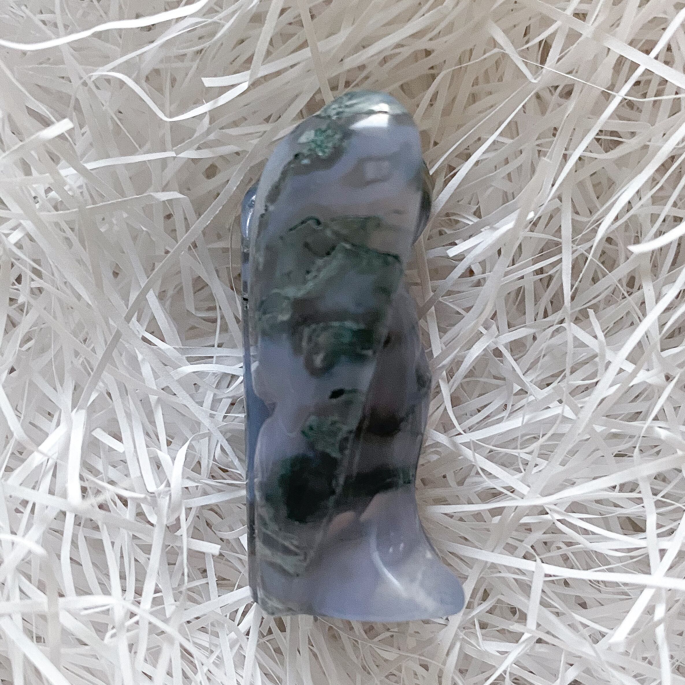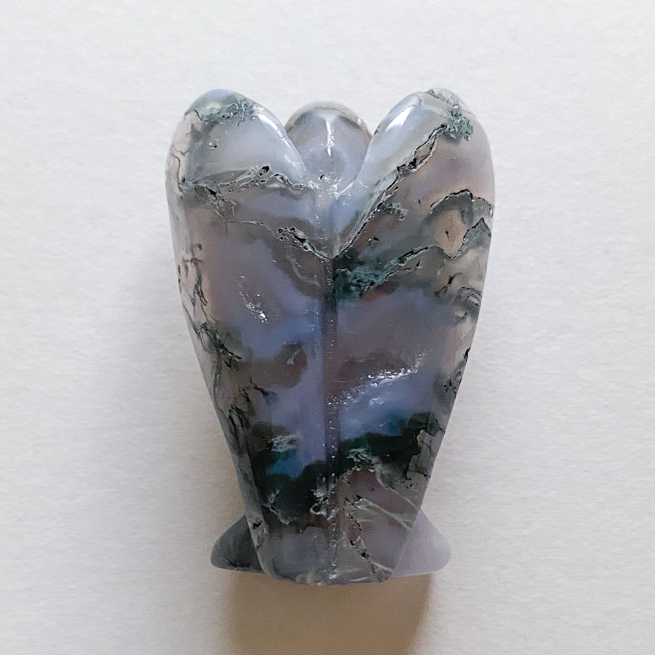翼には両翼に小さなジオードがありキラキラと輝きます。ブルーの瑪瑙が入るモスアゲートは珍しく、光に透かすと神秘的な色合いです。癒しだけではなく翼の部分でパワーチャージもしてくれそうです。
