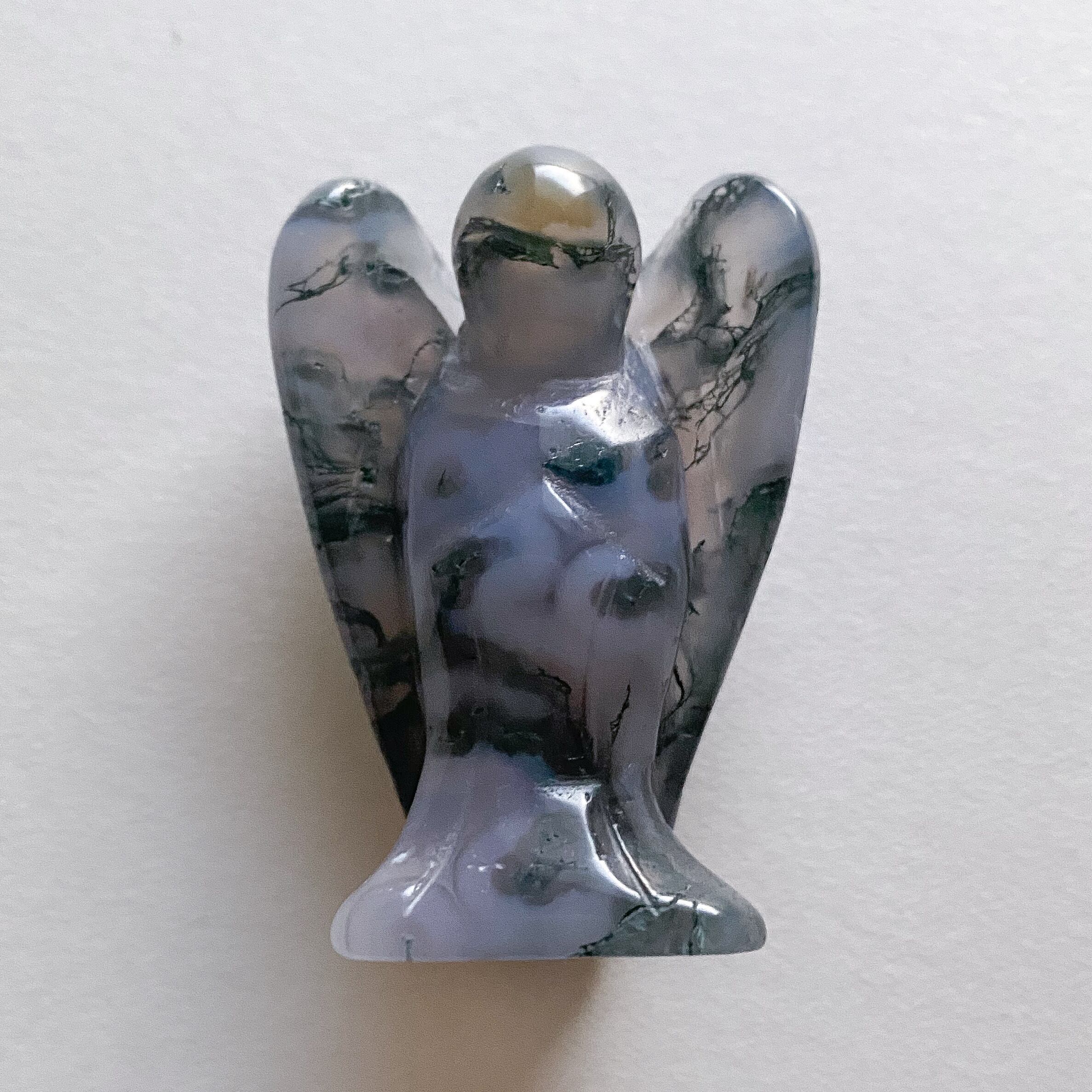 高品質のモスアゲートでクリア、淡いブルー、クローライトのグリーンがゼブラ柄のように入り混じっている天使さんです。