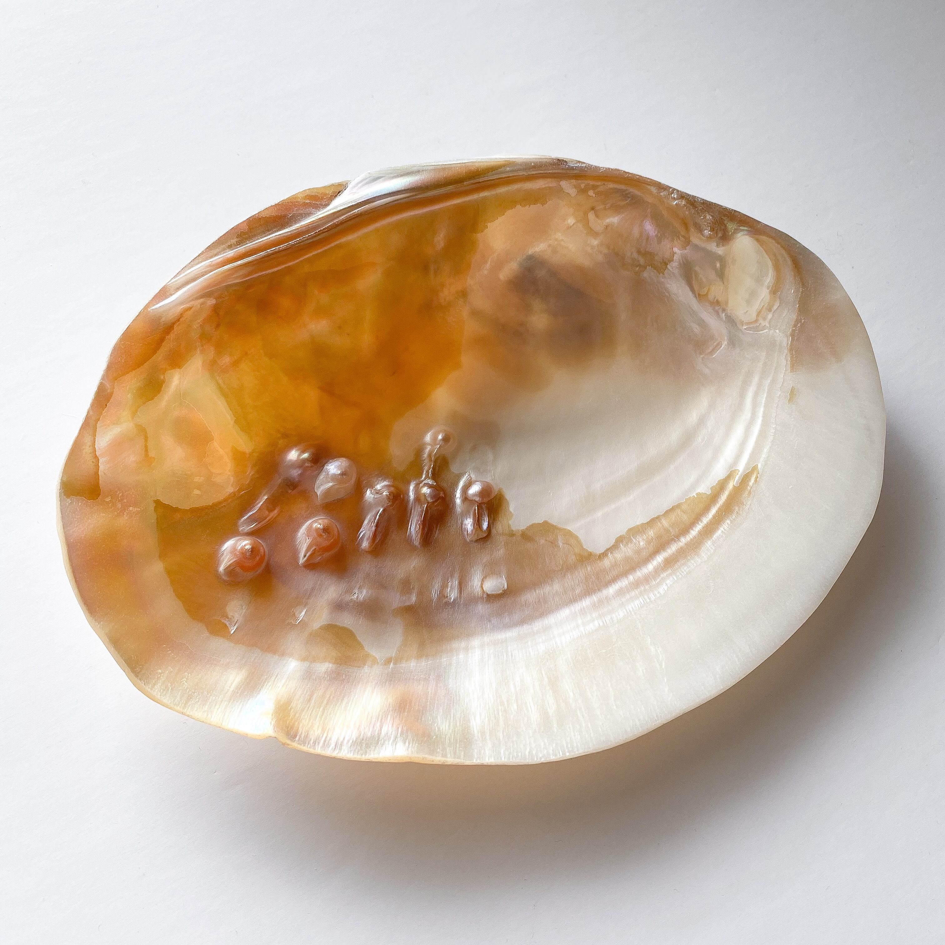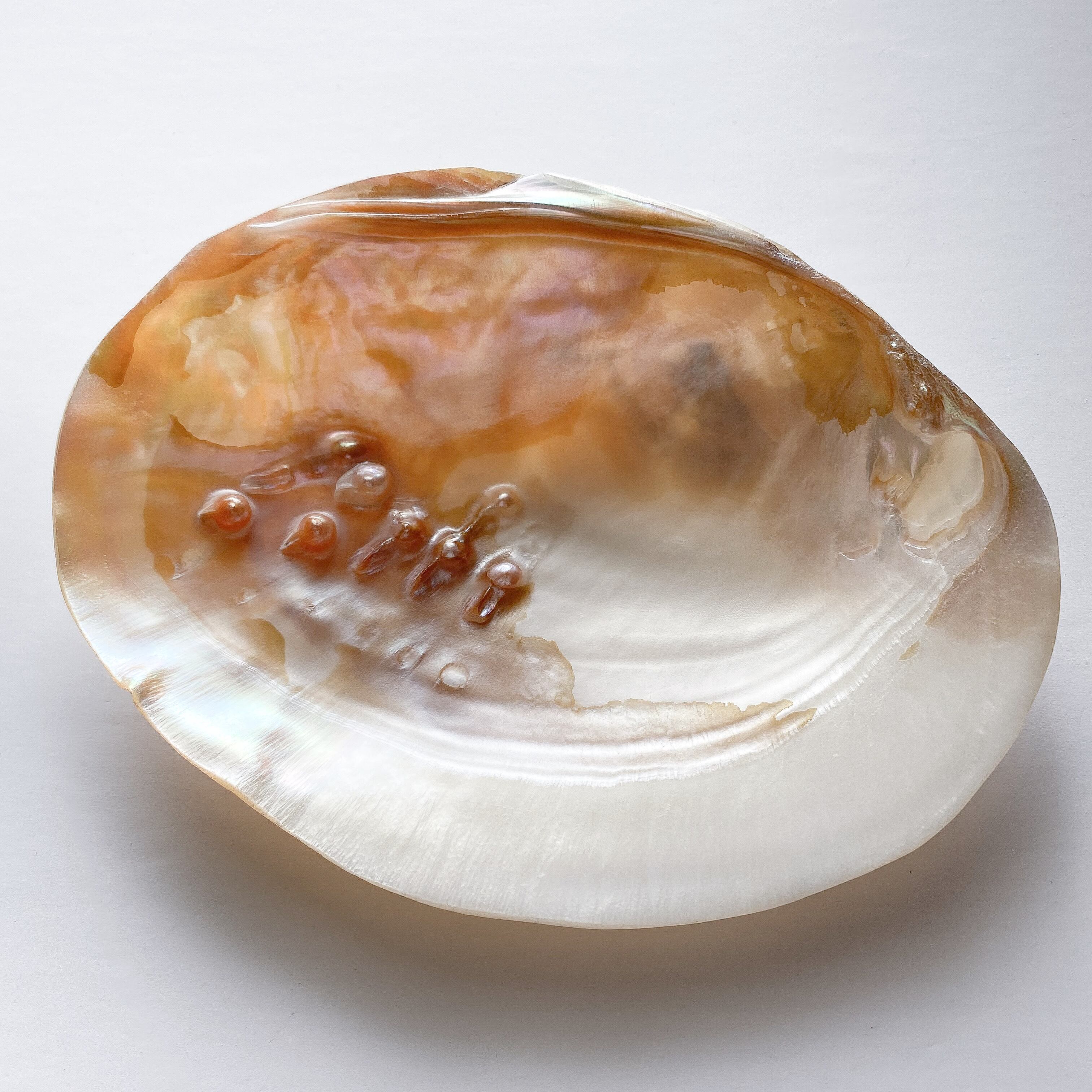 ベースカラーはホワイト〜淡いベージュで真珠の母貝ですので虹色の真珠光沢があります。