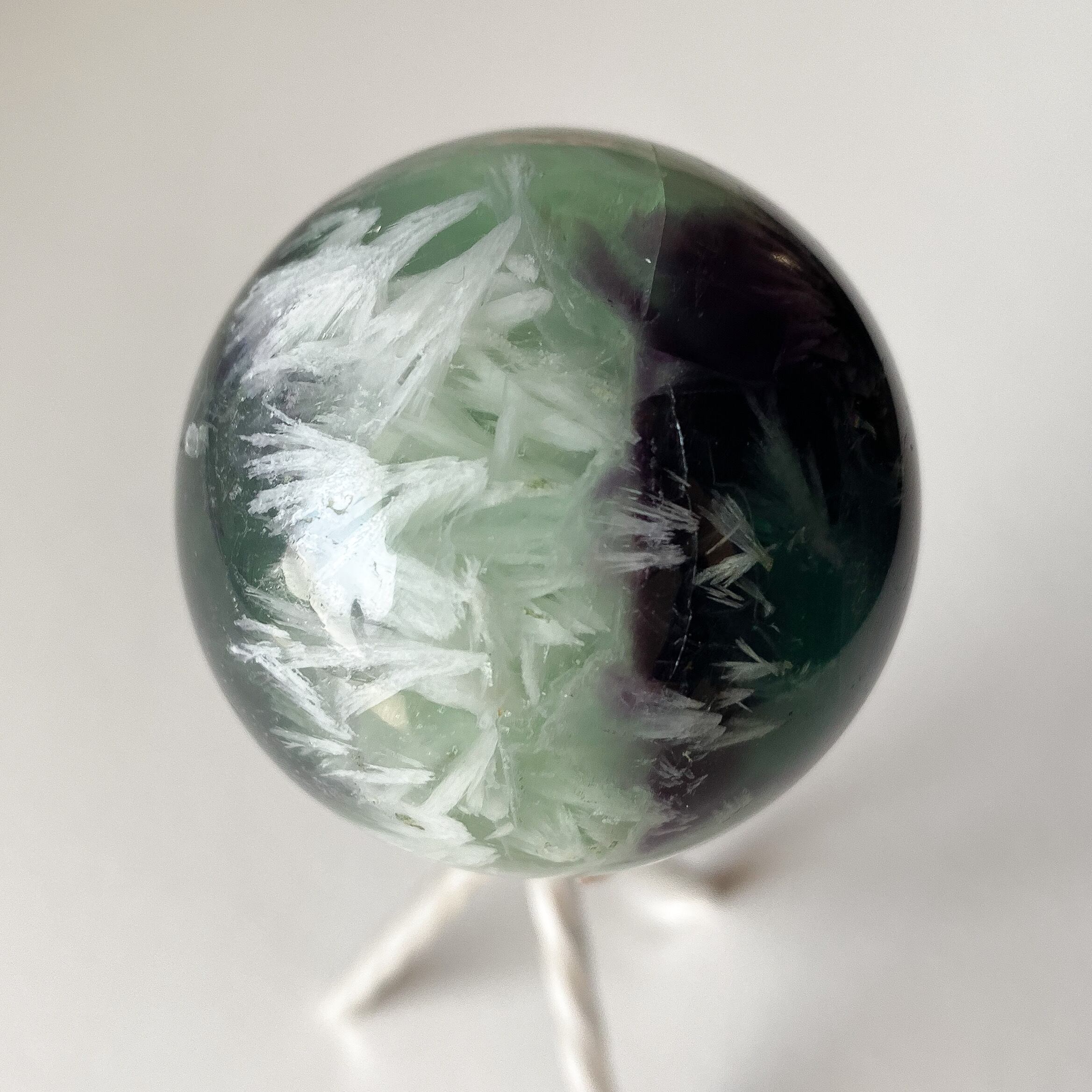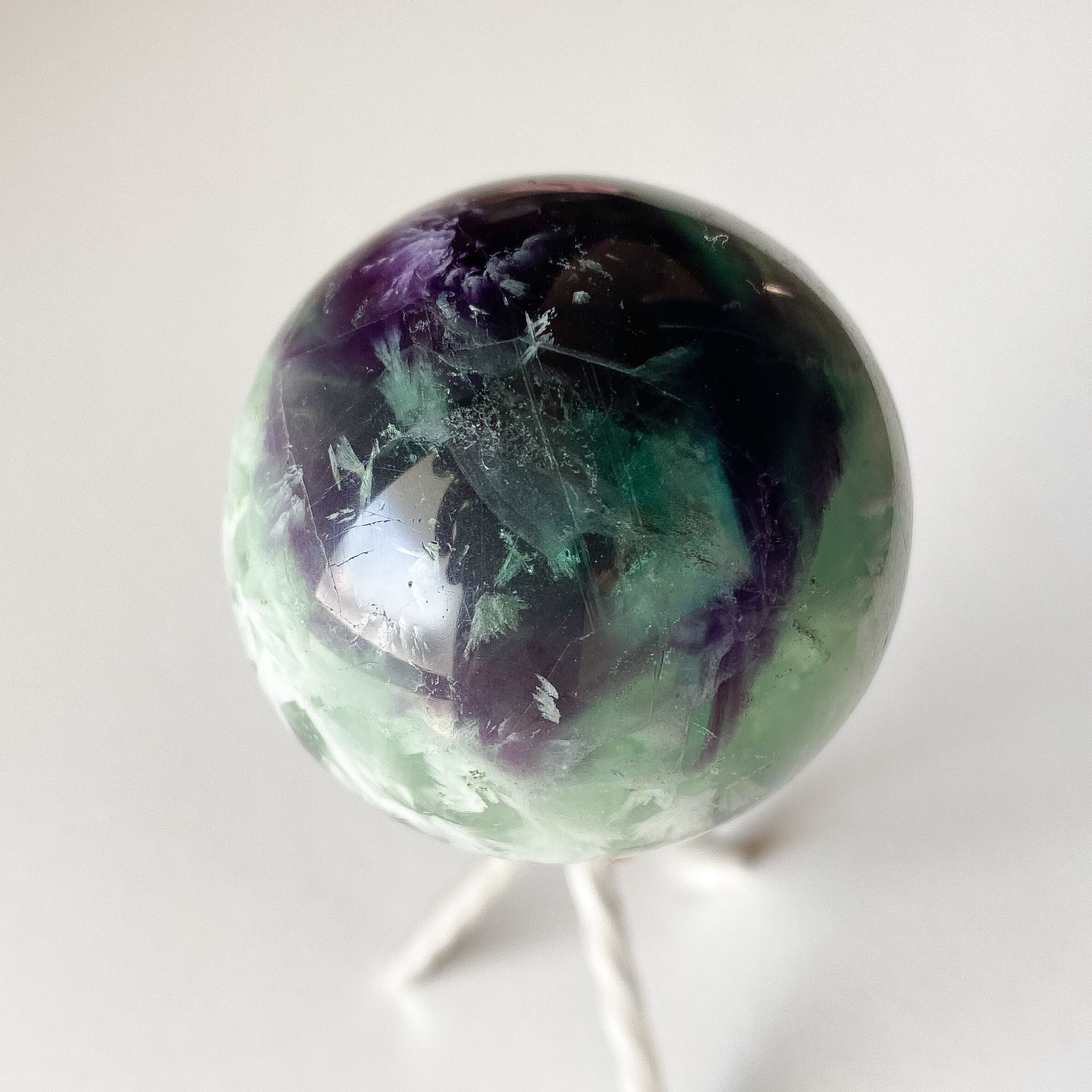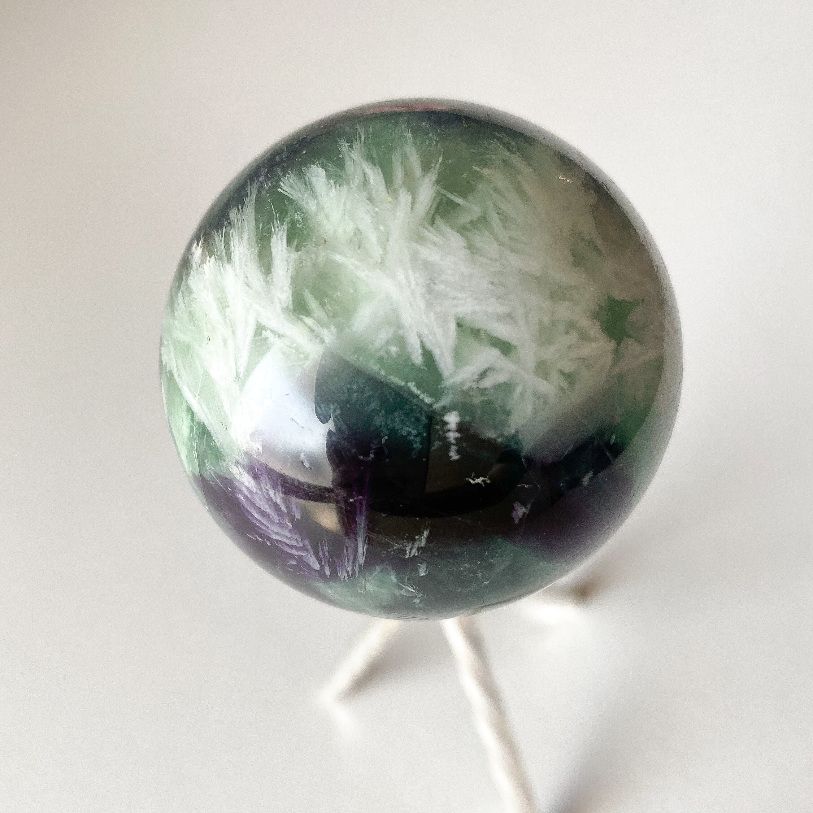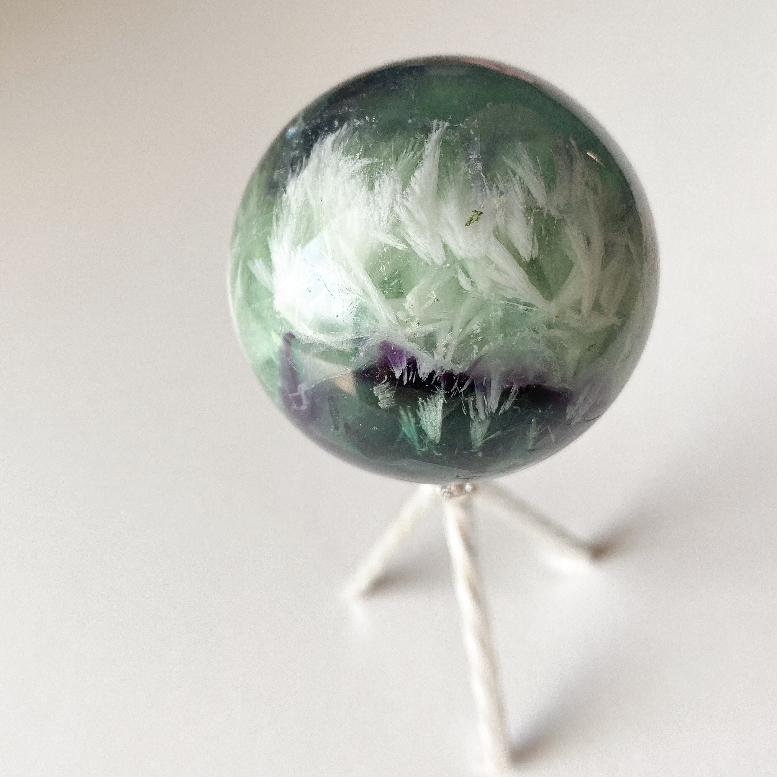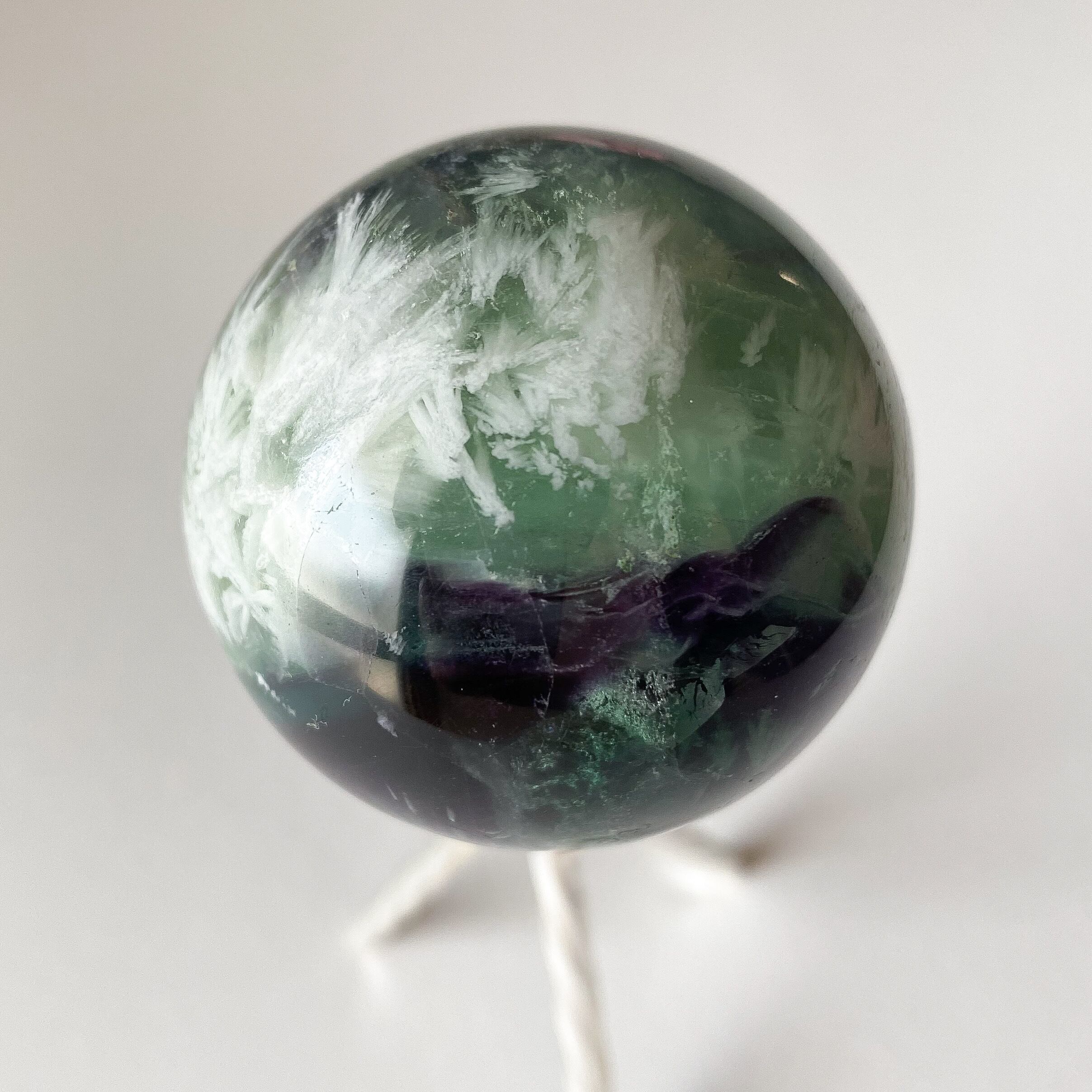 グリーンと深い紫の地色に白のフェザーがぎゅっと詰まったフローライトのスフィアです。