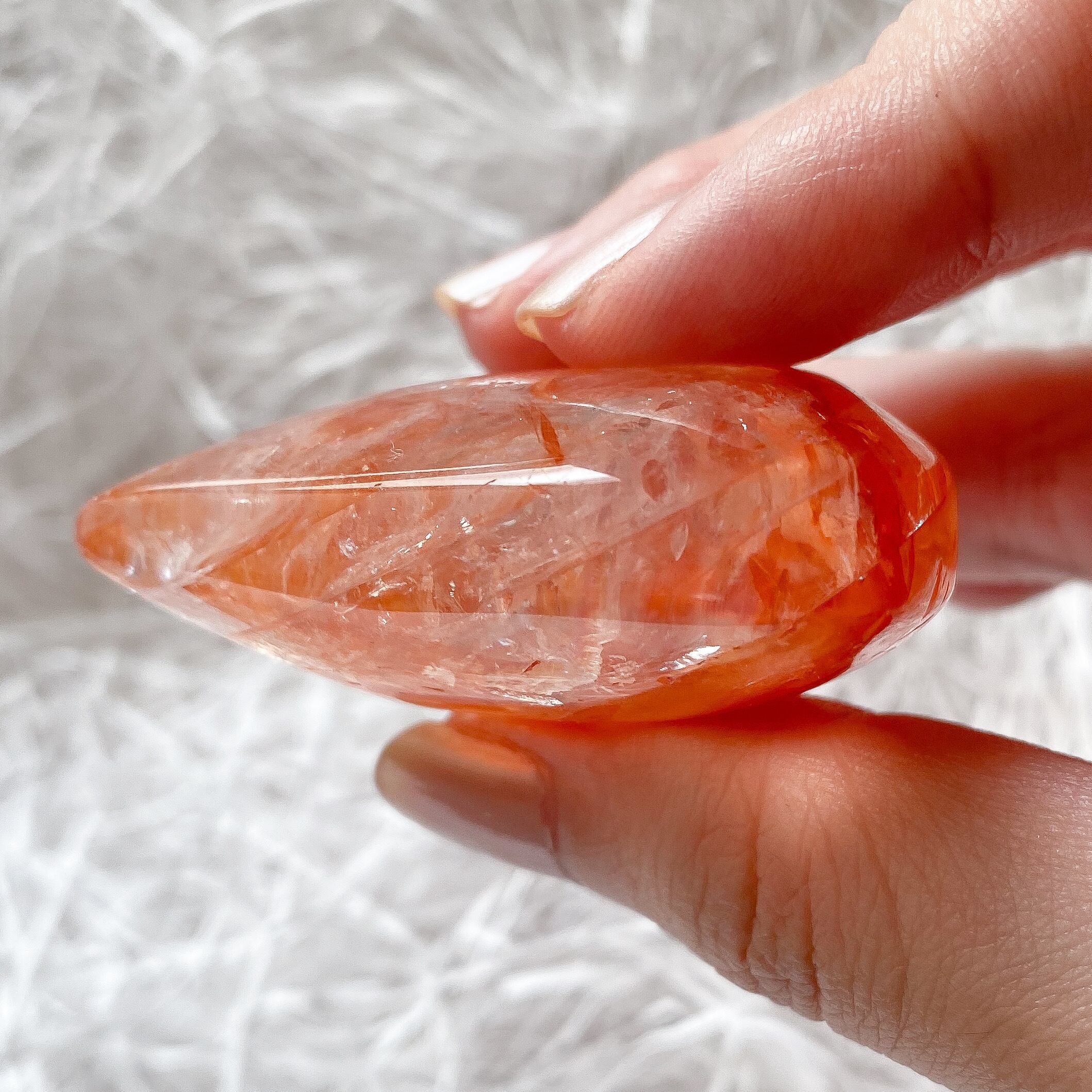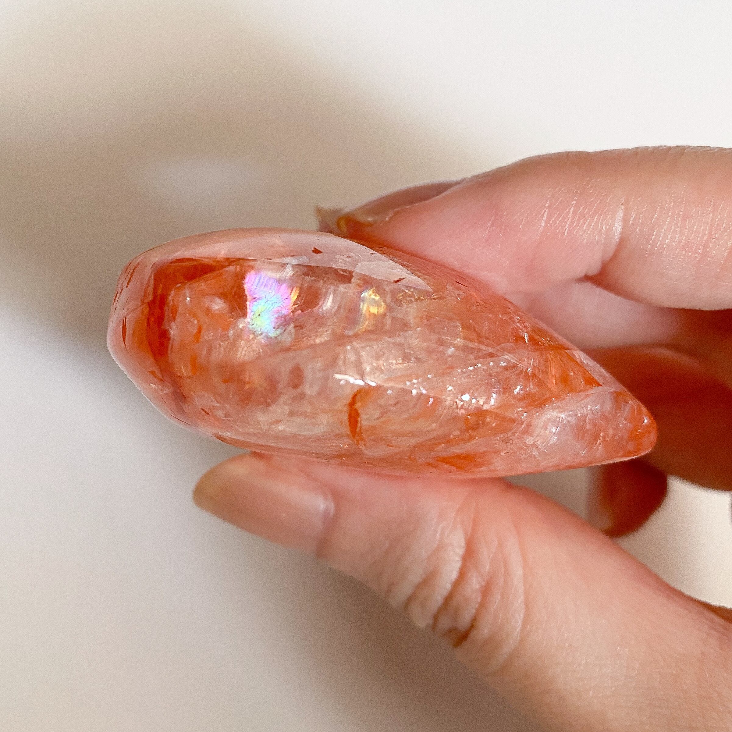 色が濃く鮮やかです。メインはレッドカラーですが地の水晶部分も透明度が高いので内部の煌めきや虹なども、太陽光や室内光のみで観察出来ます。別名ファイヤークォーツとも呼ばれていますが真っ赤なヘマタイトの層が正に炎の片鱗のようです。