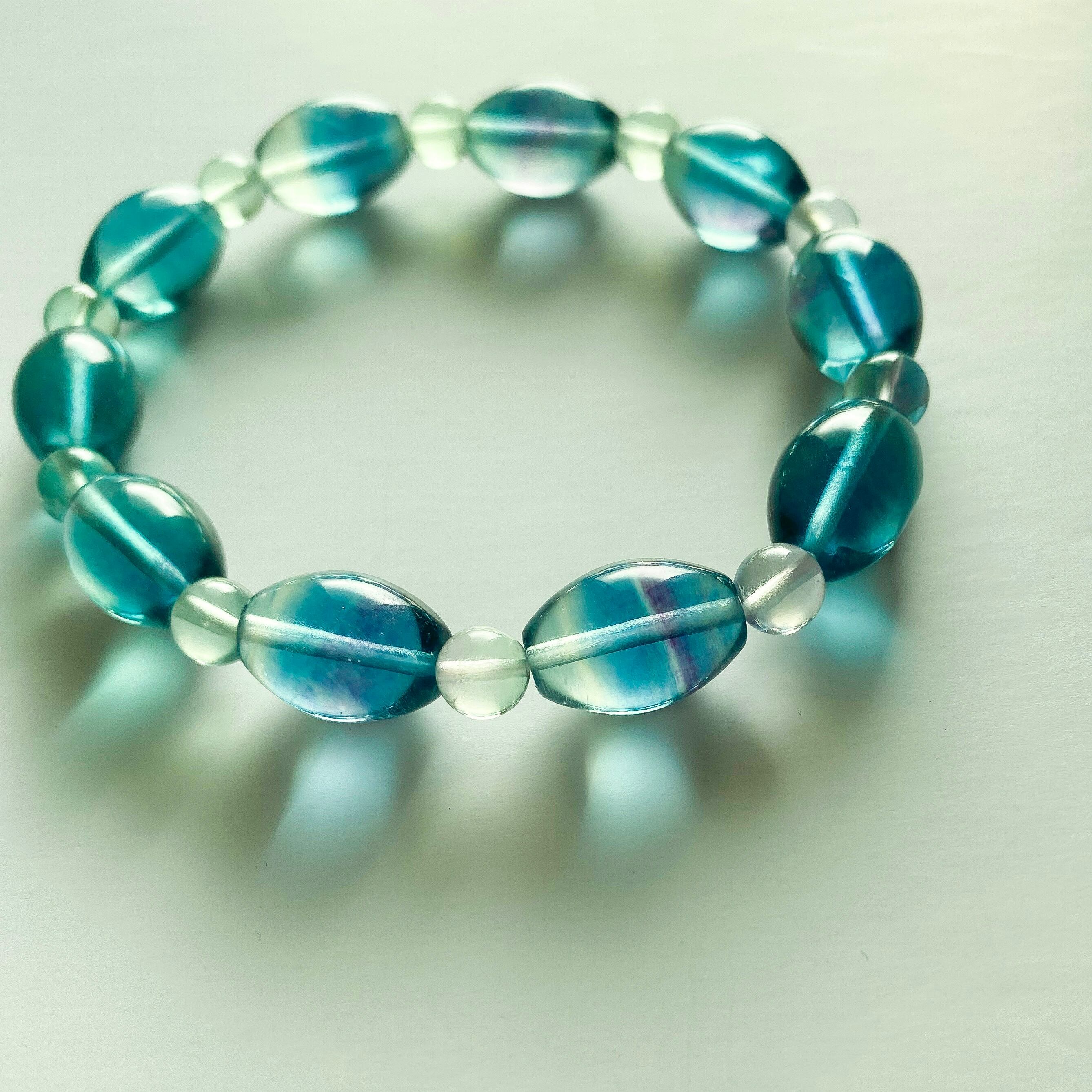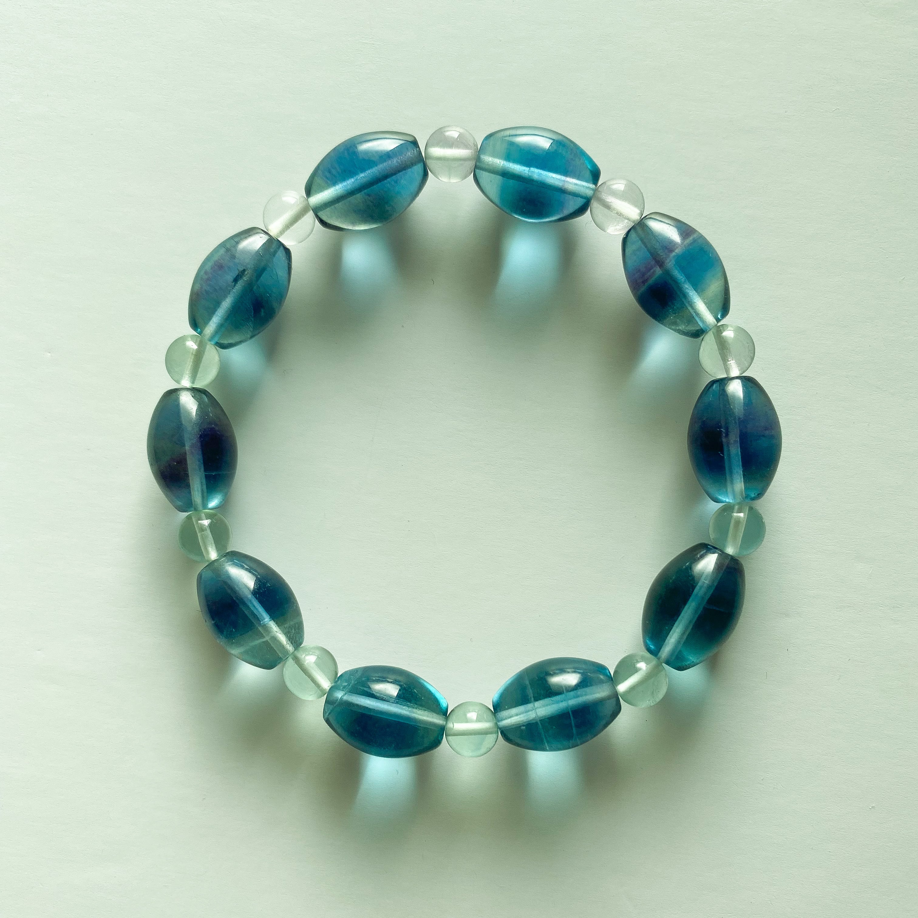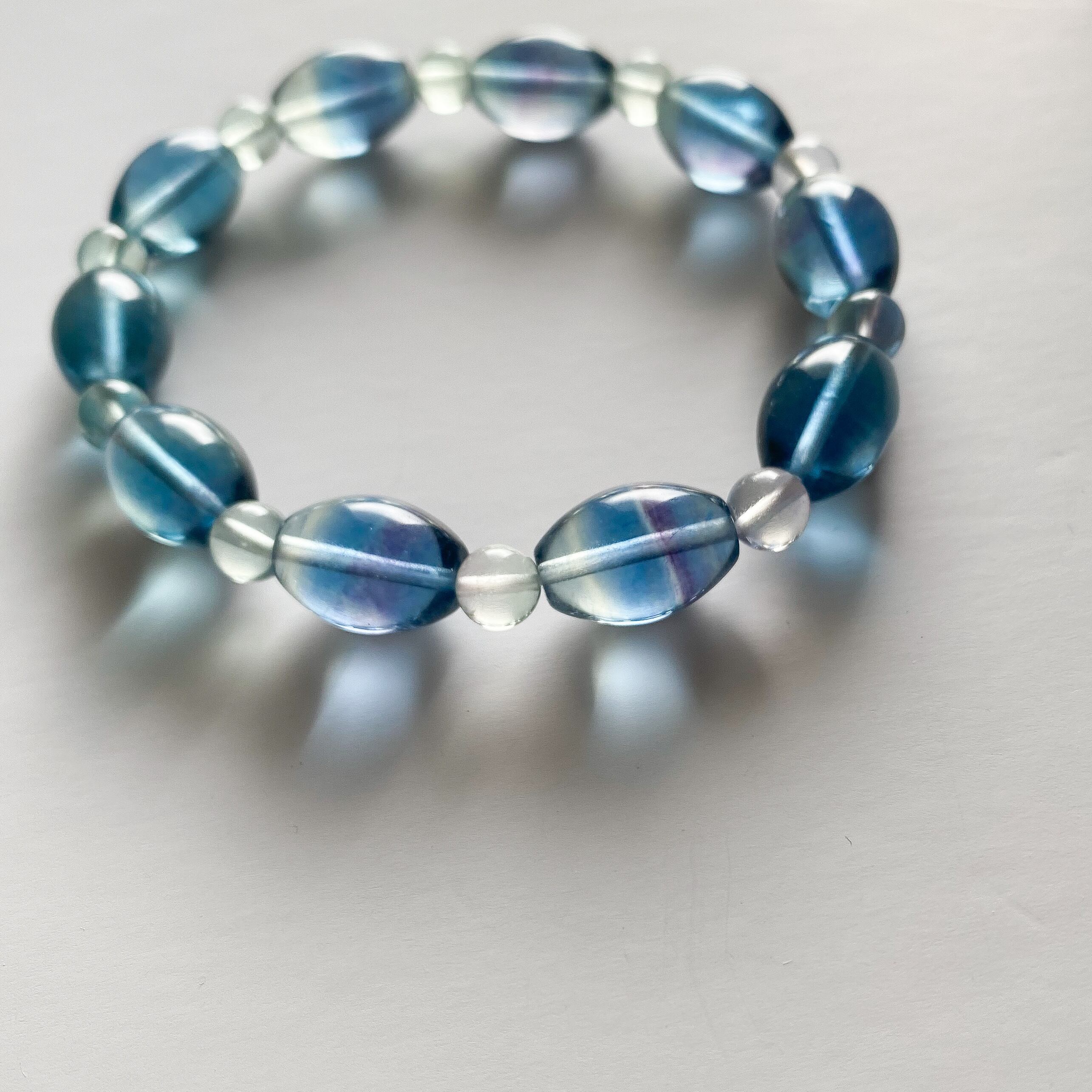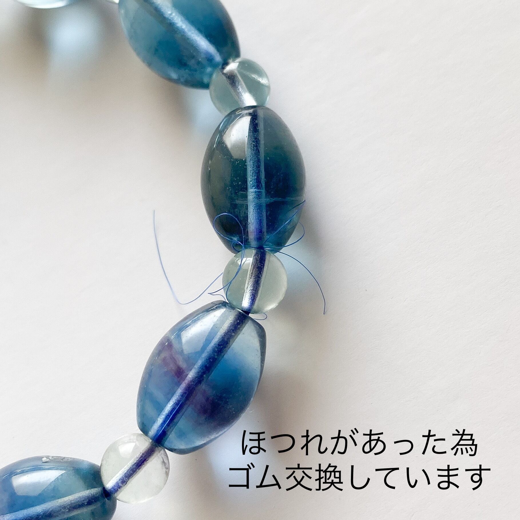 透明度の高いブルーフローライトのブレスレットです。間に入っている小粒の丸玉もフローライトになります。