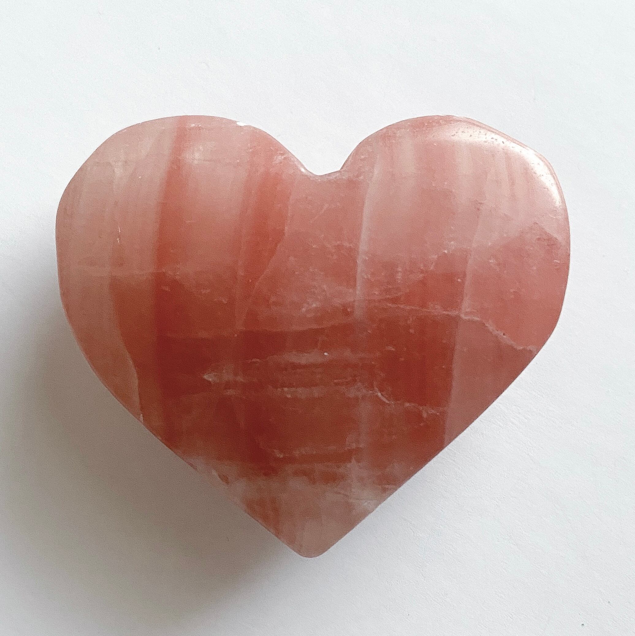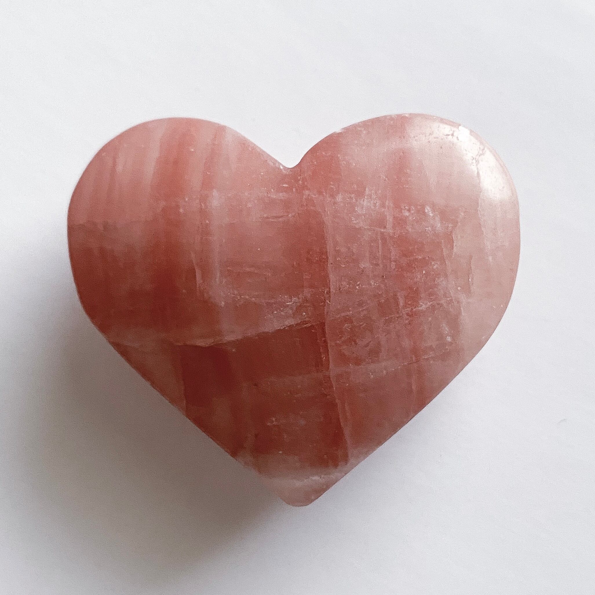 地色が明るいローズピンク色のカルサイトです。縦横に走る線がチェック柄のようにも見えます。よく見ると地色に縞模様が入り濃淡を作っており、光に透かすとカルサイトの縞模様がうっすらと浮かび上がります。