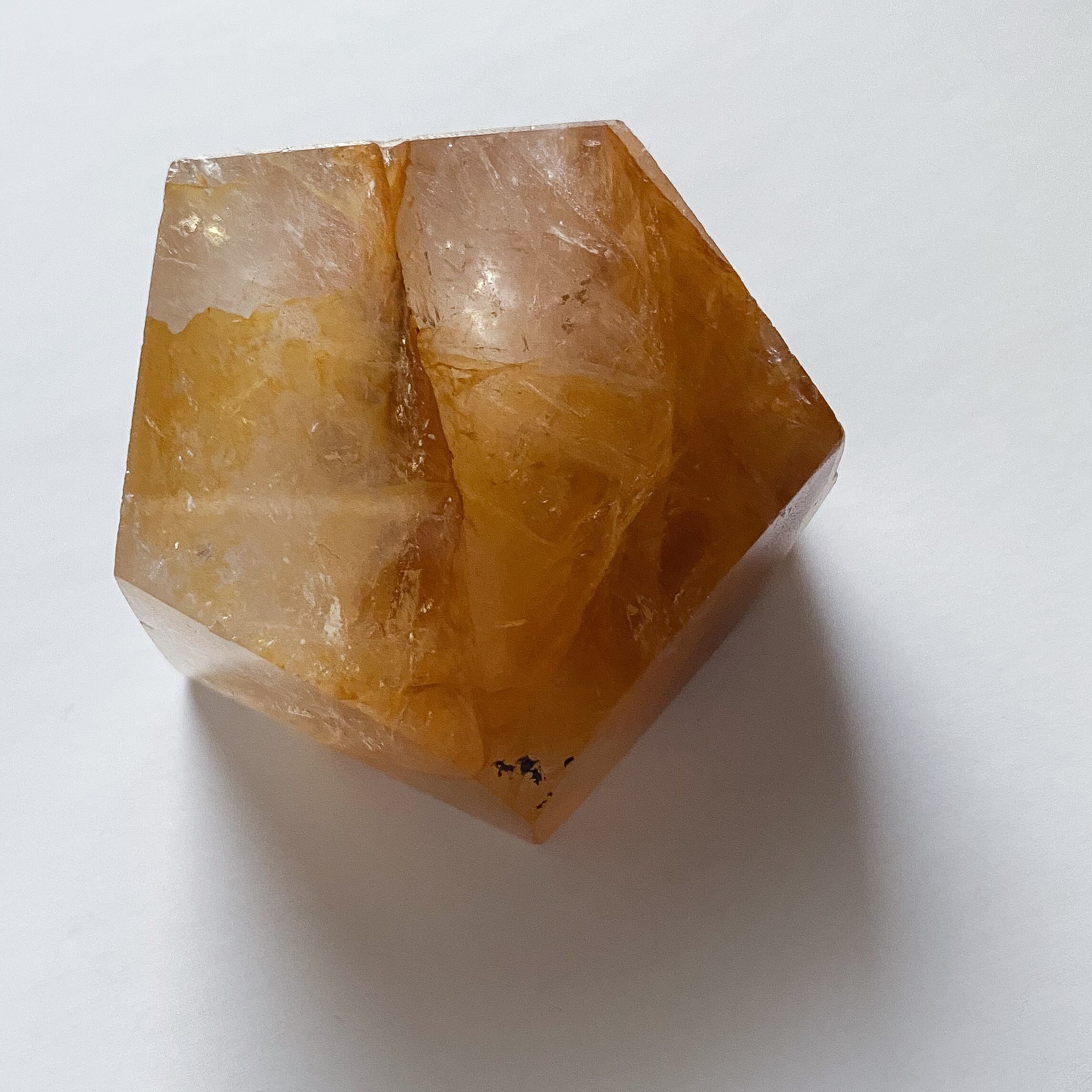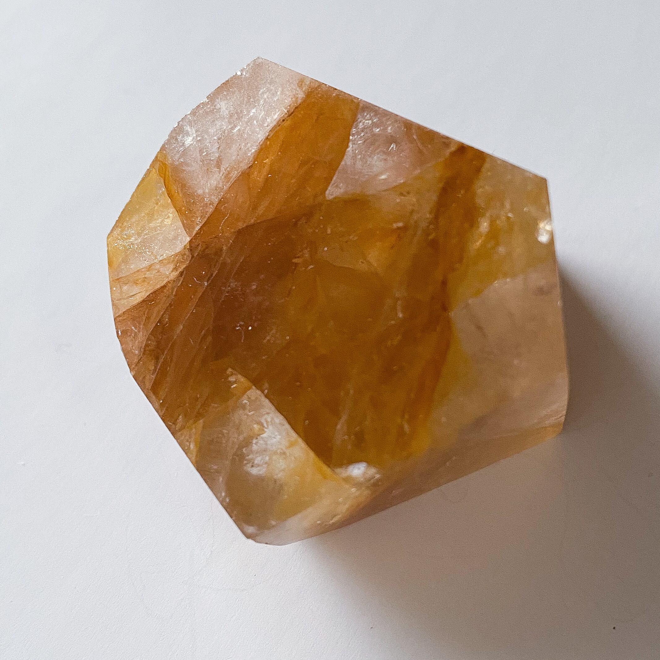 欝金色のゴールデンヒーラー、フリーフォームです。コロンとした形のフリーフォームで様々な角度で見ることが出来ます。リモナイトの層が多く、全体的に水晶よりもリモナイトの雰囲気が勝っています。