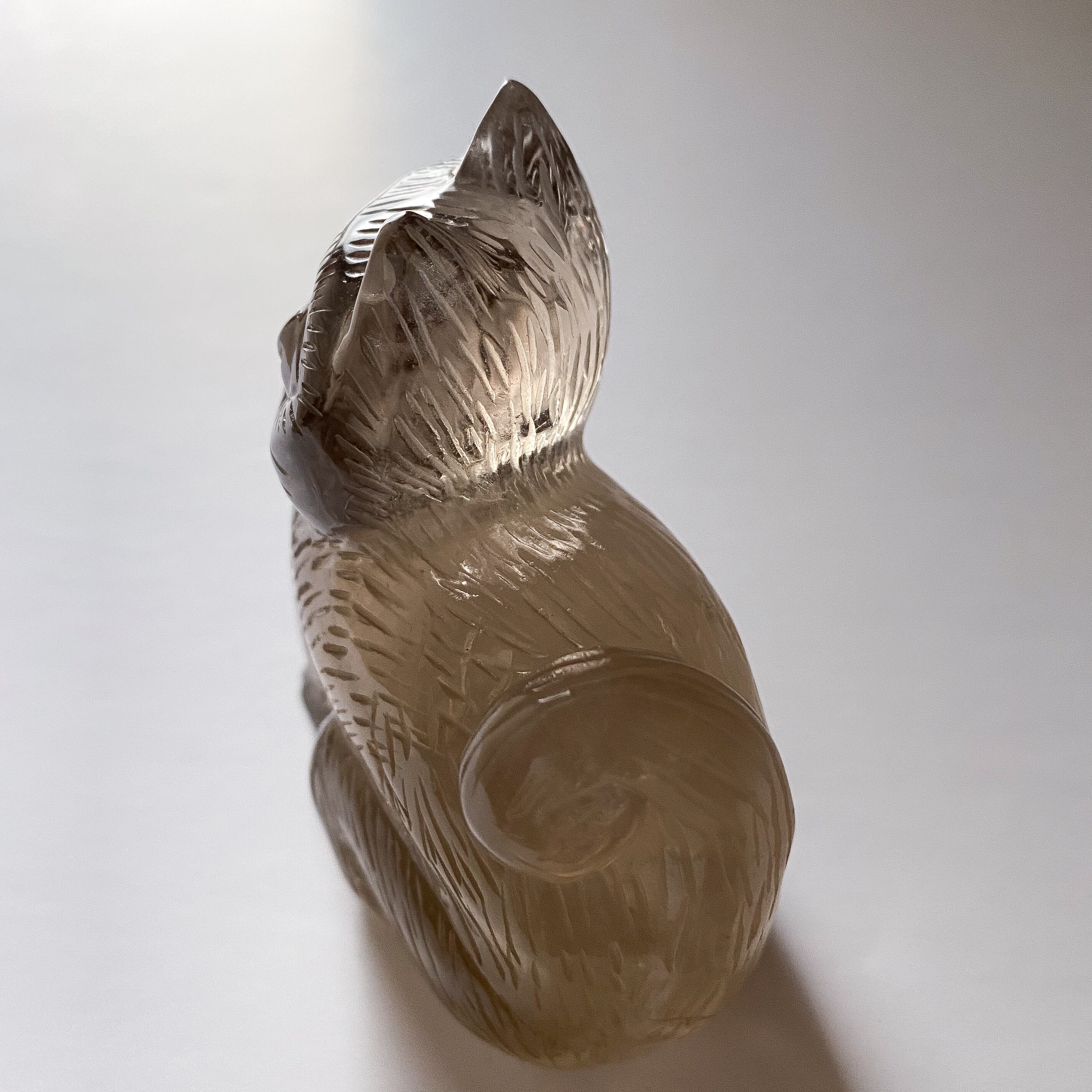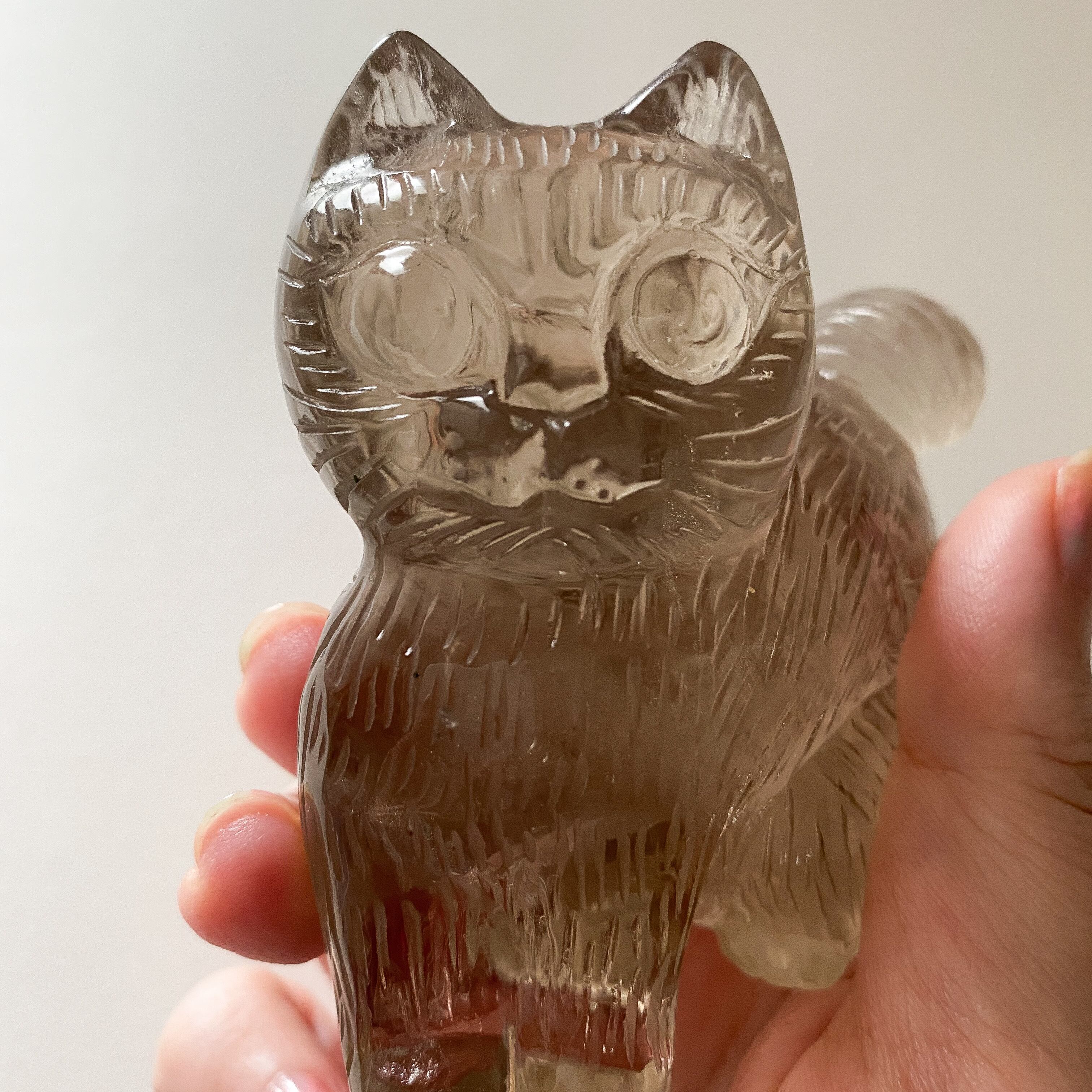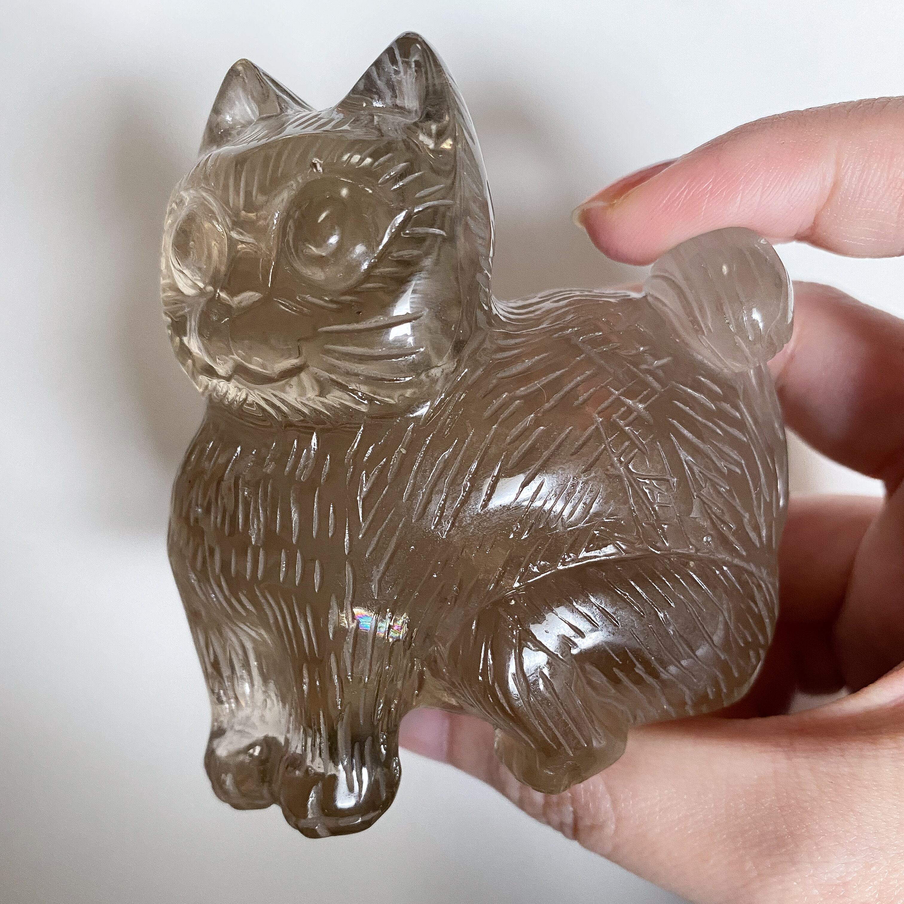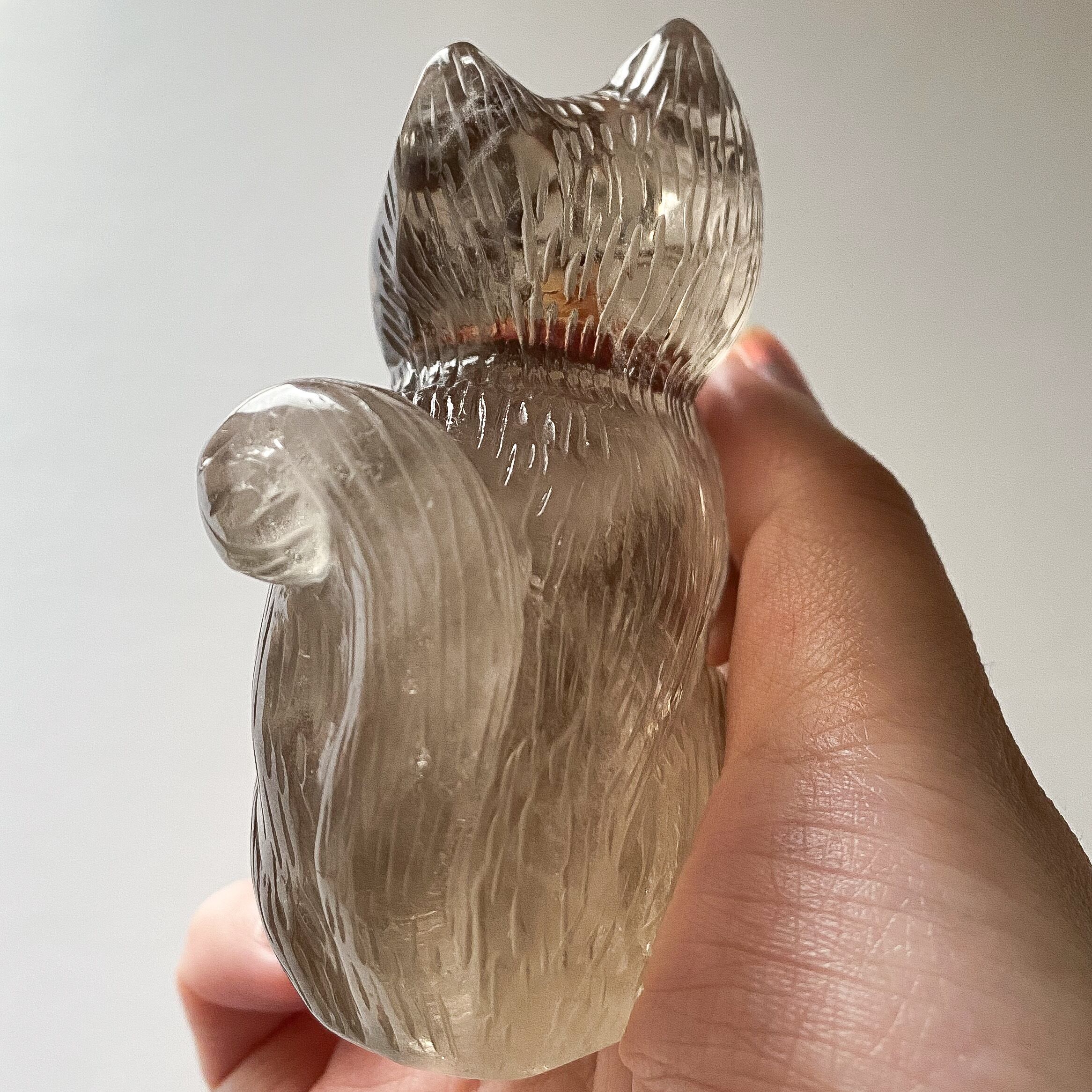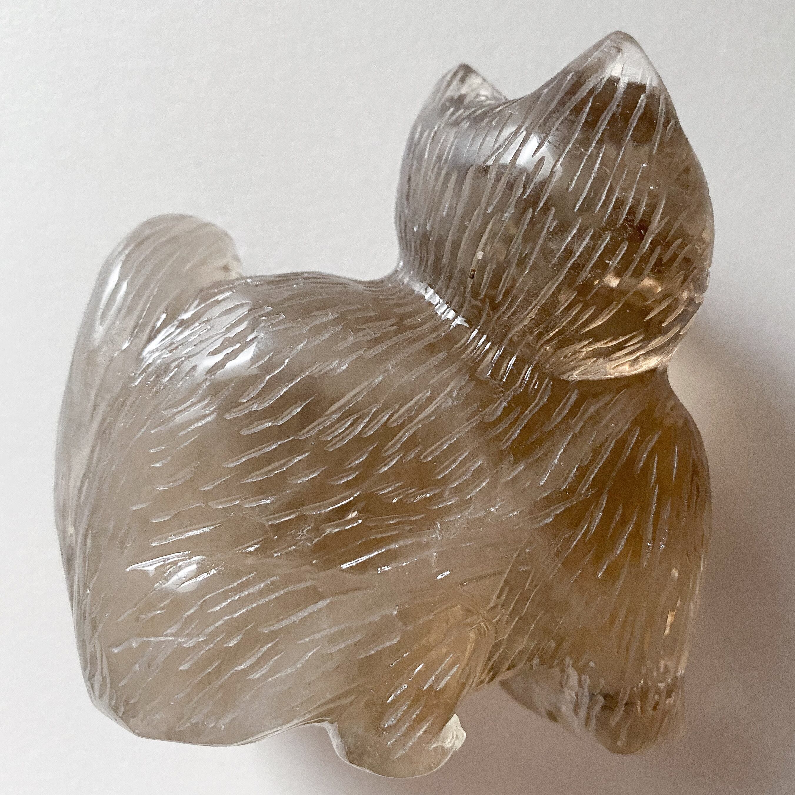 使用されているスモーキークォーツはナチュラルカラーです。全体に淡く優しいカラーで濃淡があり、お顔部分がよりクリアなスモーキー感、体の部分の方が淡い色合いです。向かって右側の前脚に虹があります。尻尾は幸運を引っ掛けて来ると言われているカギしっぽになっています。