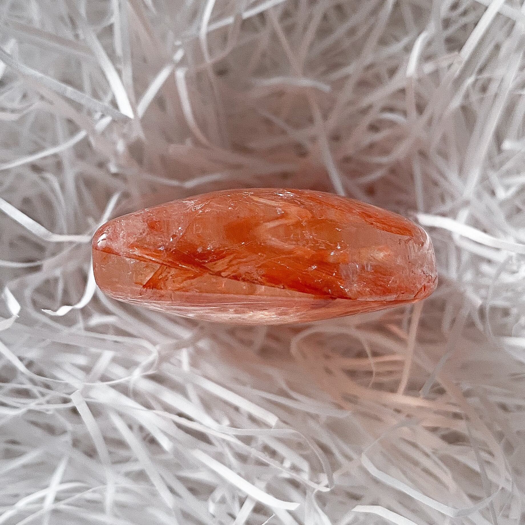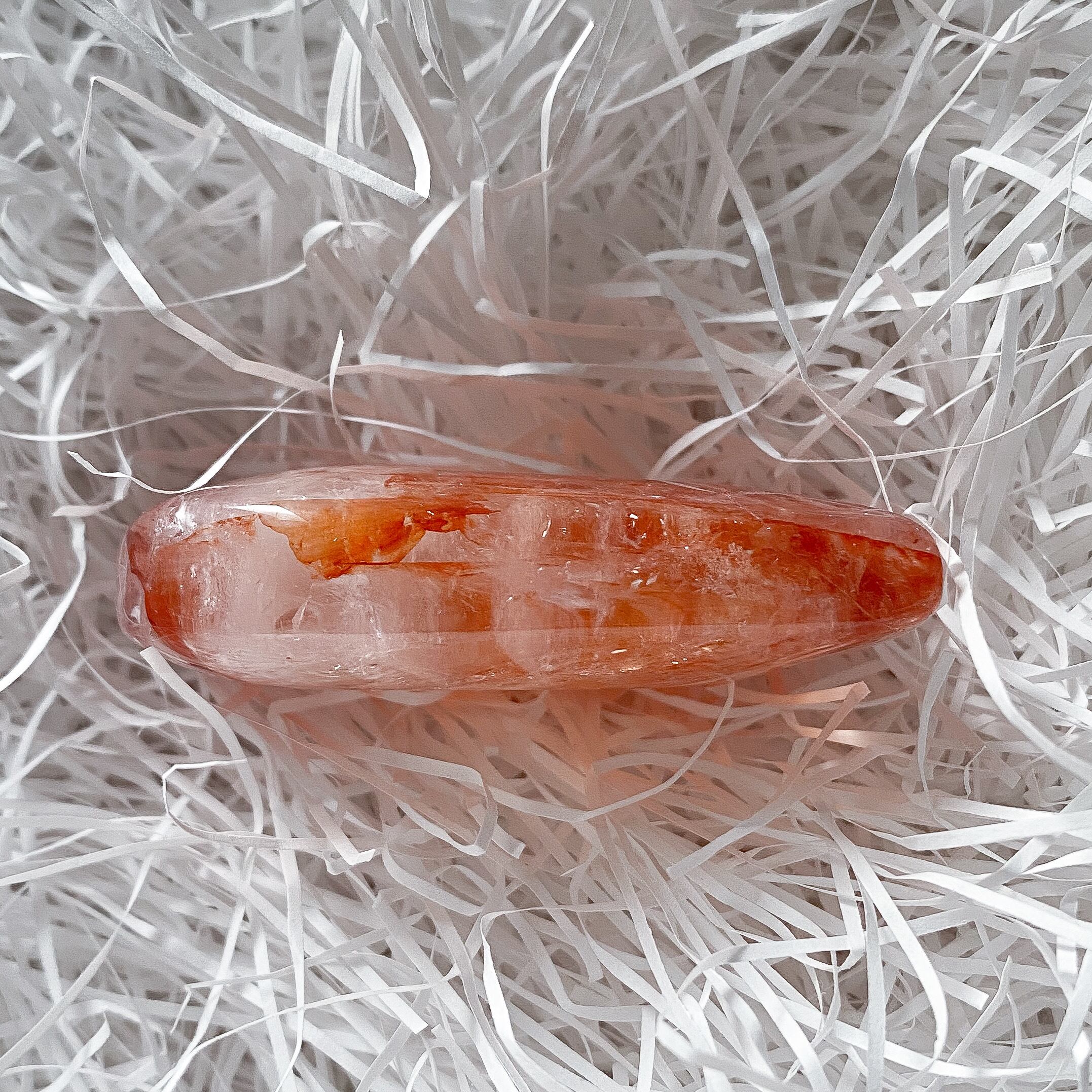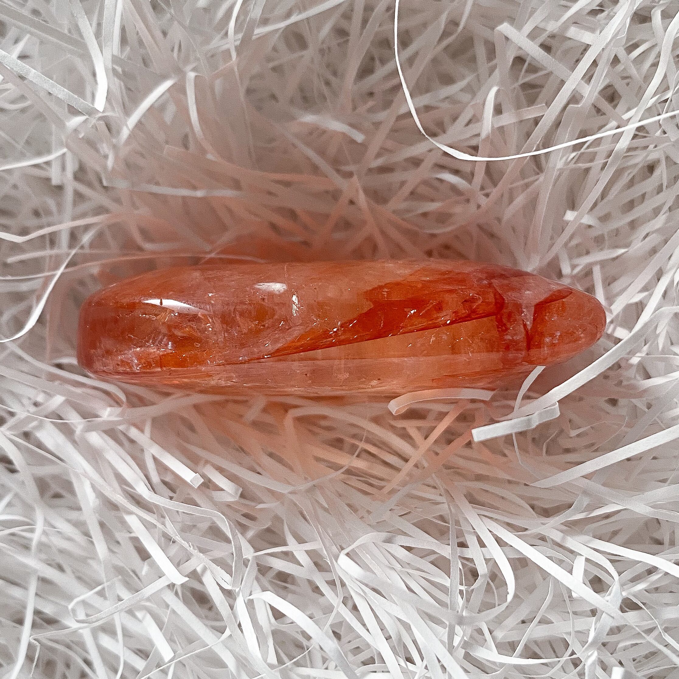 レッドヘマタイトクォーツのパームストーンです。水晶部分に透明感があり、角度を変えるとキラキラと光ります。