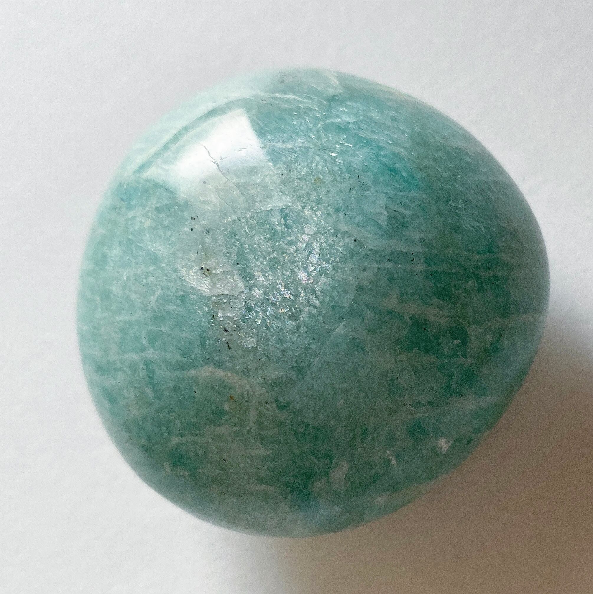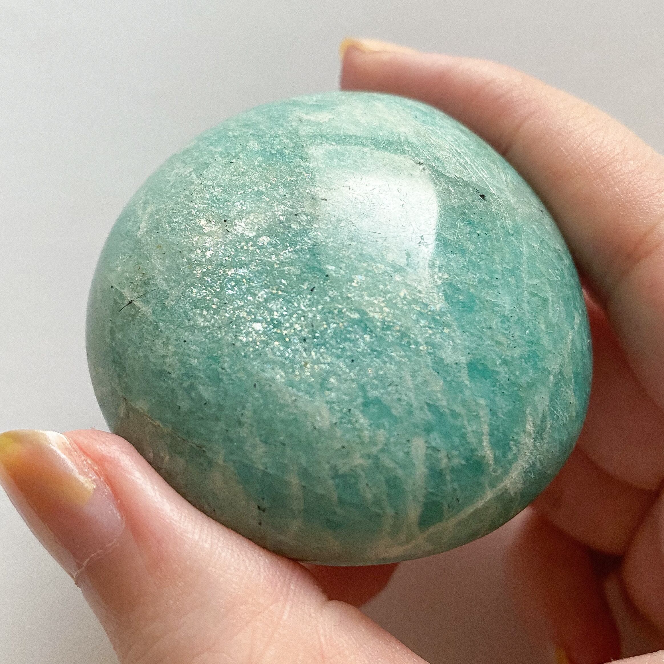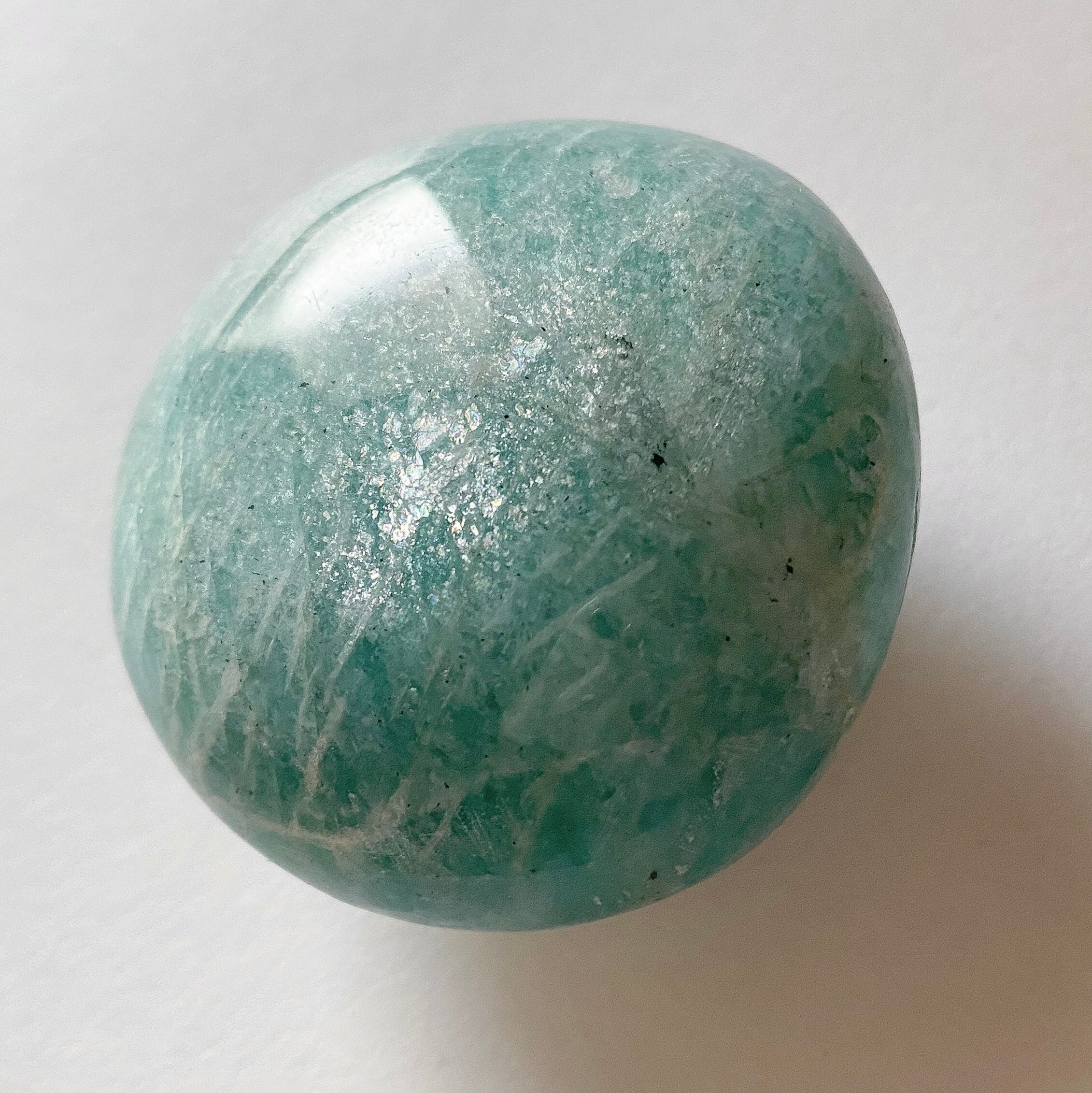 小さなおにぎりのようなコロンとした形で、ブルーグリーンの地色にホワイトカラーのシラーが出ます。両面キラキラとしたシラーの輝きが見られ、ブルーグリーンとホワイトシラーの組み合わせは幻想的な中にも明るく爽やかな雰囲気があり、持っていると元気になれそうな色合いのストーンだと思います。