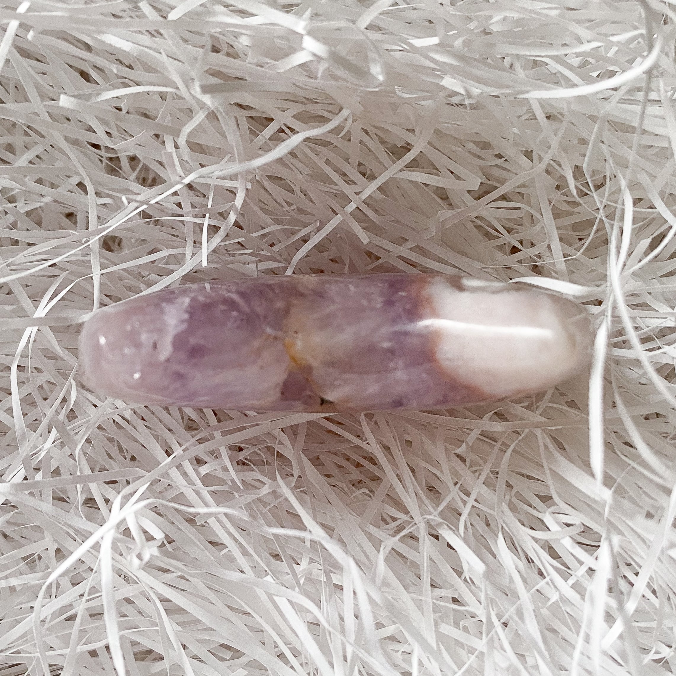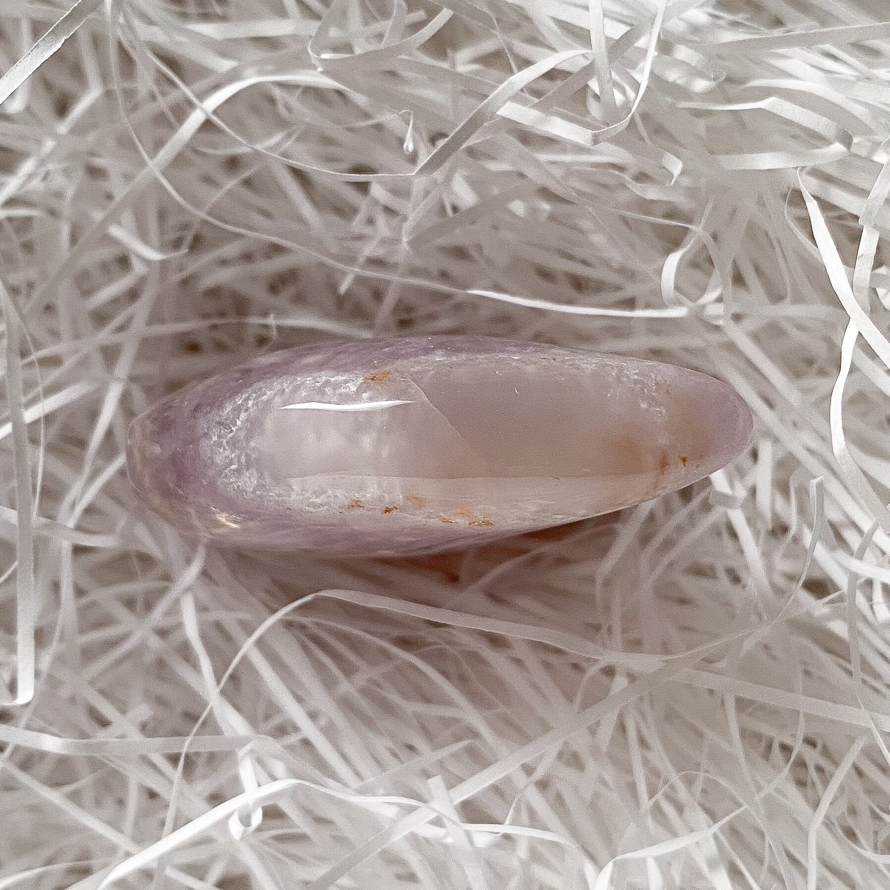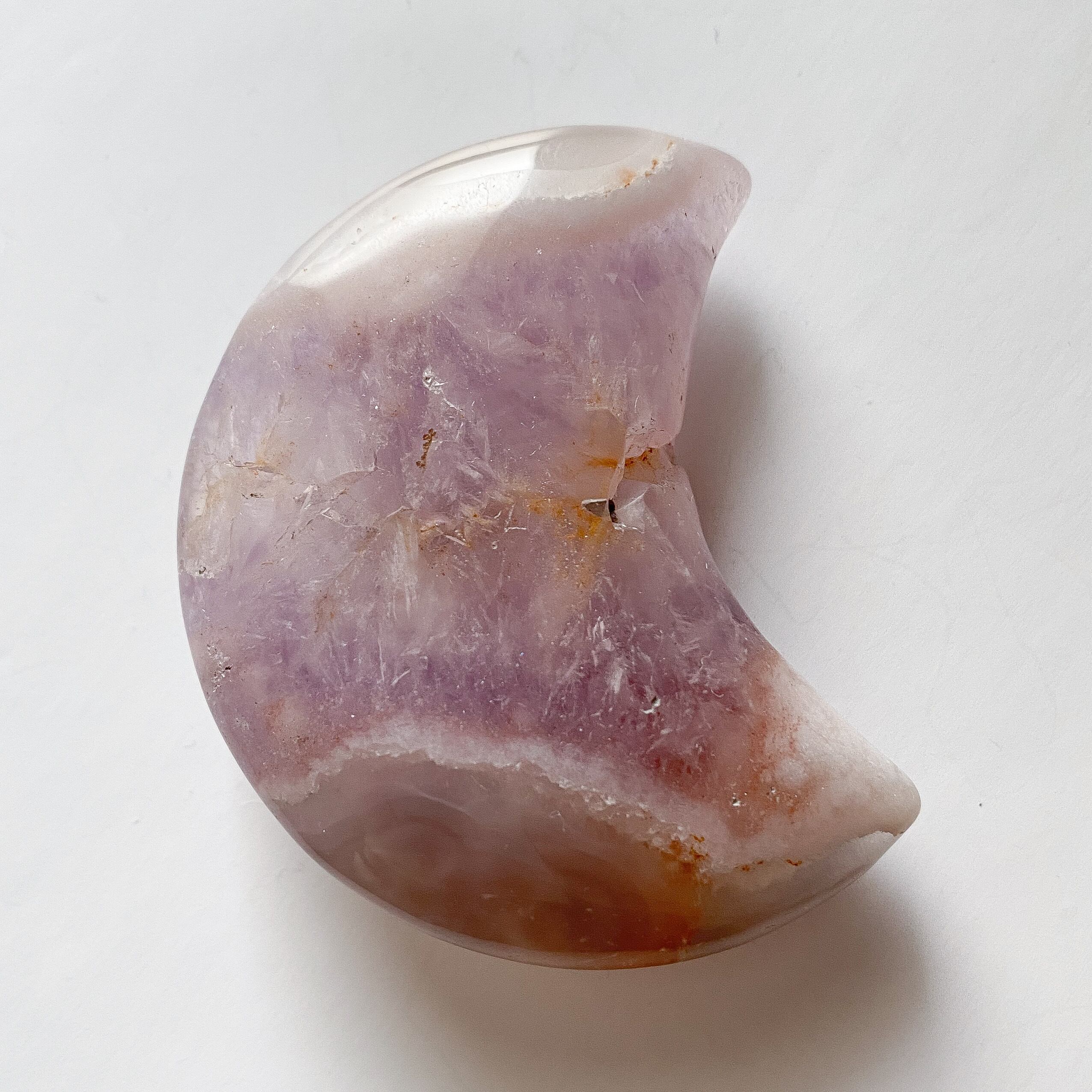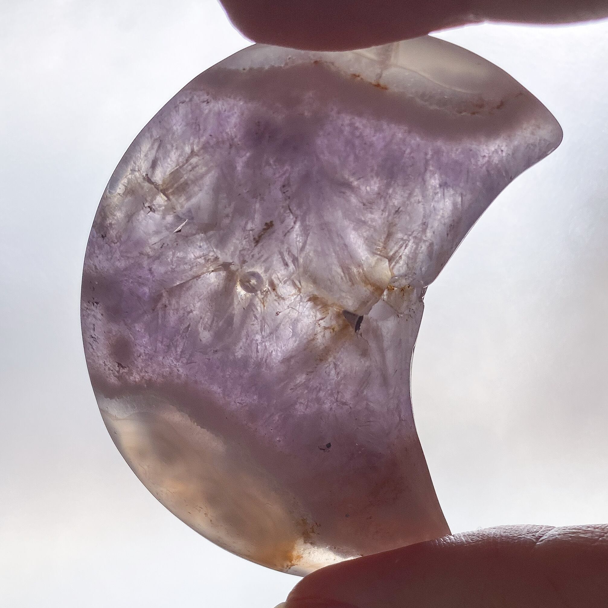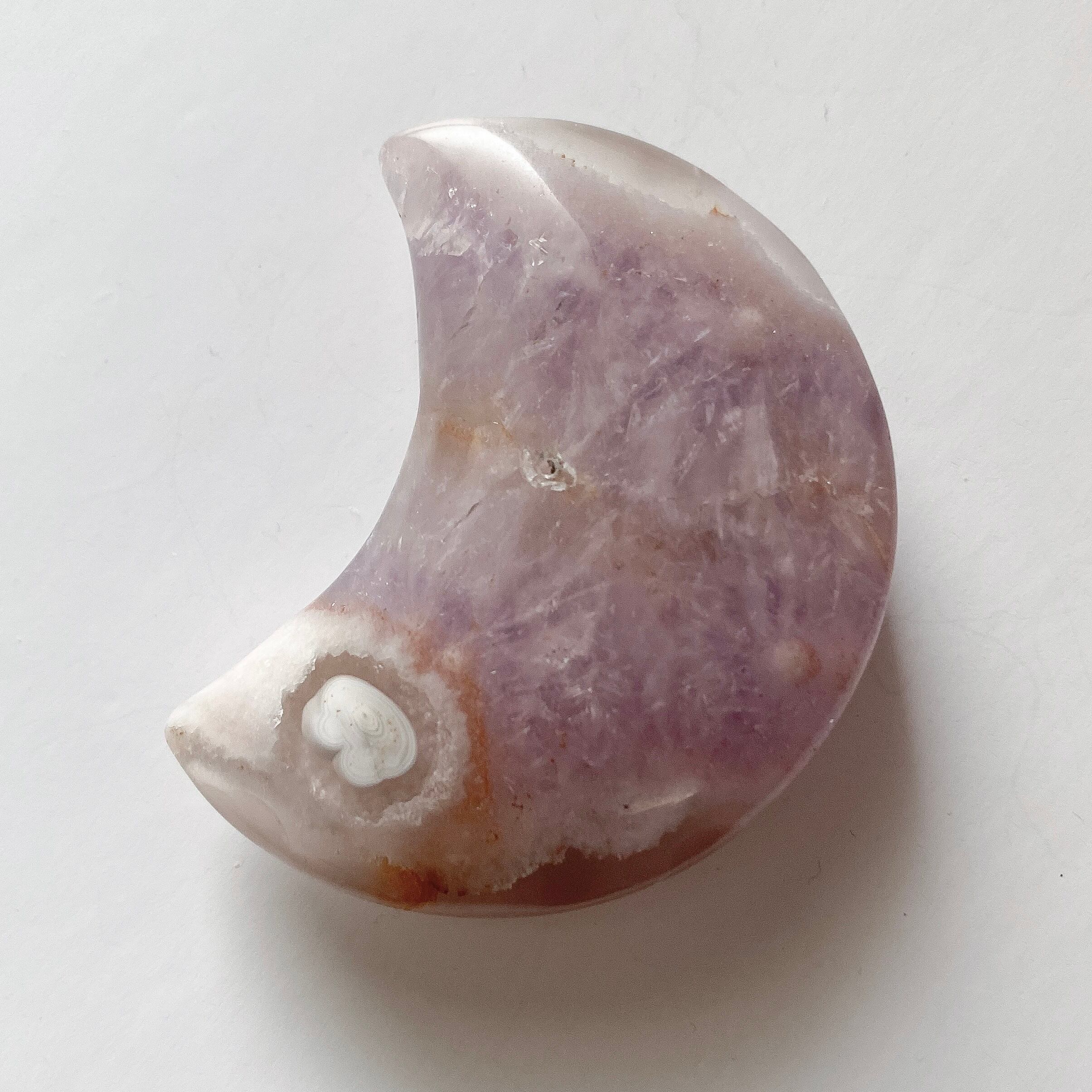 お月様は中央部がアメジストの結晶となり、上下に瑪瑙質が入っています。優しく柔らかい色のアメジスト結晶で、ムーンシェイプの形は丸みを帯びたタイプで手に馴染みやすく可愛らしいです。