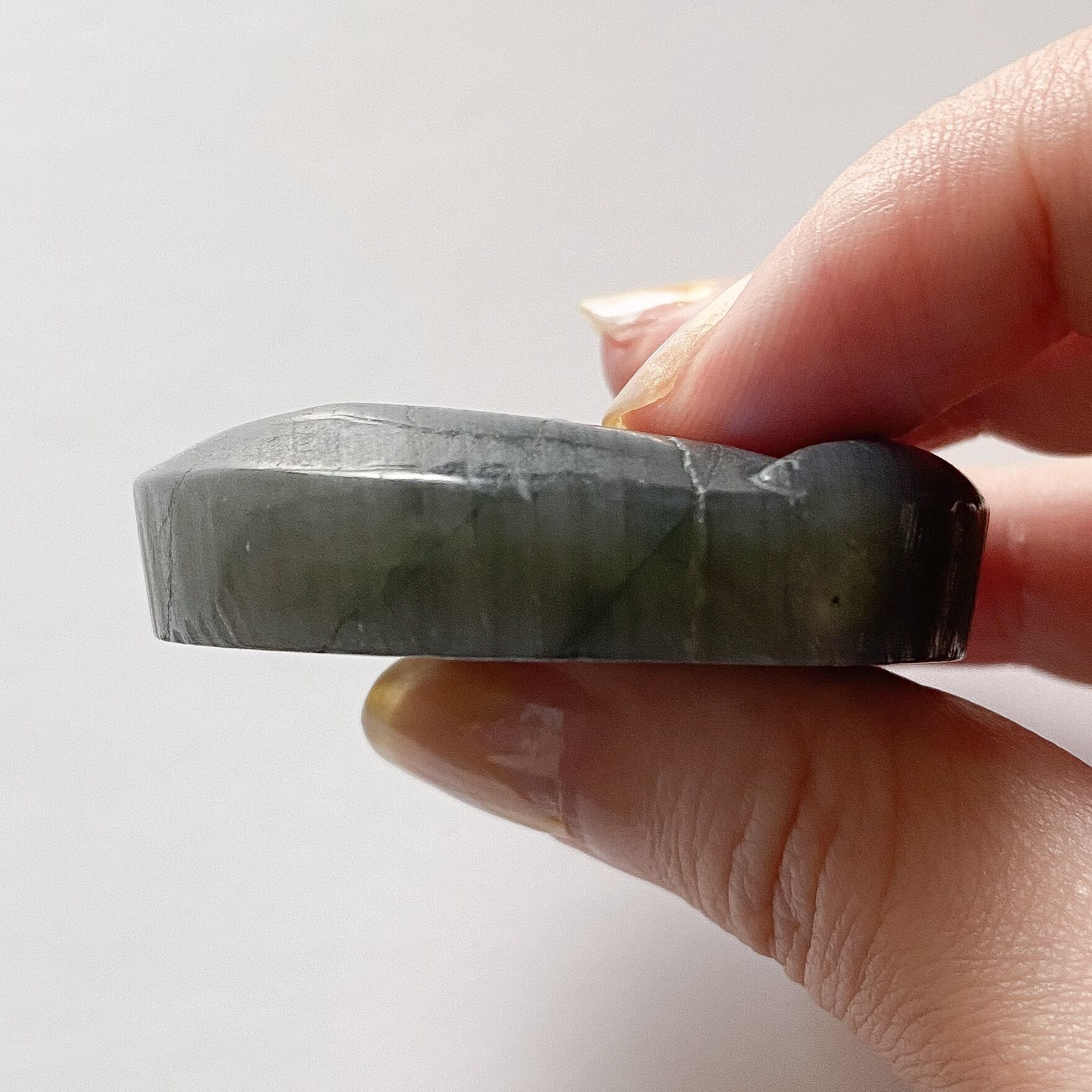 太陽と月が寄り添う姿のカービングは、陰と陽のエネルギーを象徴するとされるラブラドライトにぴったりの彫刻なのではないかと思います。