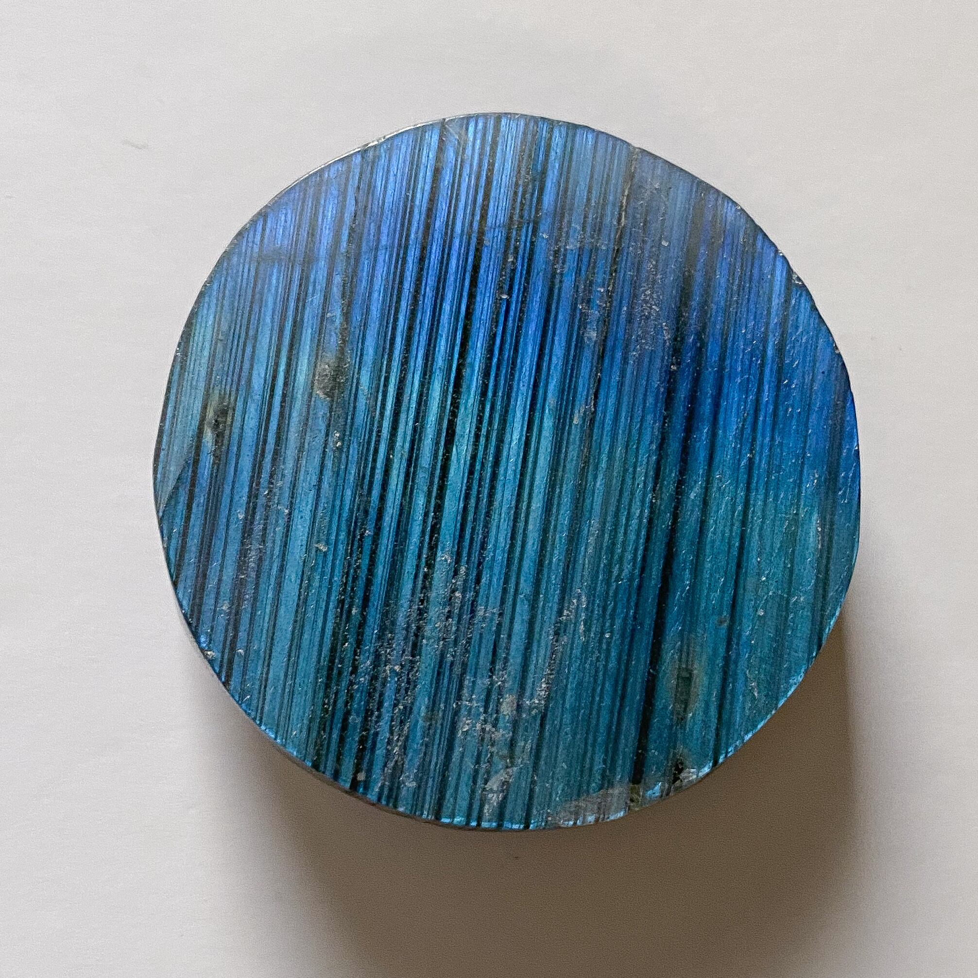 研磨が甘めでややマットなツヤ感なのですが、正面から入るシラーが強くモルフォ蝶の羽のような一面のブルーカラーがとても目を惹いたラブラドライトです。
