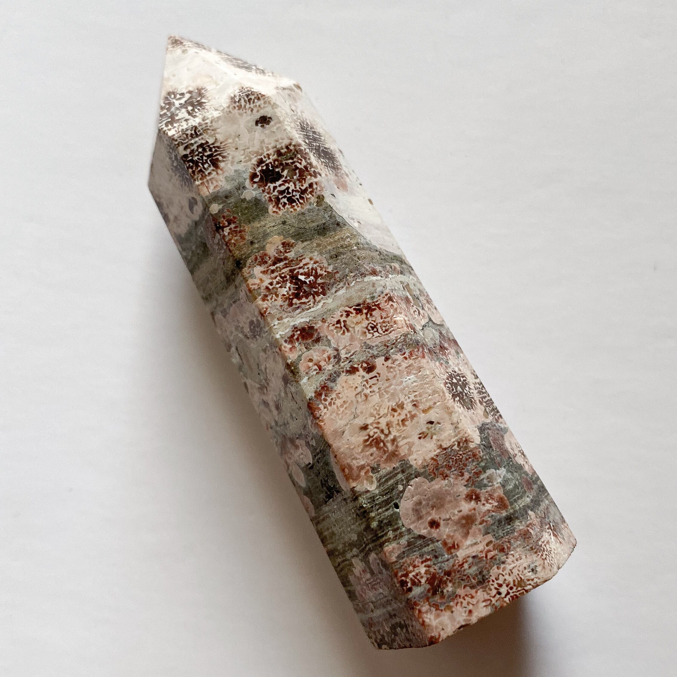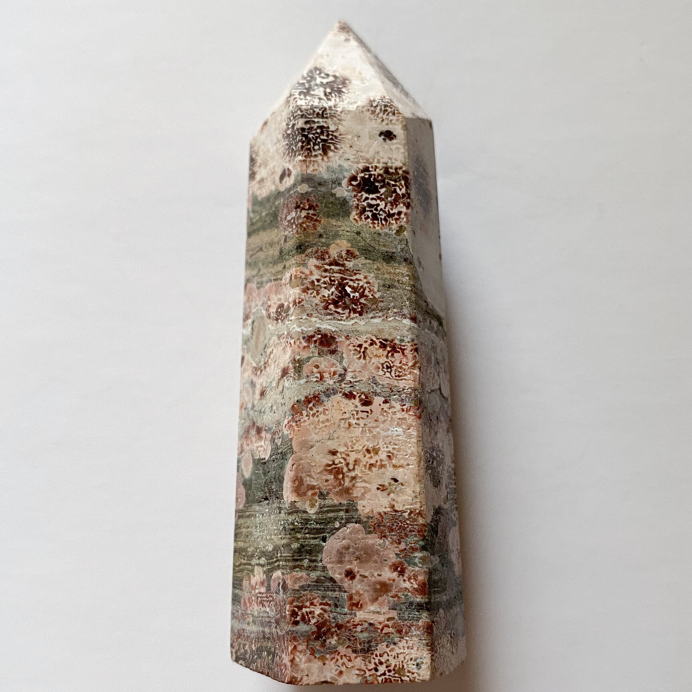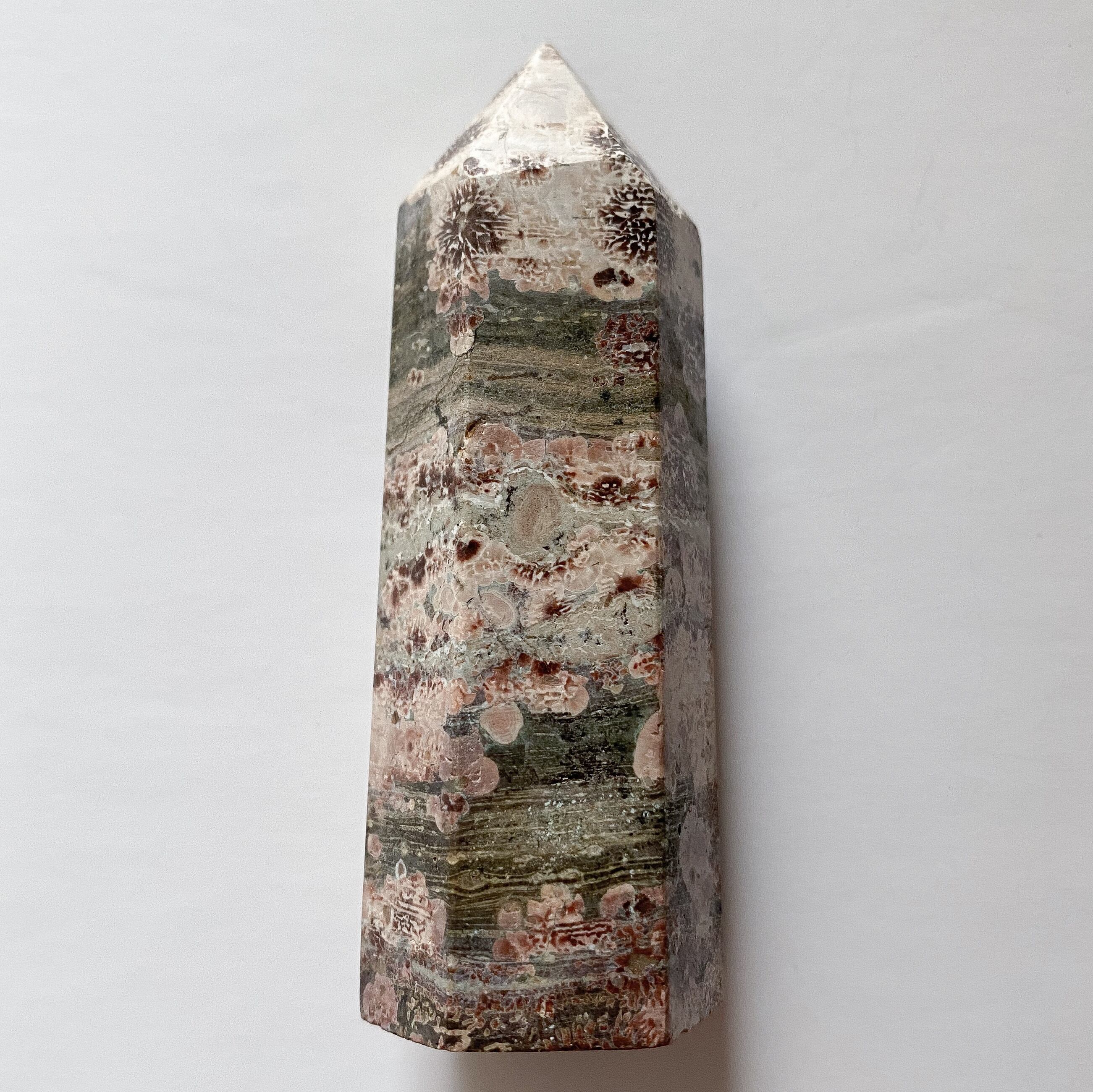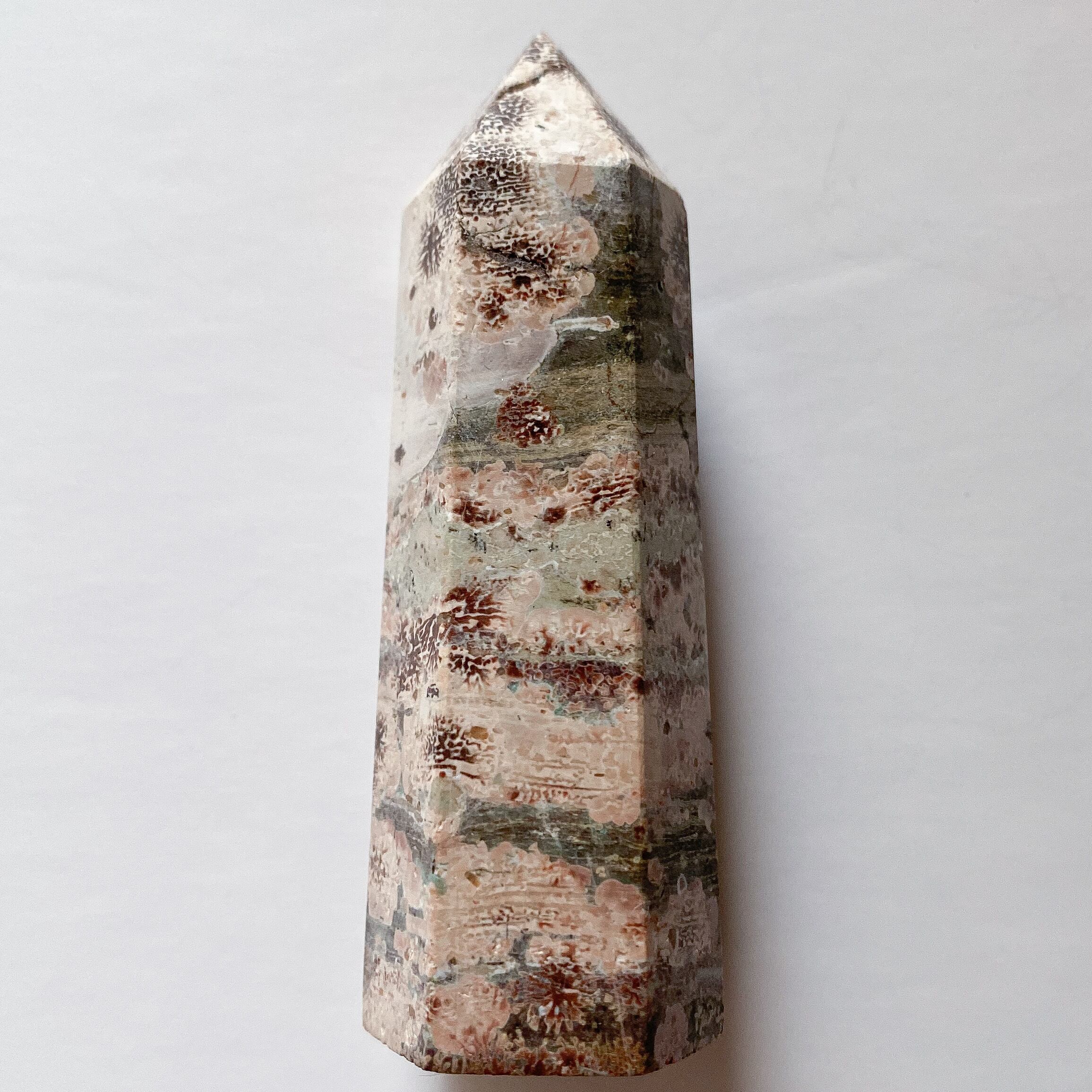 地色の深いモスグリーンの中にベージュやブラウンのカラーが混じったジャスパーのタワーです。