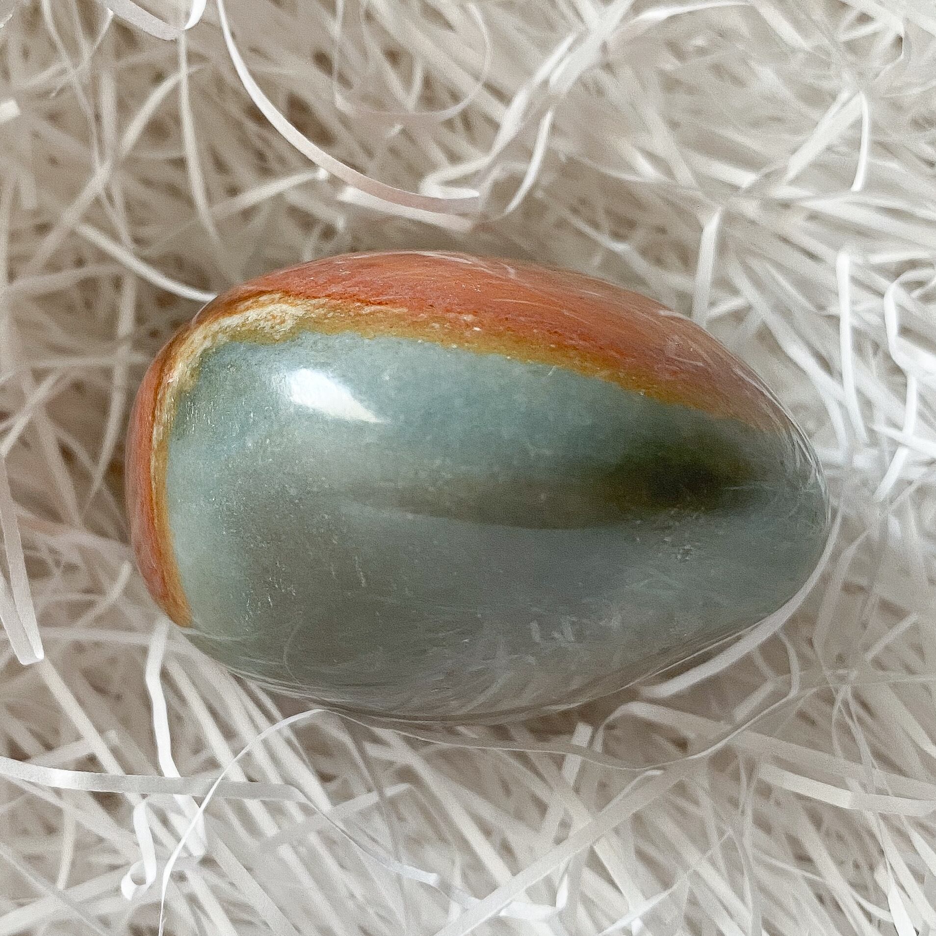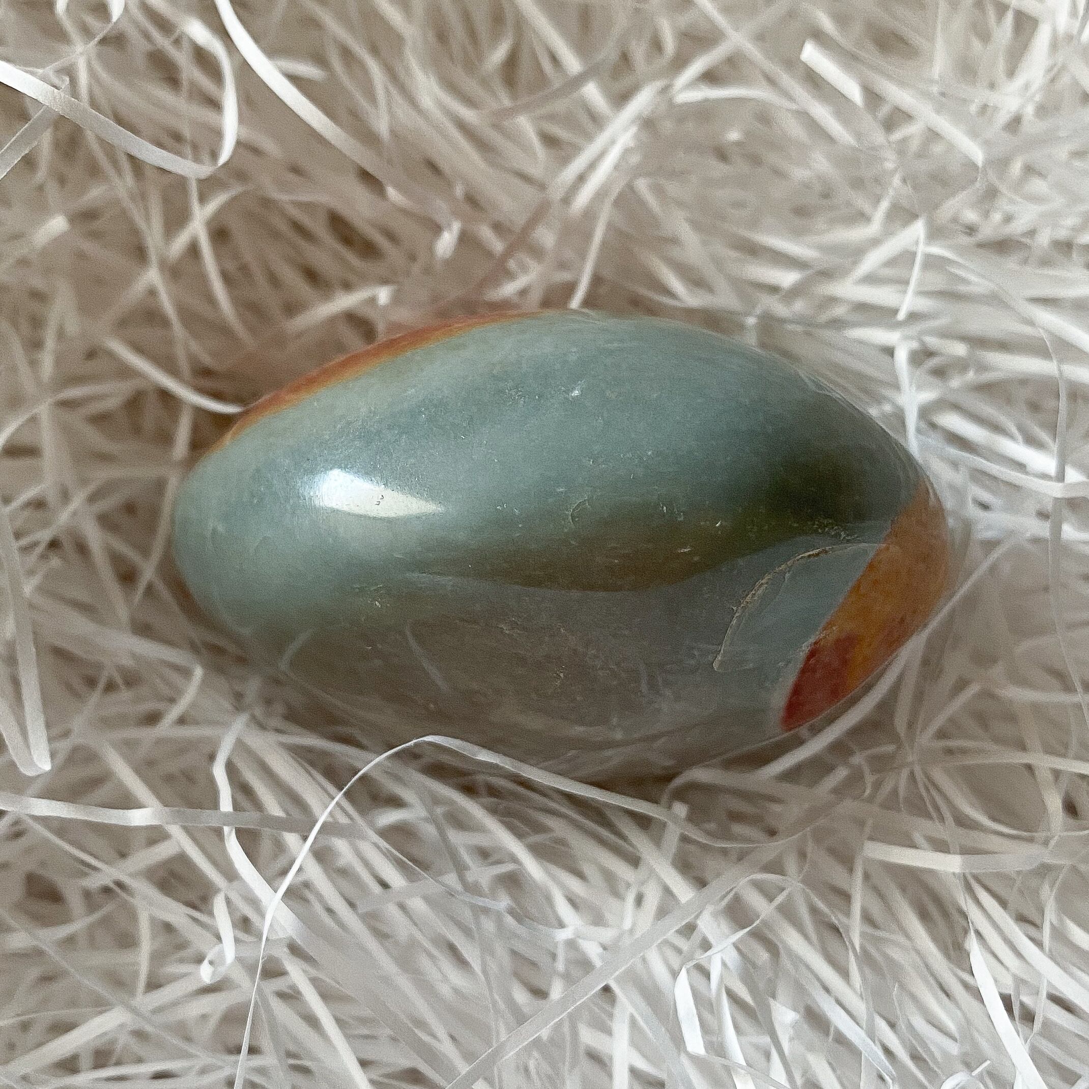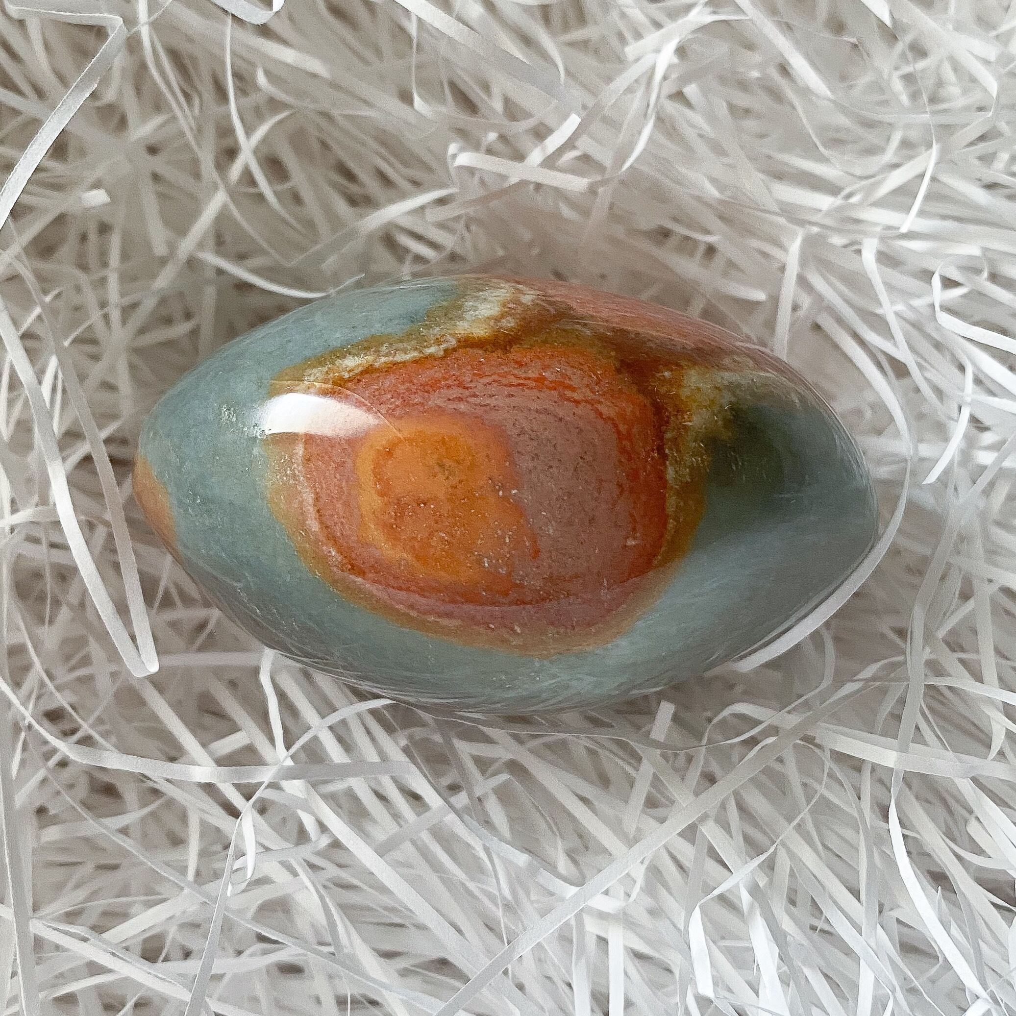 インテリアの片隅にあっても目を惹く色合いですが、パームストーンですので携帯されるのにも向いています。天然色のカラフルな色合いがふとした時に気持ちを持ち上げてくれるのではないかと思います。
