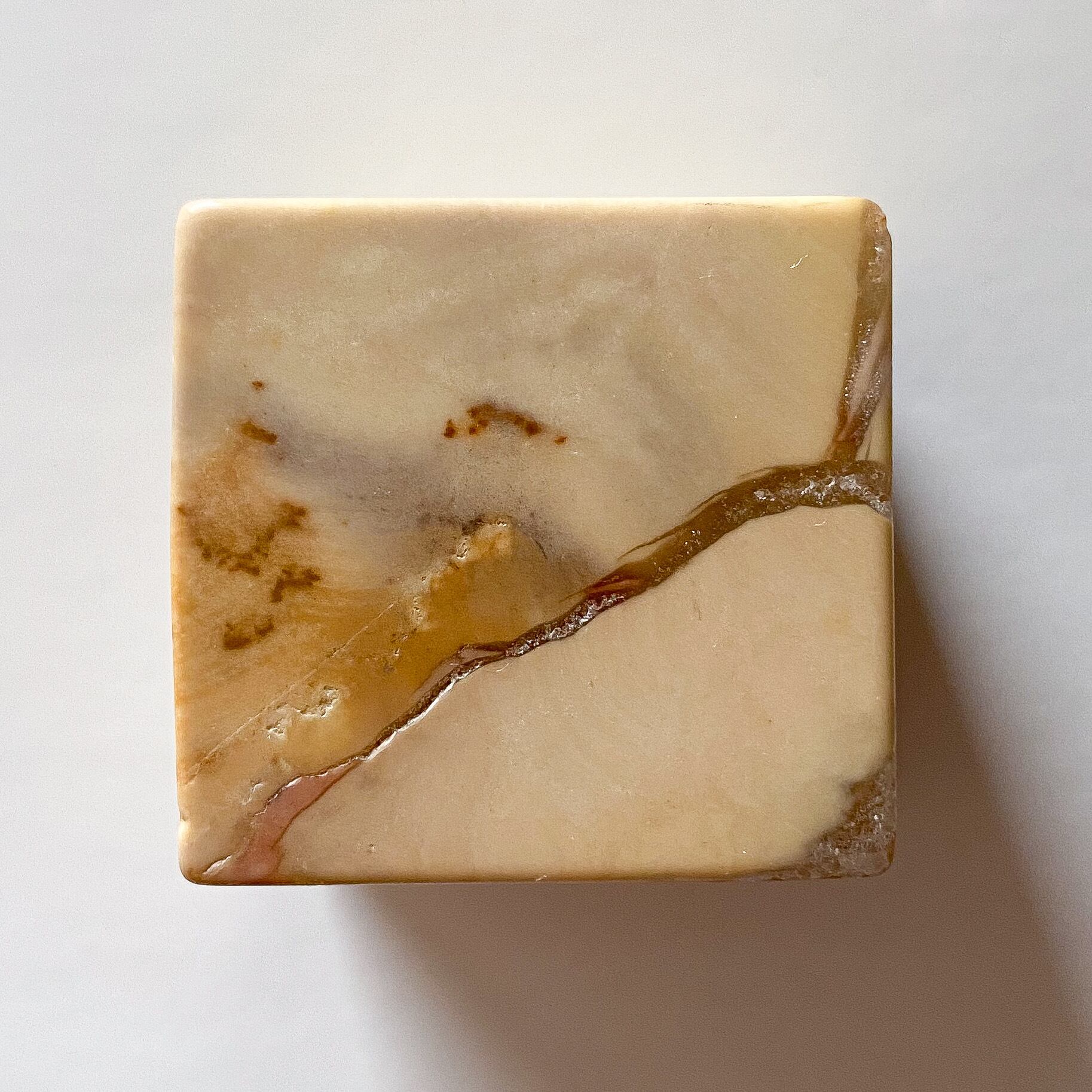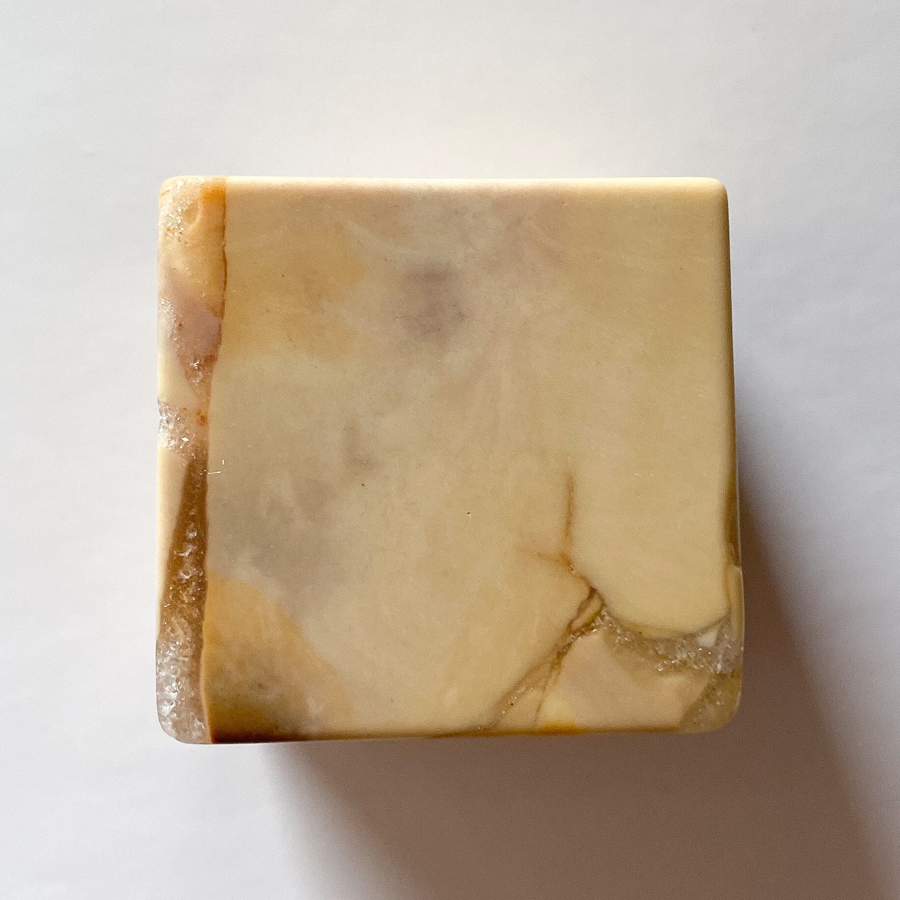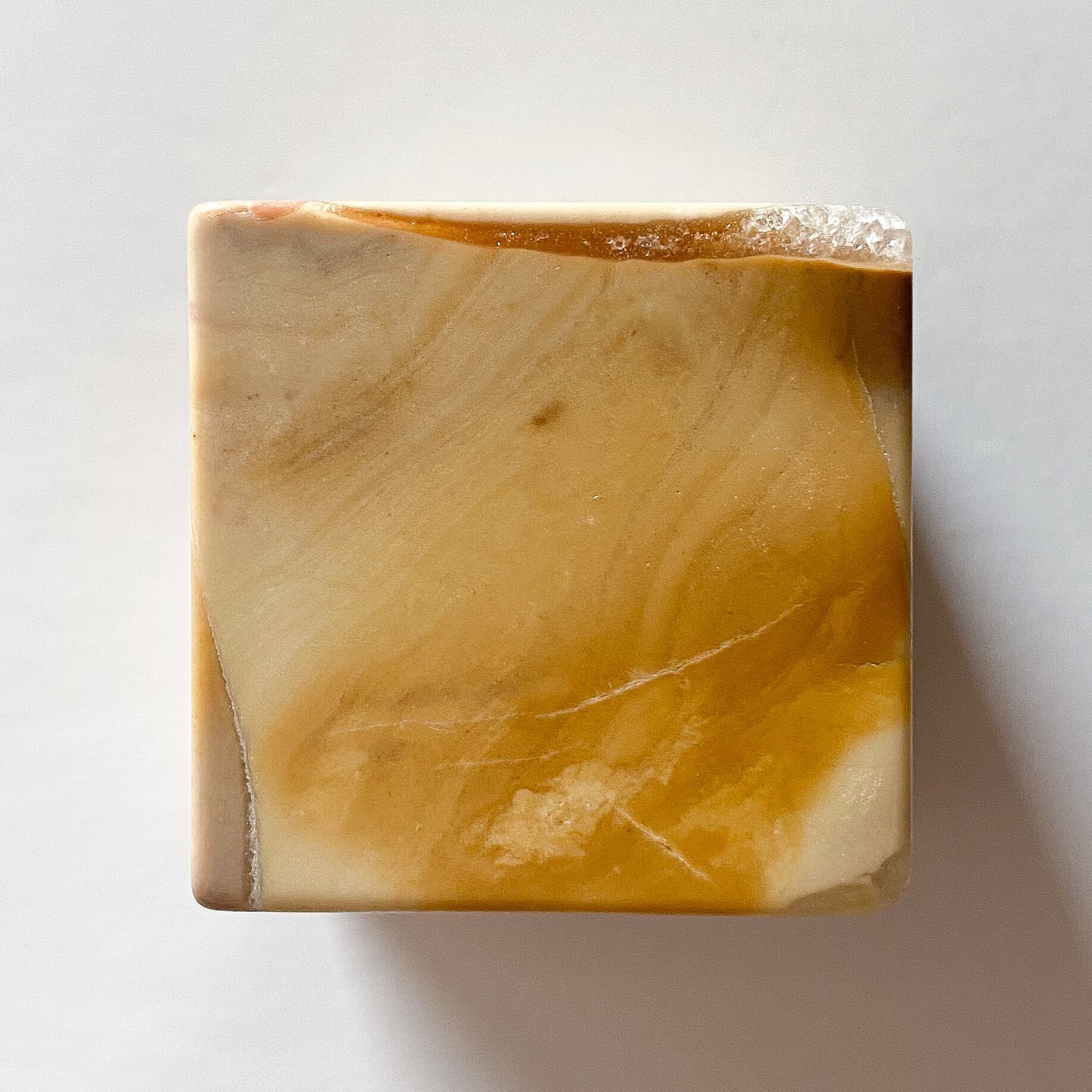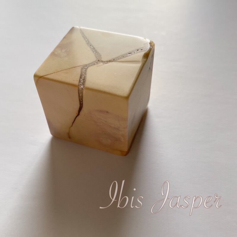 明るい色合いのアイビスジャスパーのキューブです。淡いクリーム色〜イエロー、ブラウンなどの色が混じり合っています。