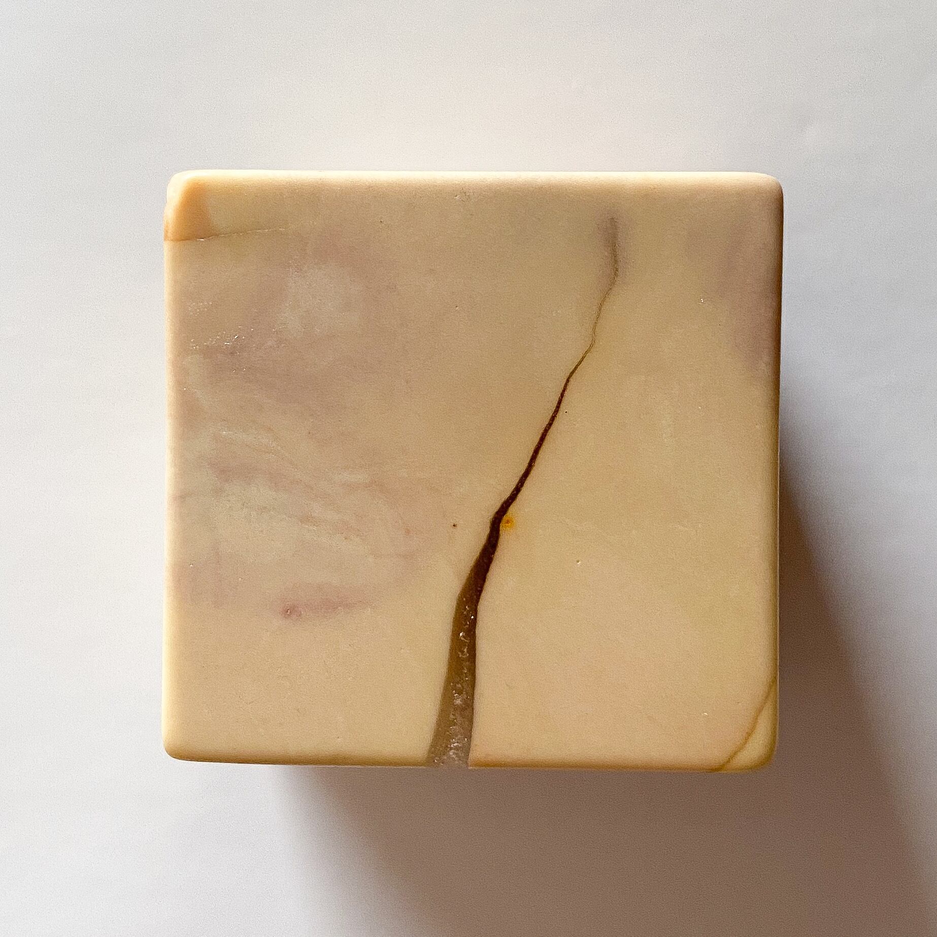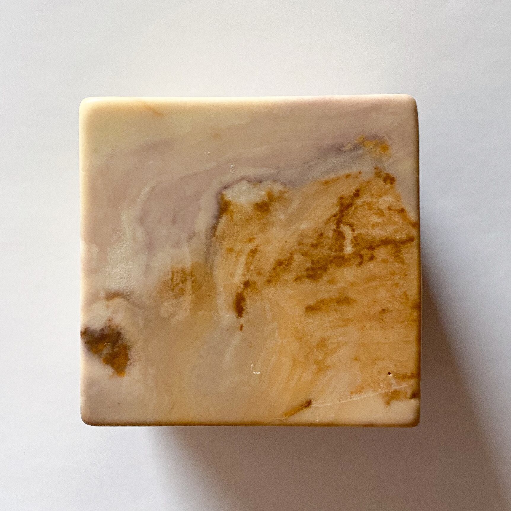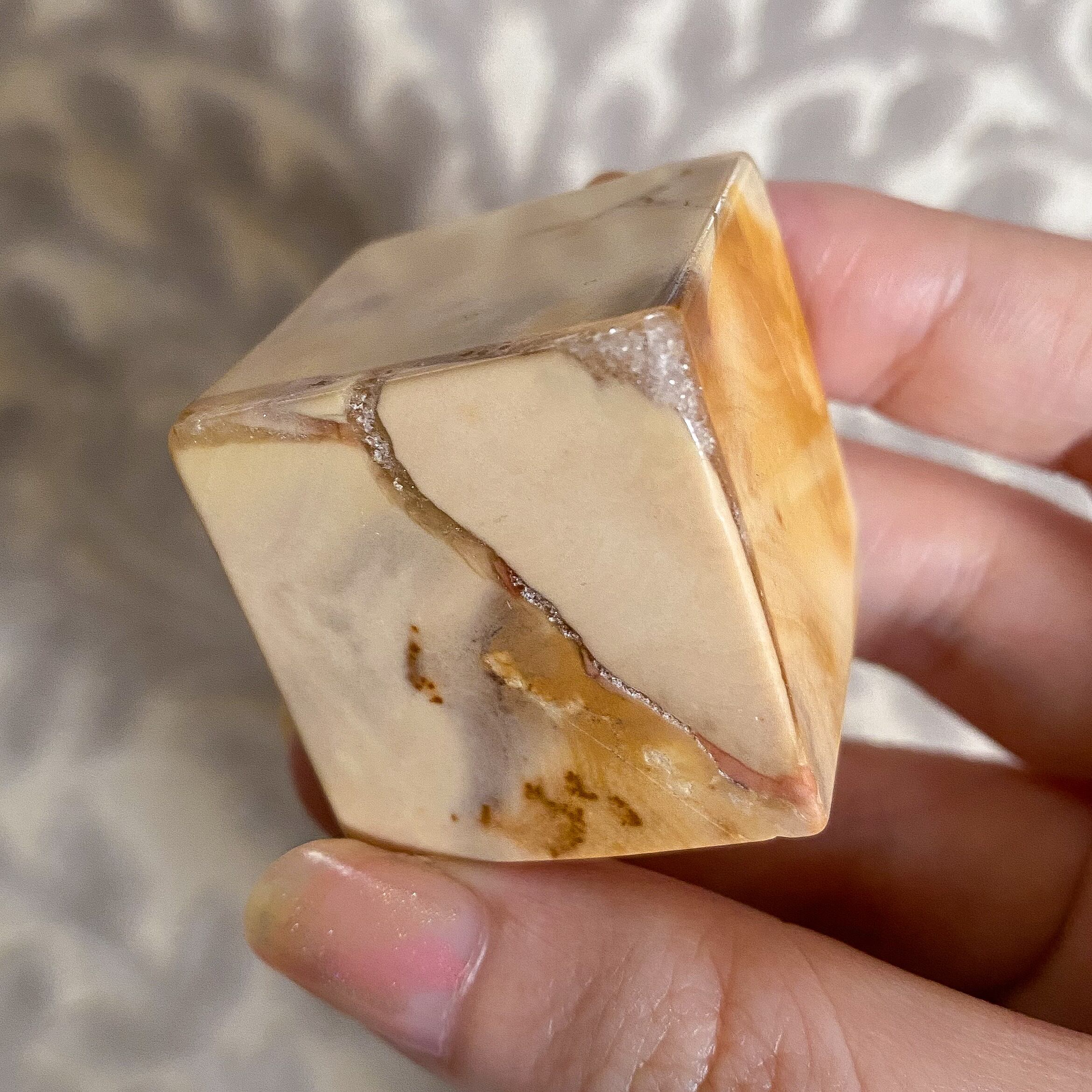明るい色合いのアイビスジャスパーのキューブです。淡いクリーム色〜イエロー、ブラウンなどの色が混じり合っています。