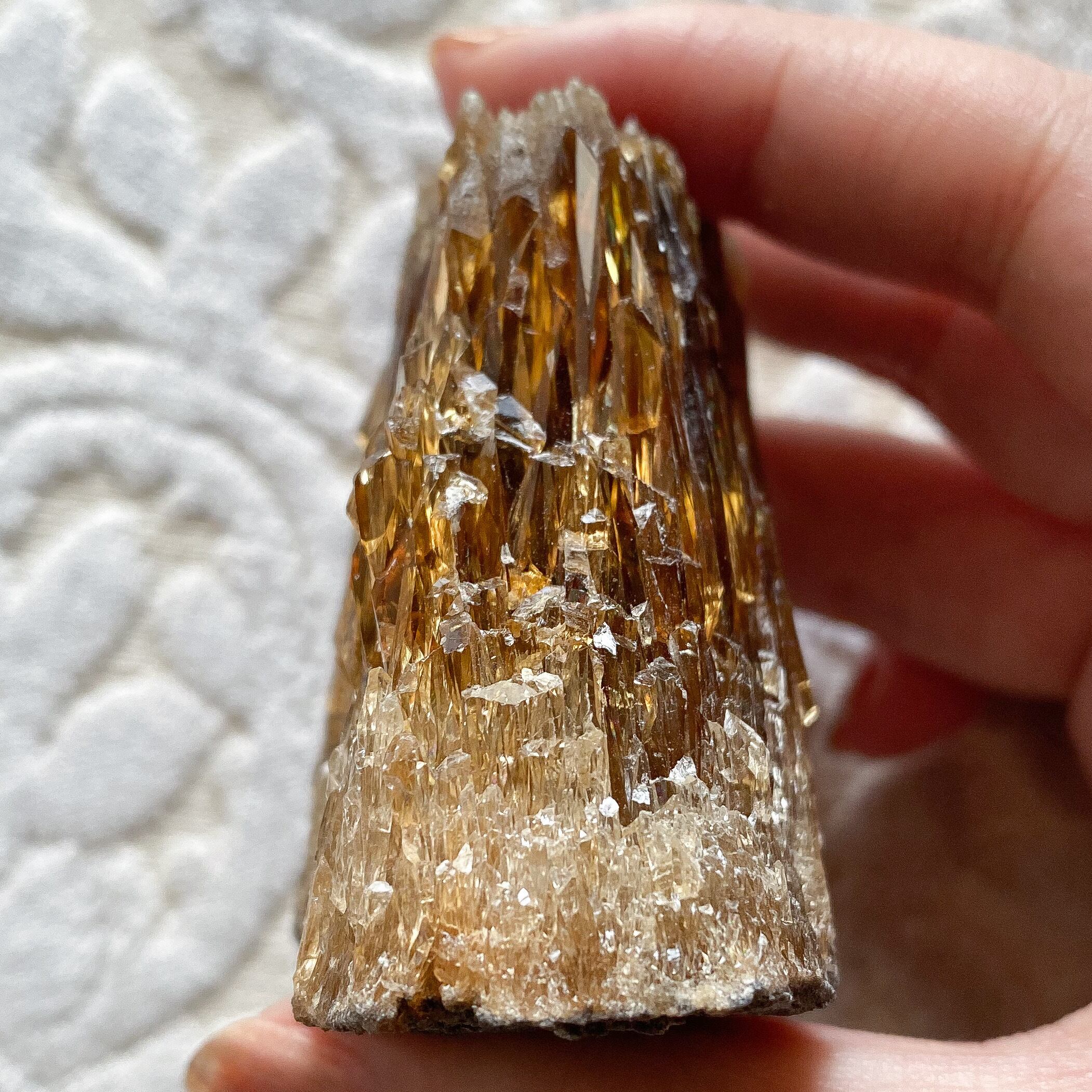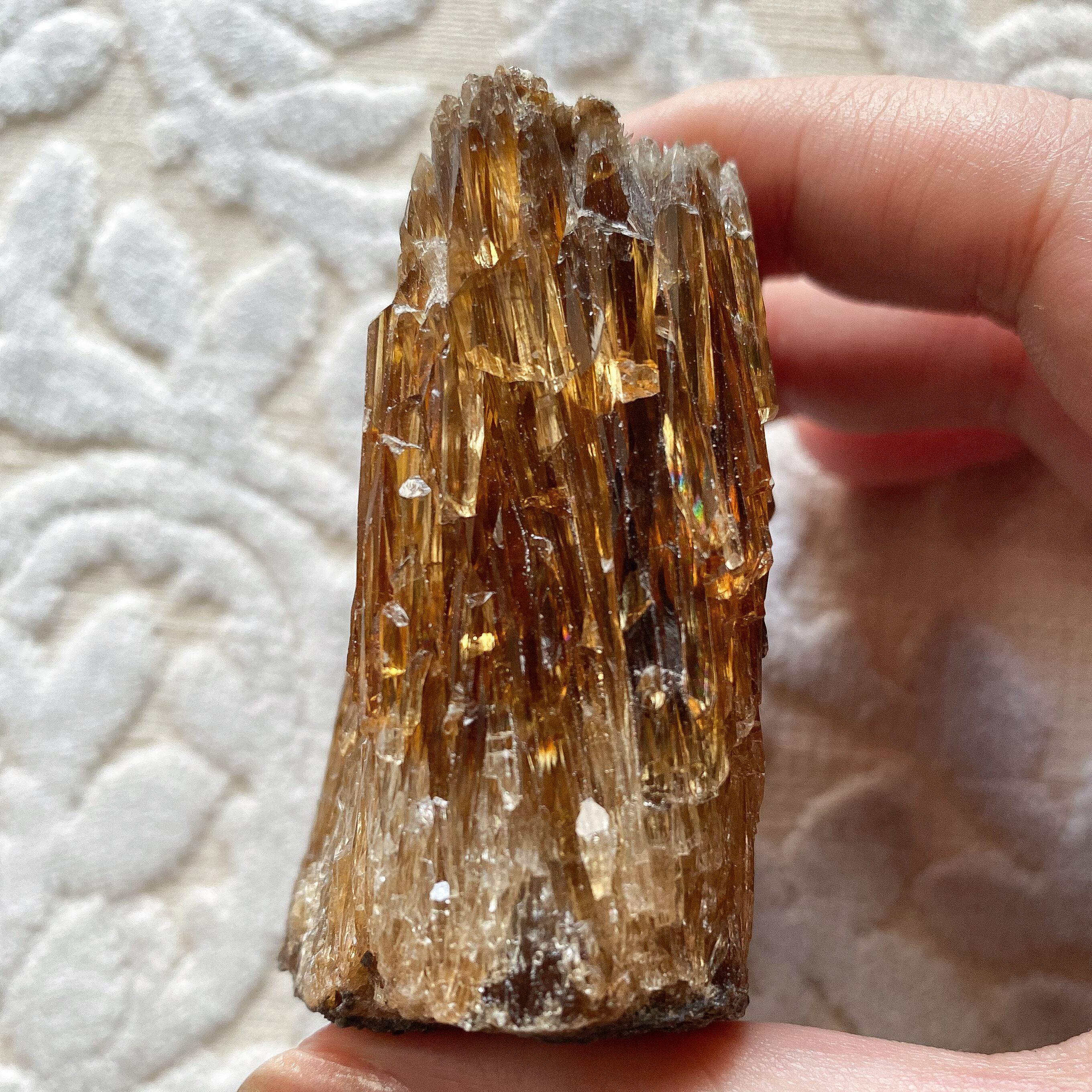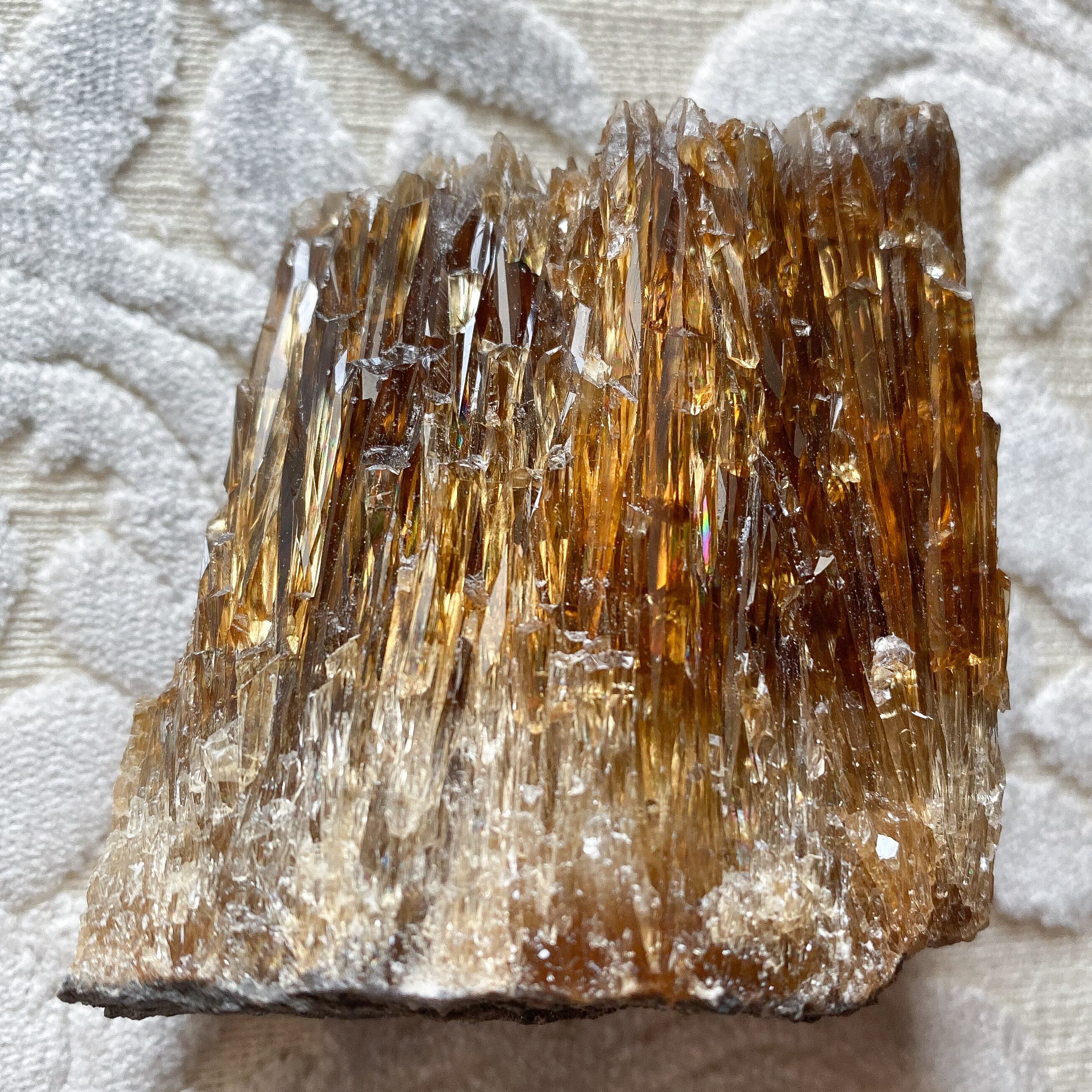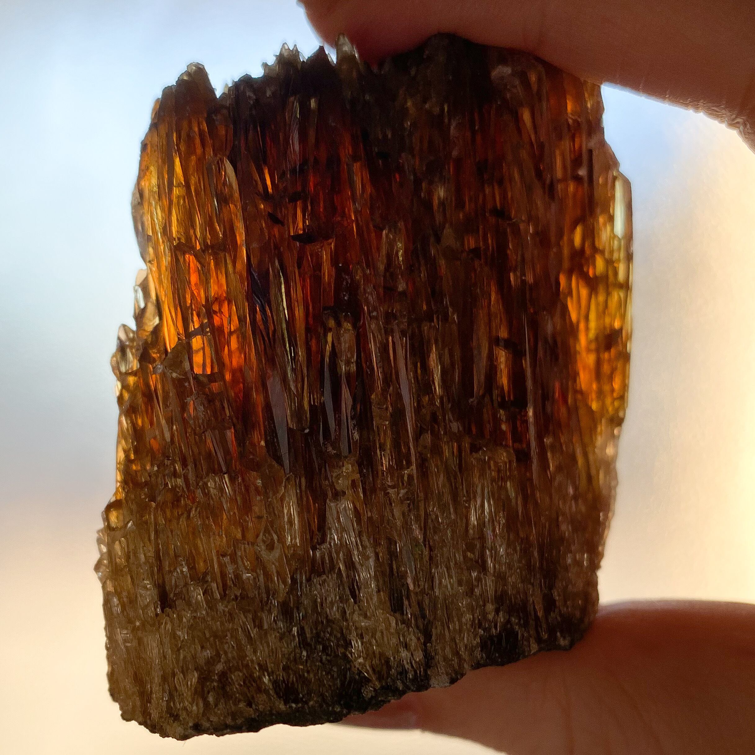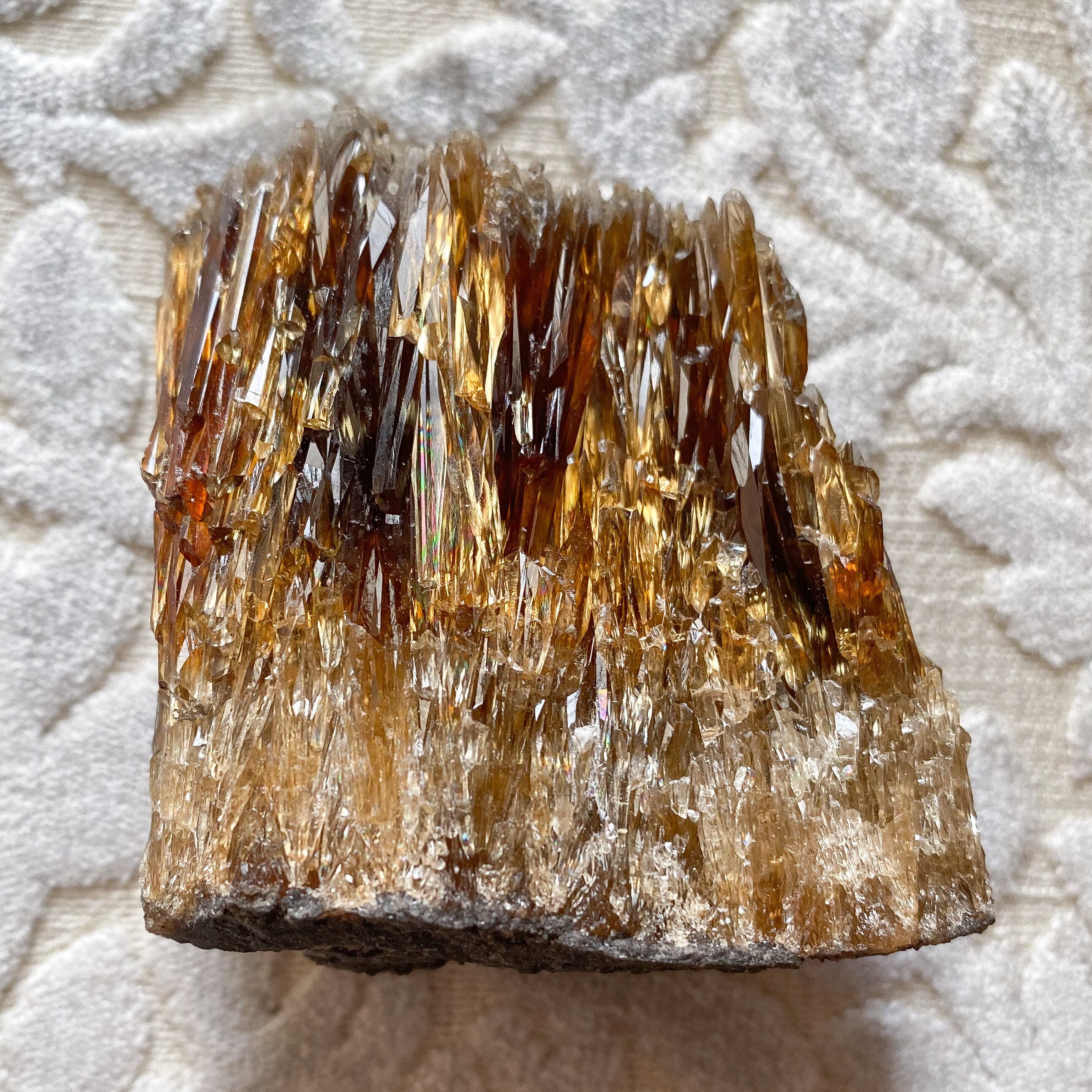 剣山のような独特の形状をしており、細い結晶が密集して濃いアンバーブラウンの色味になっています。一本一本の結晶は明るく透明感があり、中に細い虹が入っている箇所も見られます。