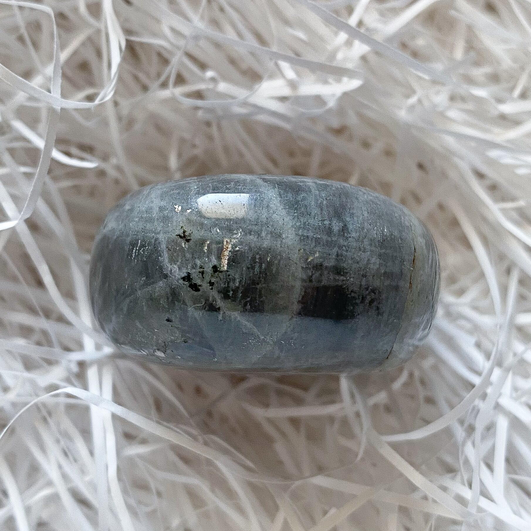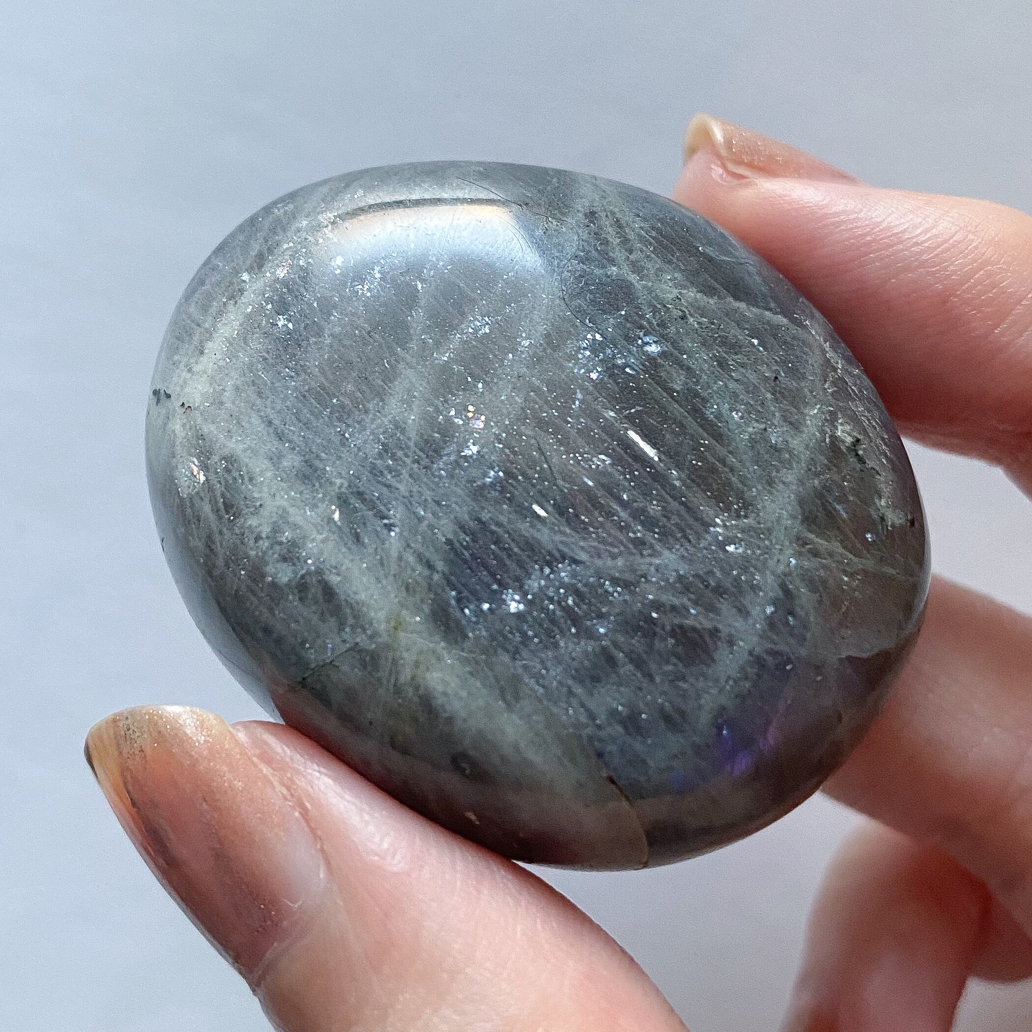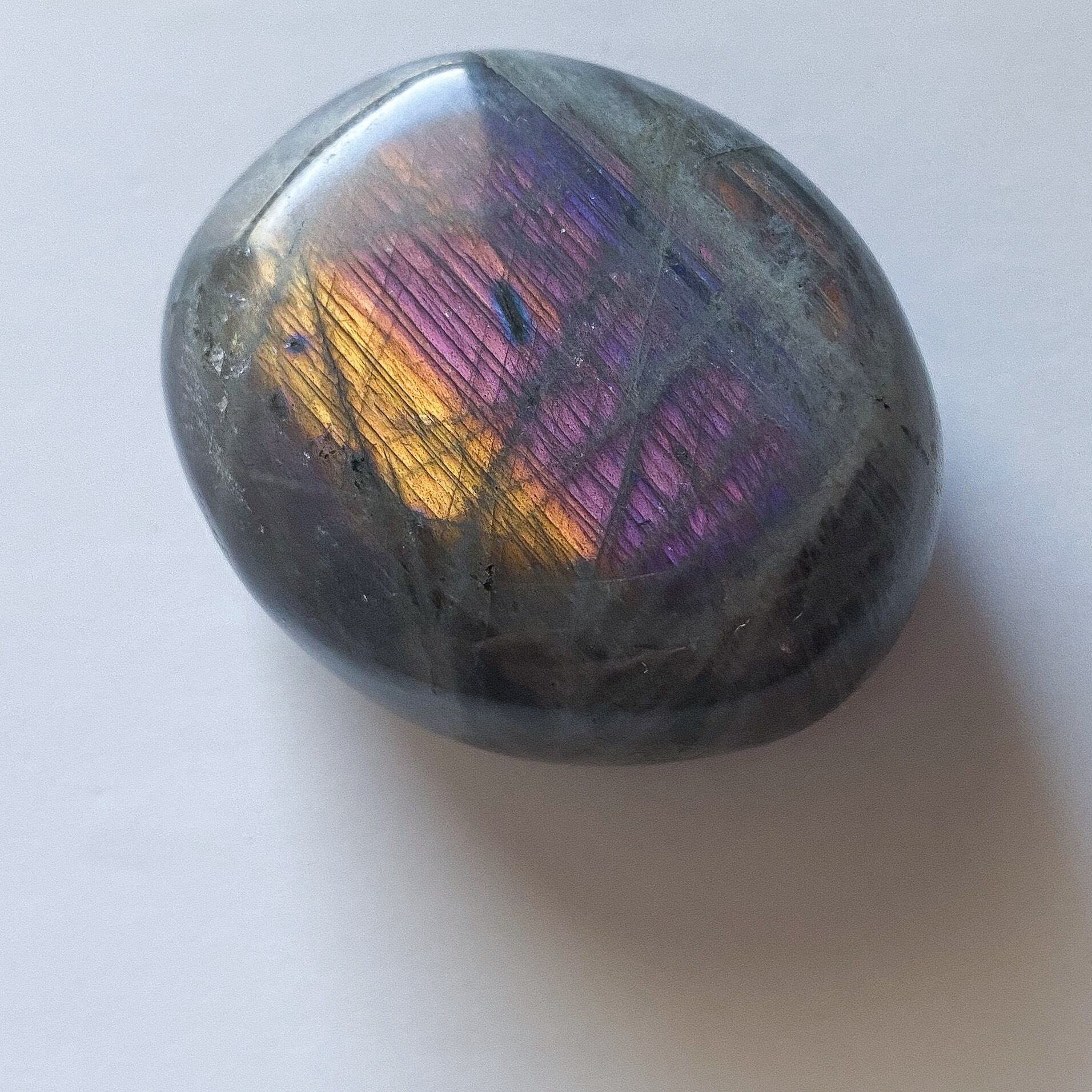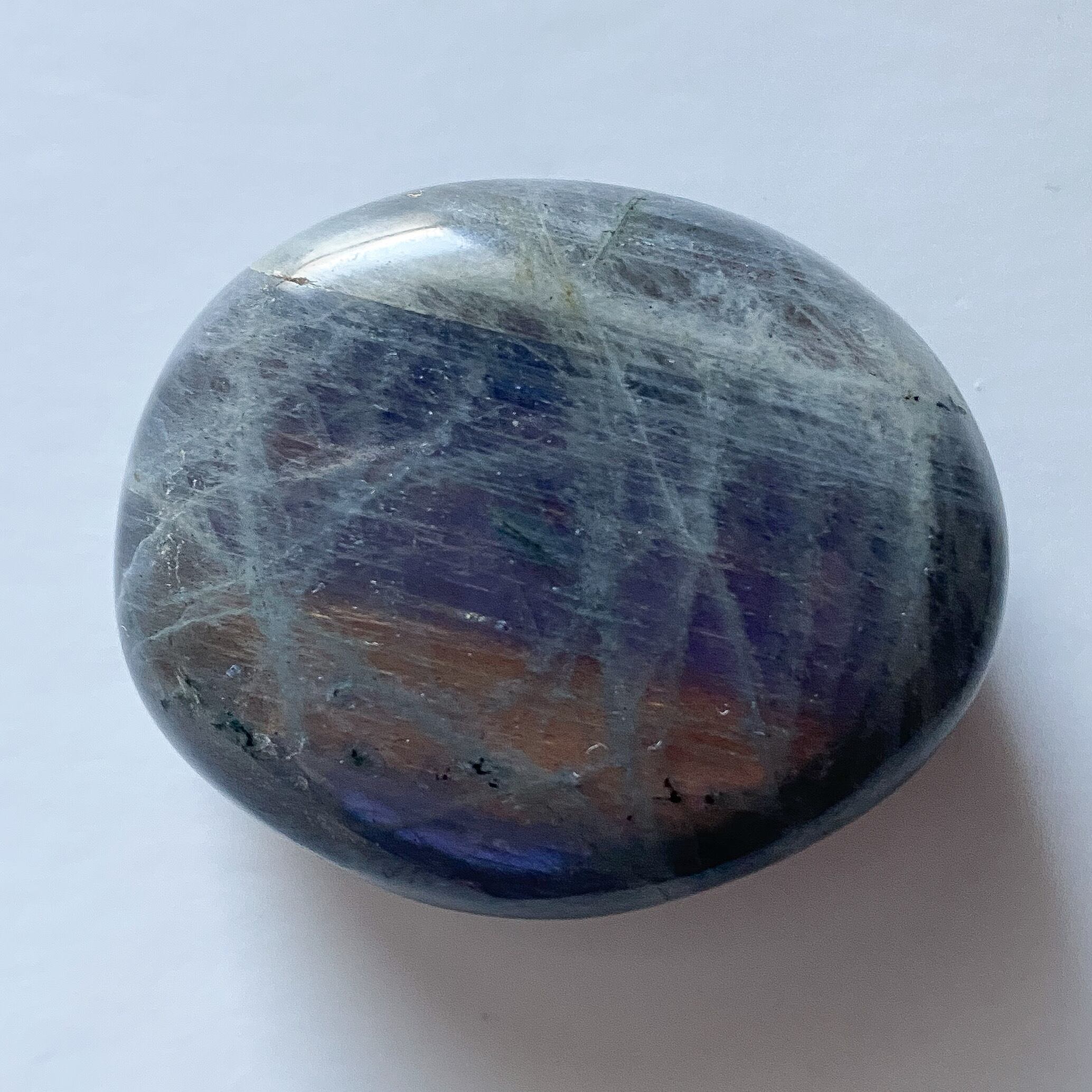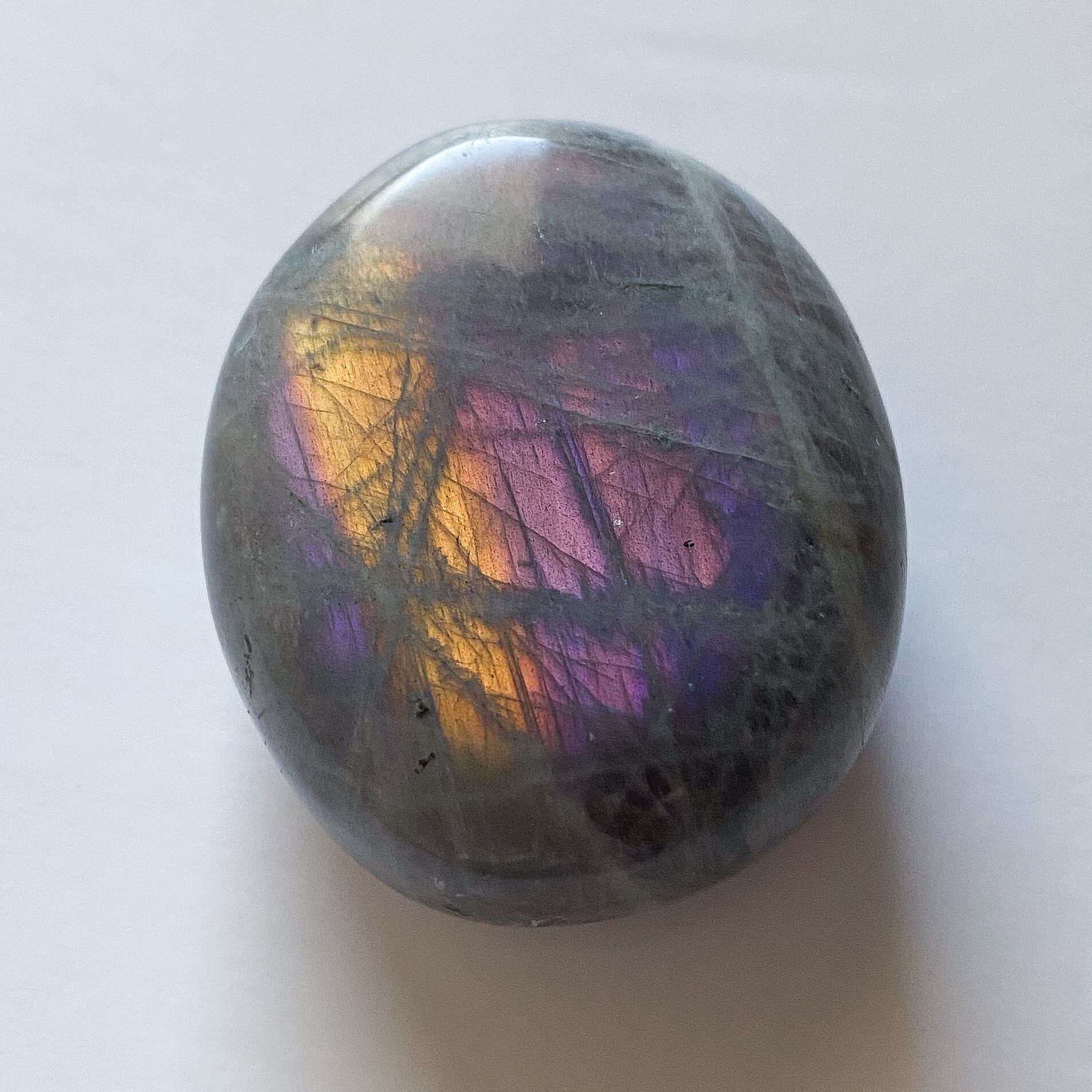 珍しいパープルシラーのラブラドライトです。ピンクカラーと並んで流通数の少ないカラーですので出会う機会は少ないですが、美しさは他のカラーに引けを取らないものであると思います。