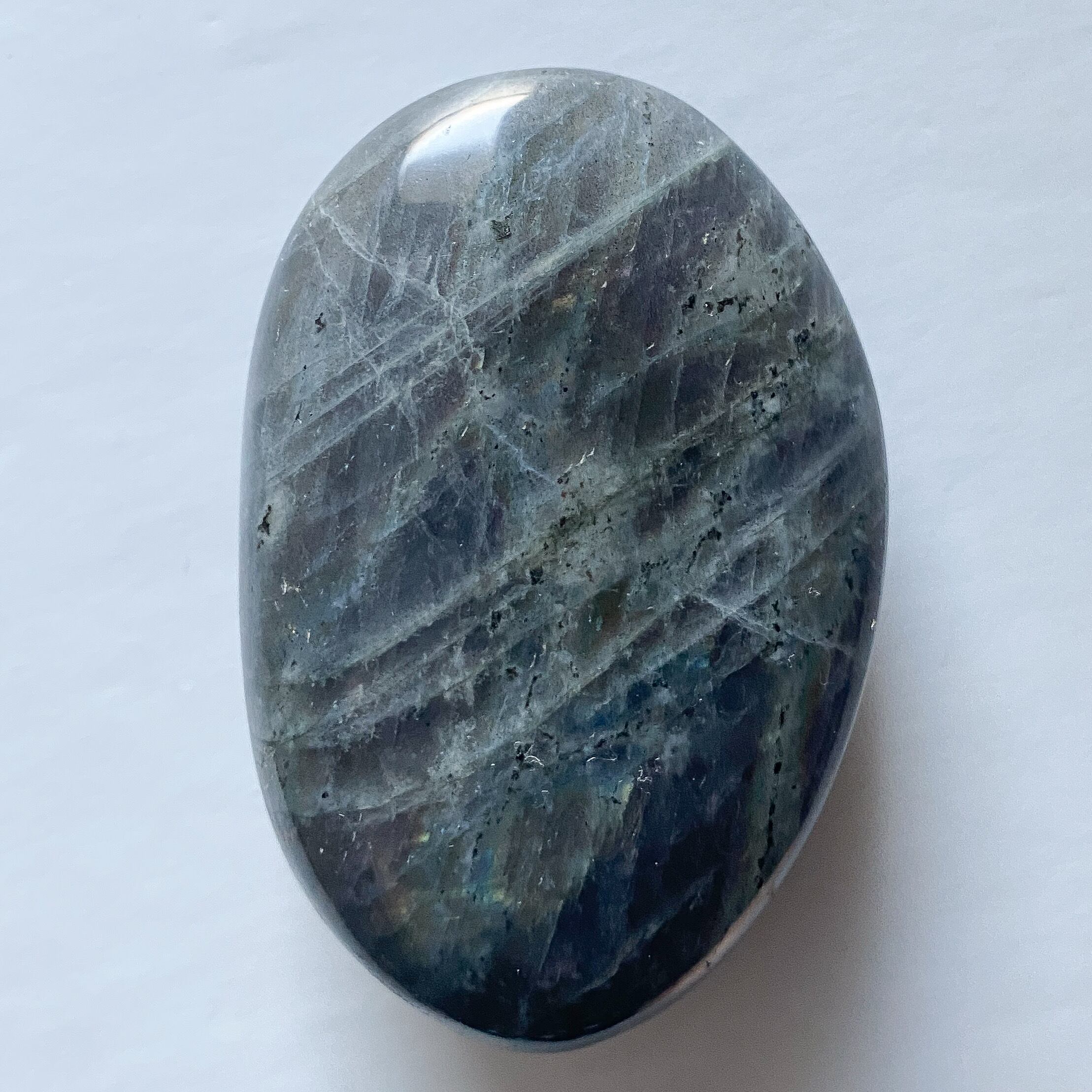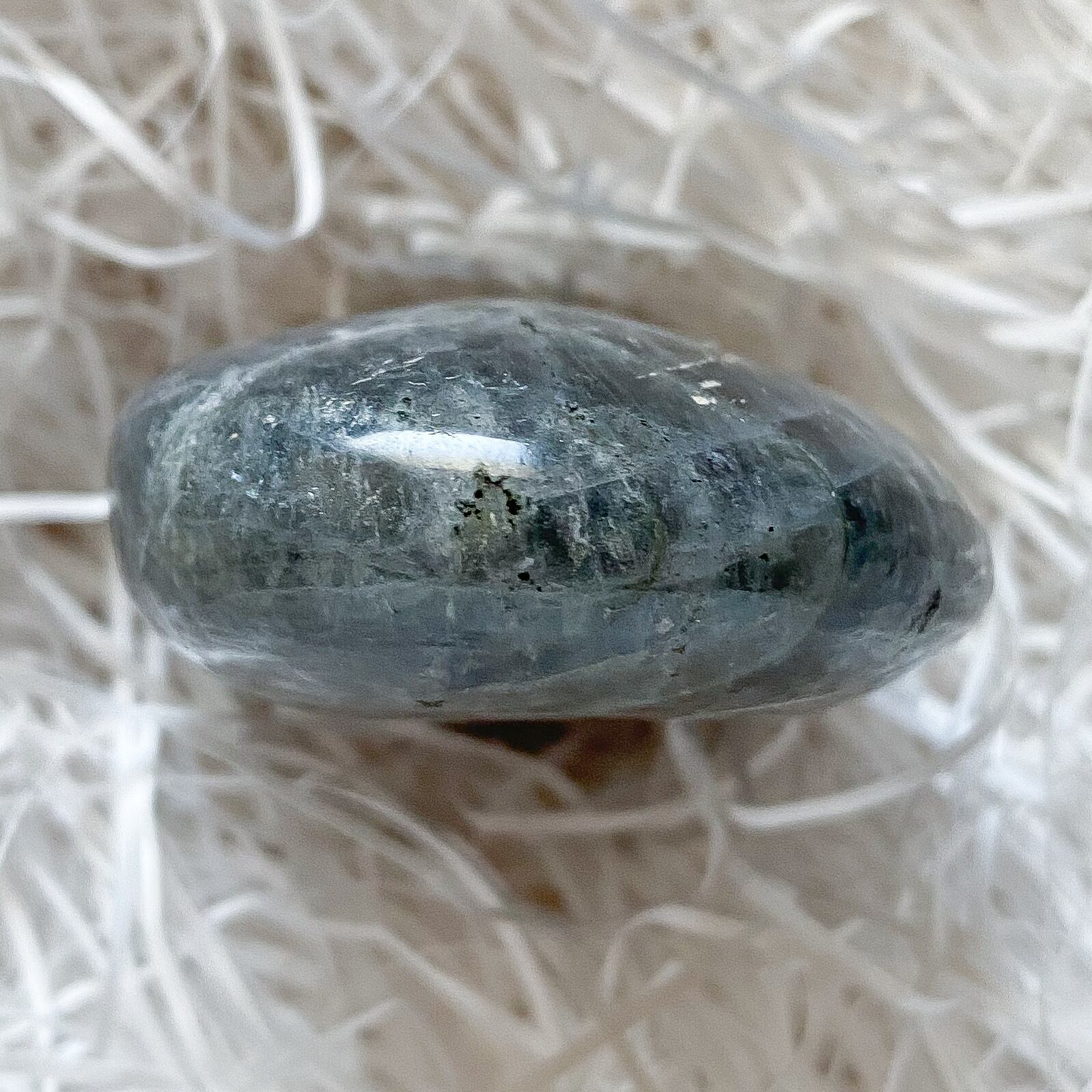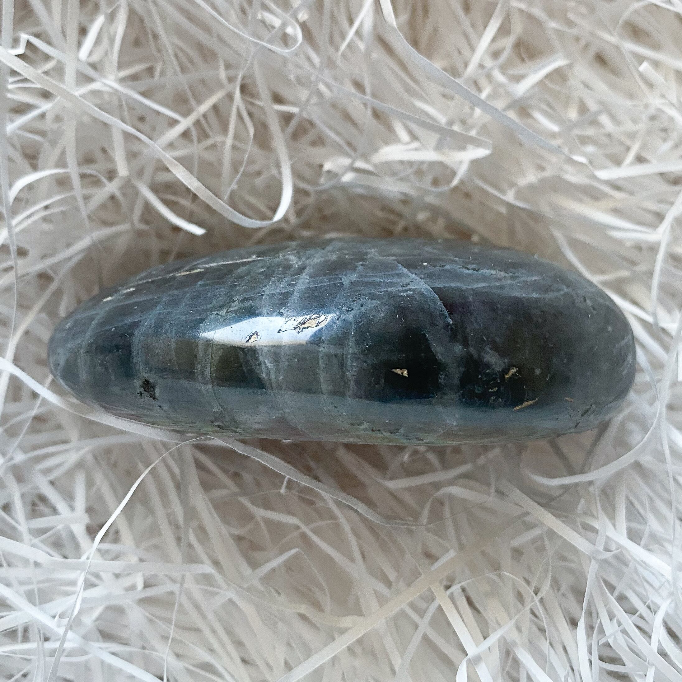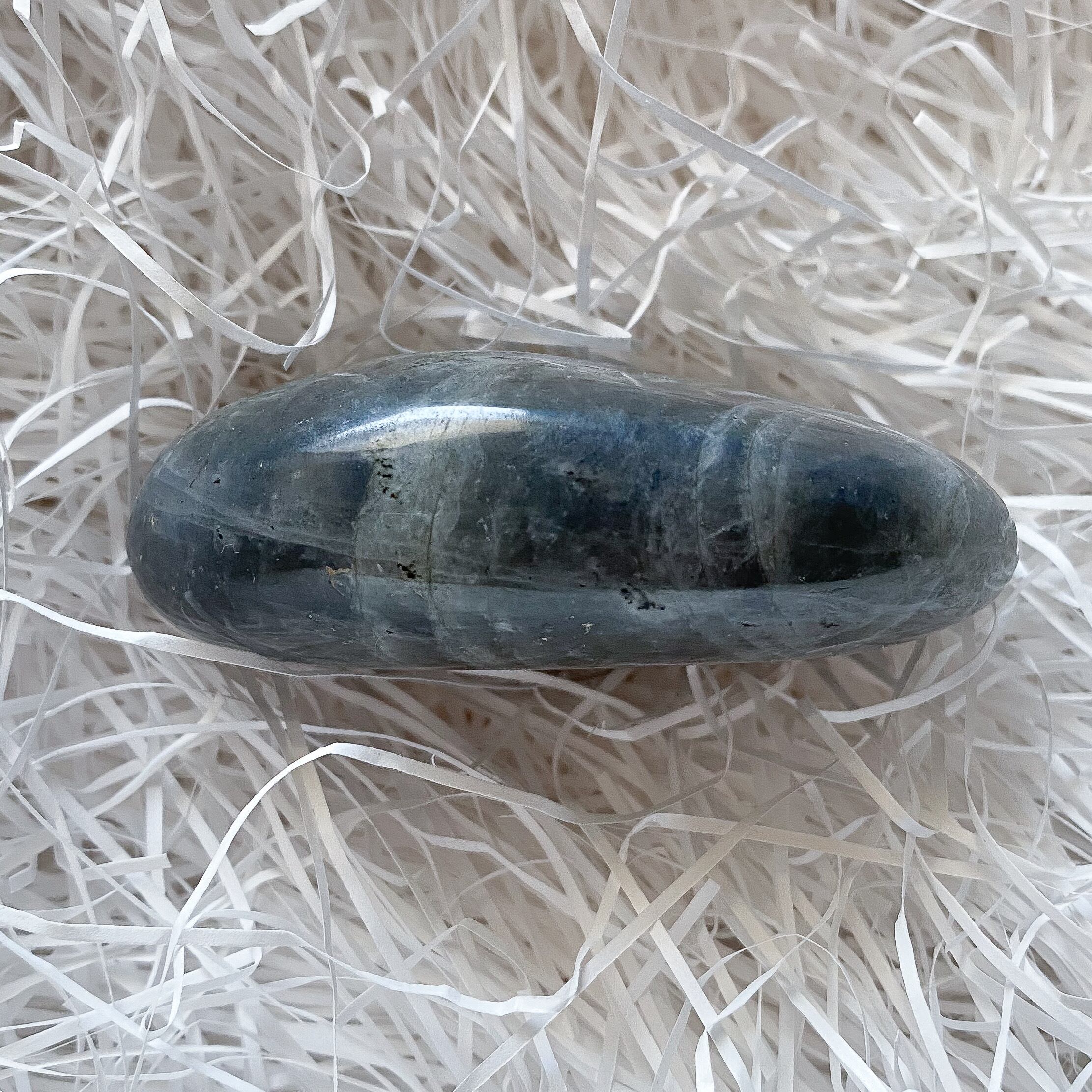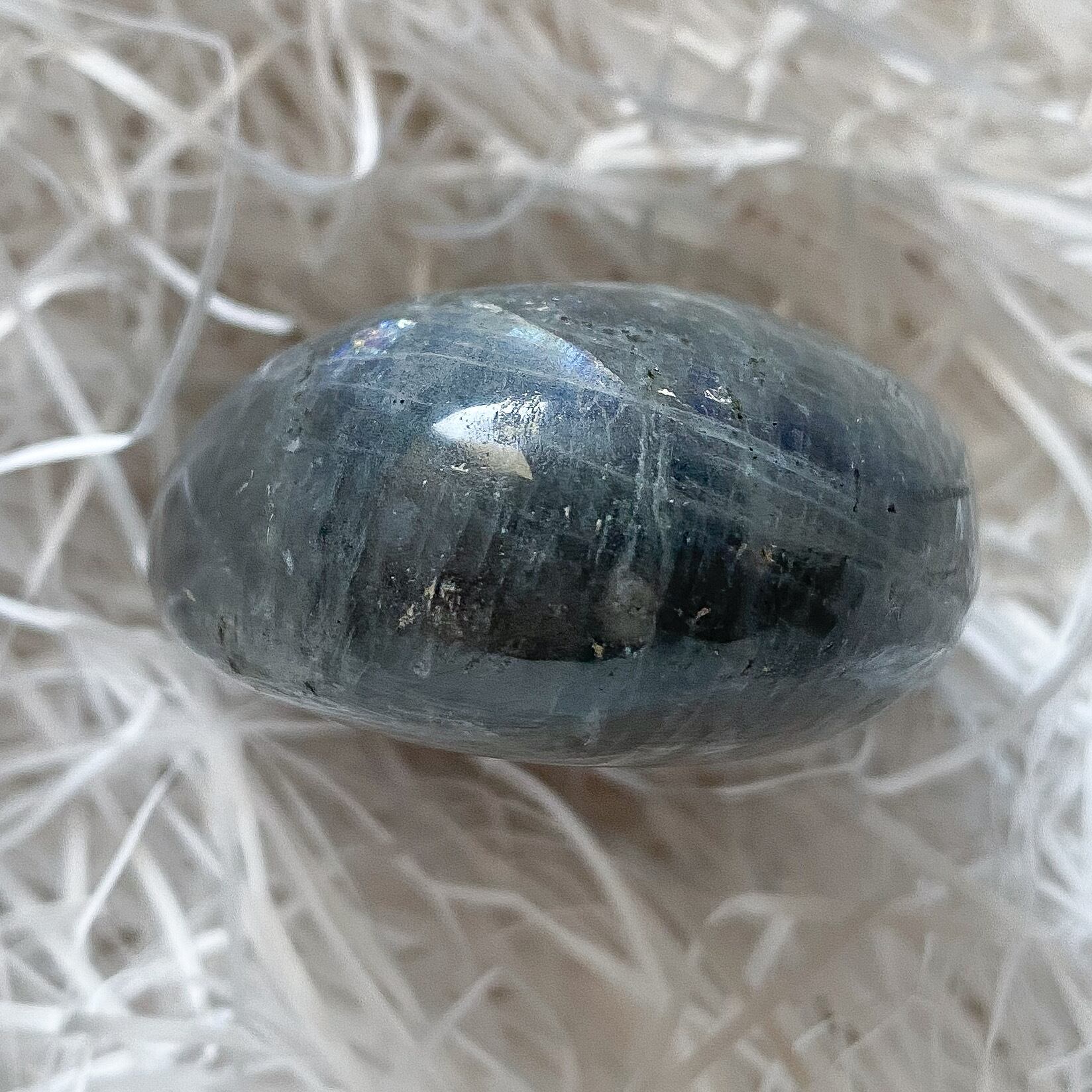 シラーが強く、石をくるくると傾けると薄暗闇の中から瞬間的に稲妻が走ったような模様と蛍光色が覗き、とても印象に残ったパームストーンです。ラブラドライトはインスピレーションを刺激すると言われている石ですが、正にそういった瞬間的な閃きを促してくれそうな気がします。