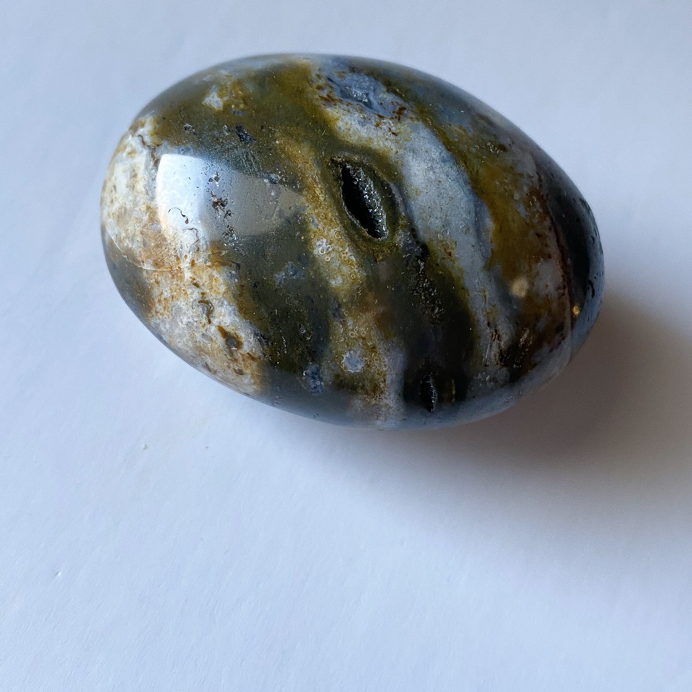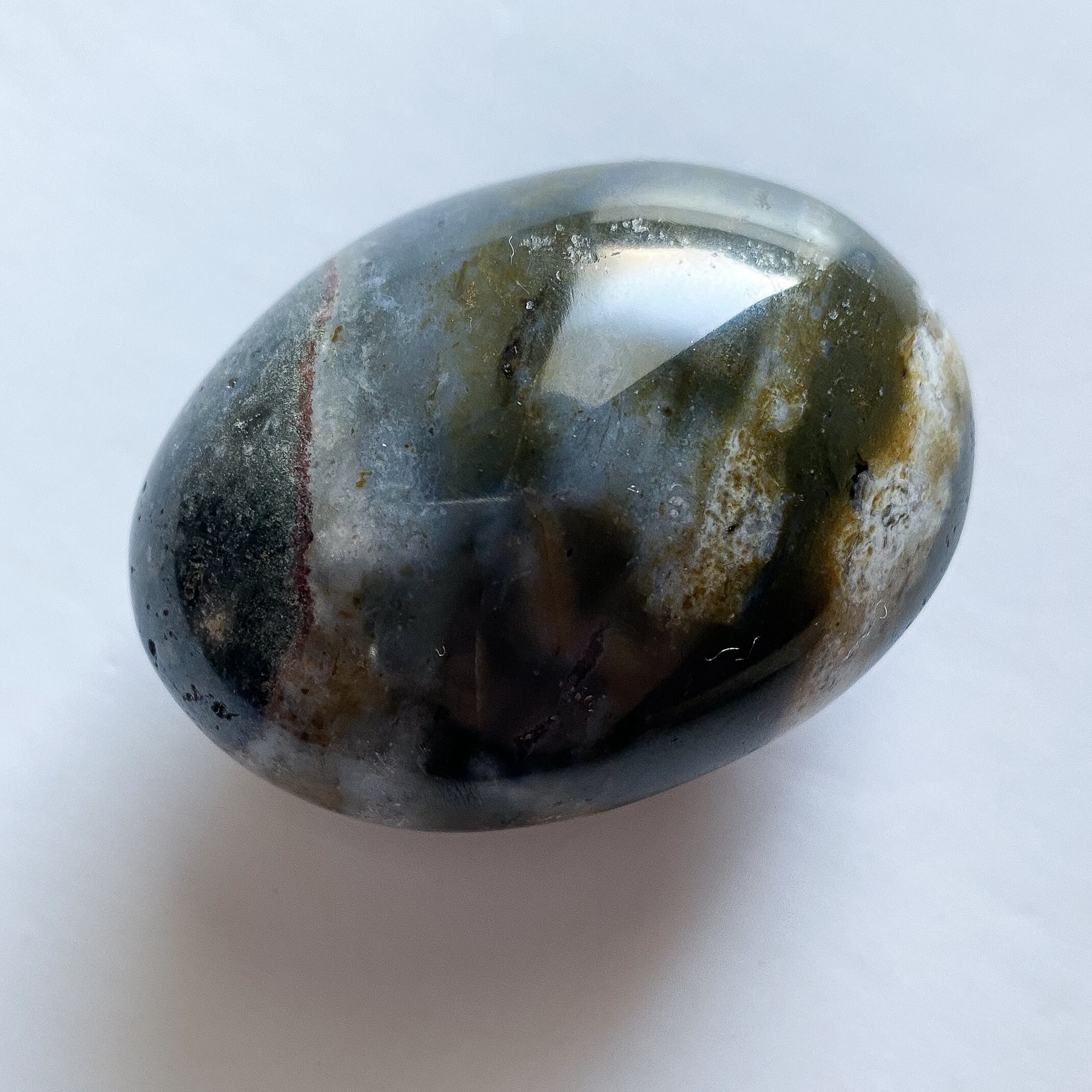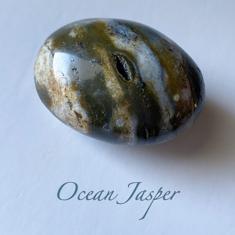 全体的にダークカラーで、モスグリーン、グレー、ブラウンなどのニュアンスカラーがストライプ状に色彩を成しているオーシャンジャスパーです。