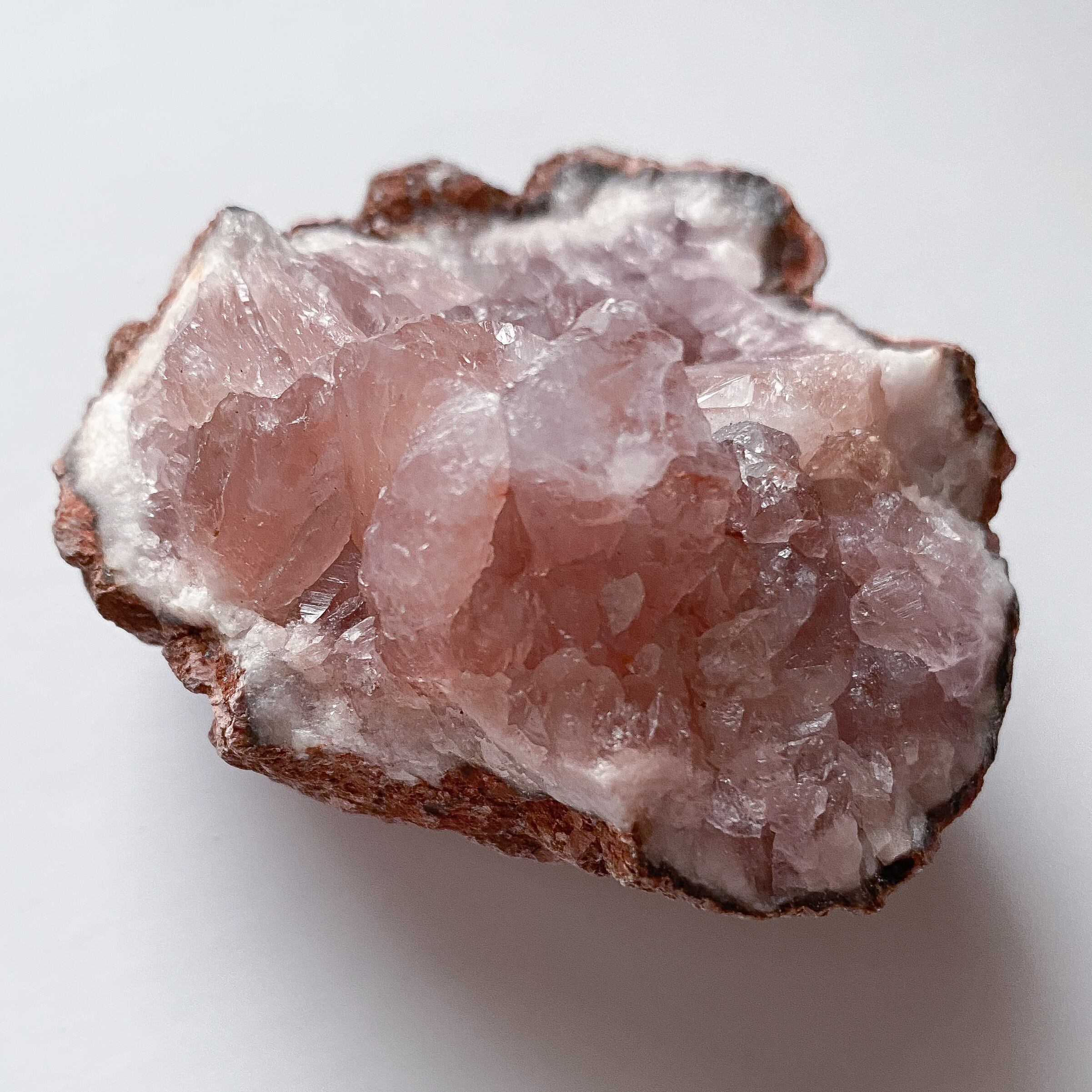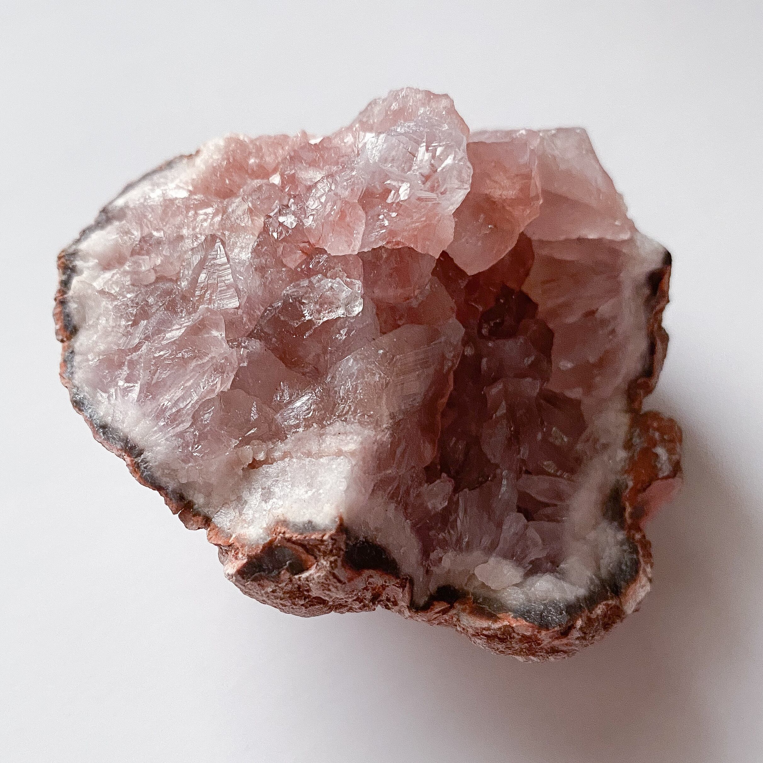 ピンクアメジストはローズクォーツとよく似た色をしていますが鉱物的には鉄分を多く含んだアメジストと言うのが近いようです。ローズクォーツは結晶が大きく育ちやすいのに対し、ピンクアメジストは小さな晶洞を形成します。瑪瑙やカルサイト等他の鉱物との共生もよく見られます。