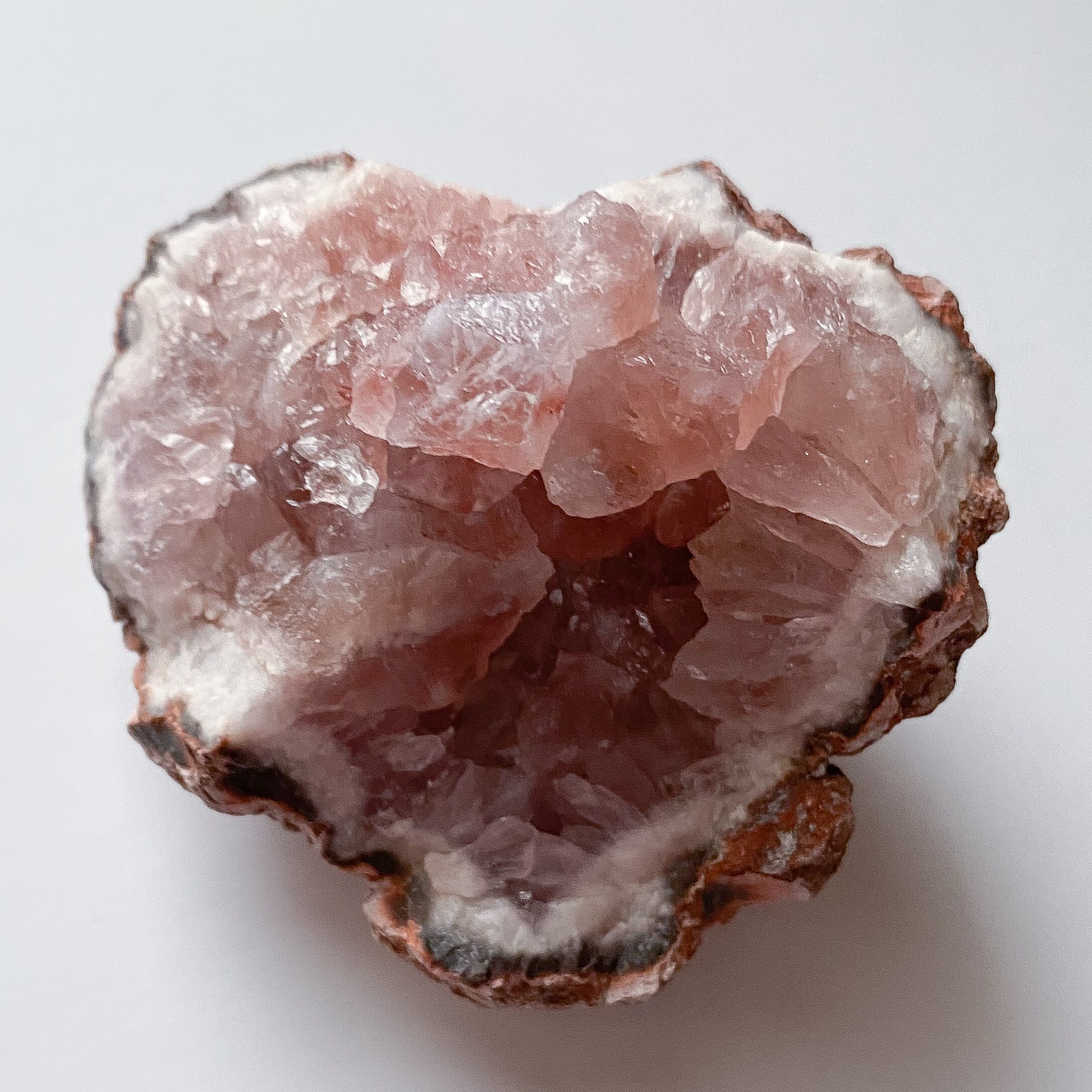 ジオード状ではなく一つ一つの結晶の粒が大きく内側にぎゅっと詰まったタイプとなります。結晶の外側はピンク、内側にいくとやや紫がかったピンク色で、森の中の木の実や果実を割ったような雰囲気があります。