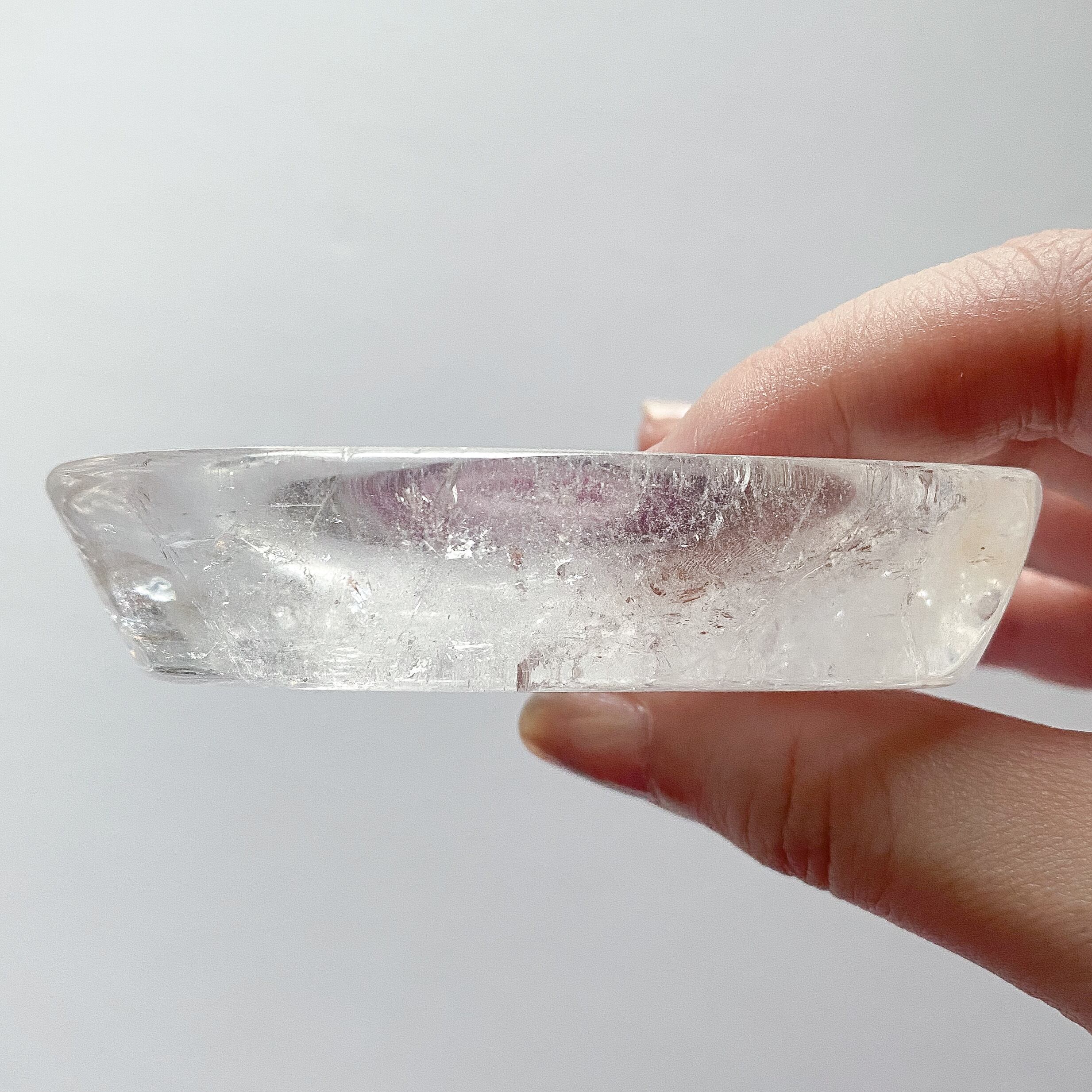 向こう側がはっきりと見える透明度の高さと虹が所々に見られる爽やかな水晶ボウルです。