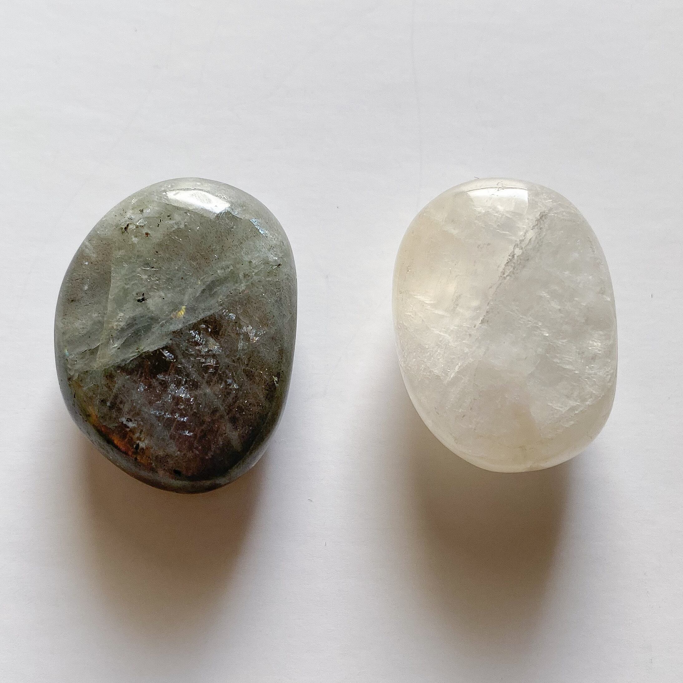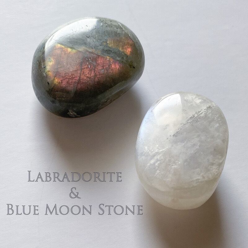 ラブラドライトとブルームーンストーンの小さなタンブルセットです。