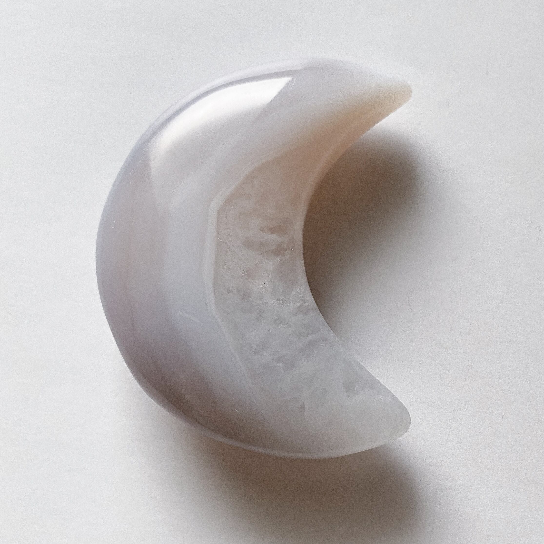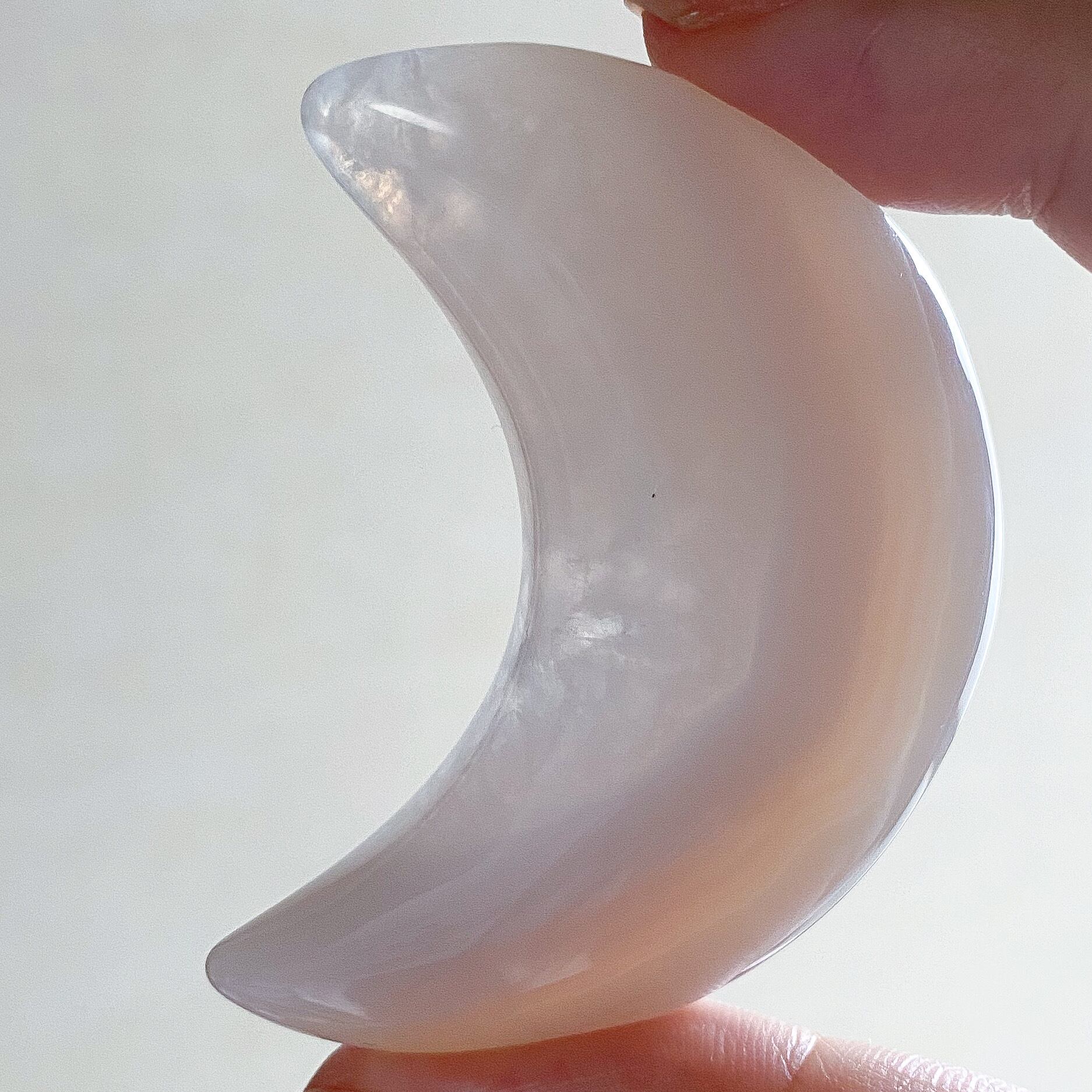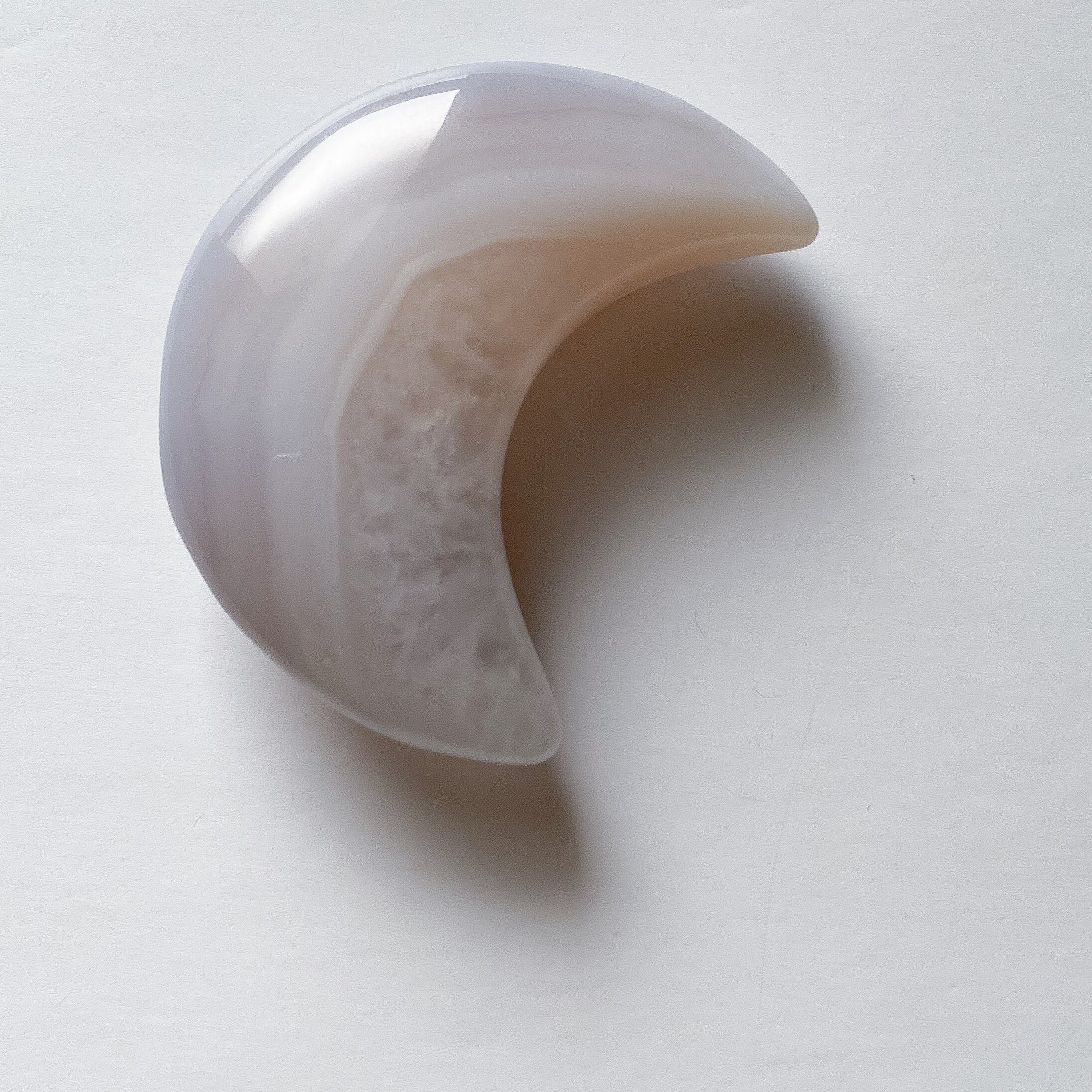 月の内側の部分がクォーツ化しておりクォーツの部分はホワイトの結晶です。外側は包み込むような柄のグレーカラーの瑪瑙となっています。光に透かすとこちらもグレー味が飛び淡いベージュ〜ホワイトカラーのお月様になります。