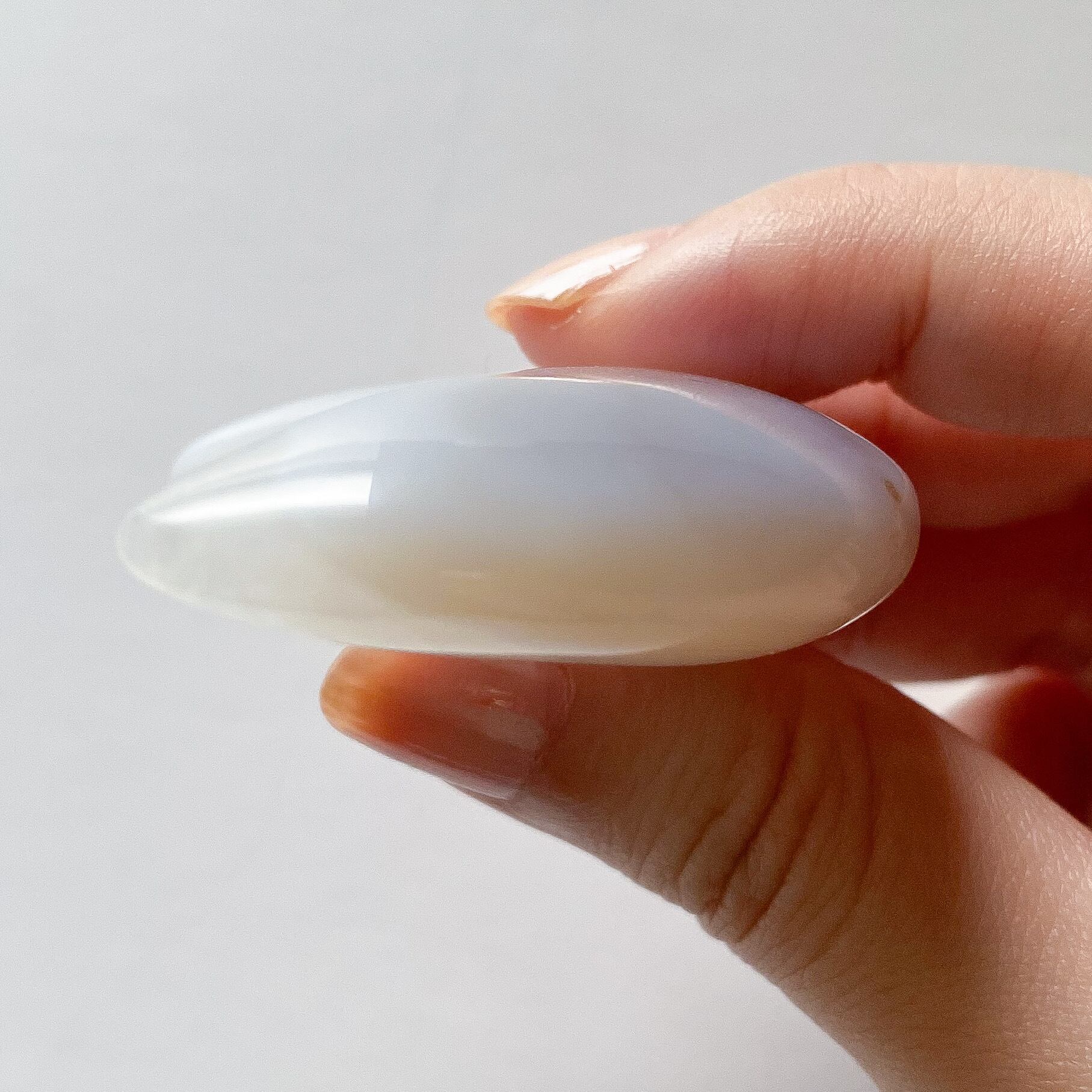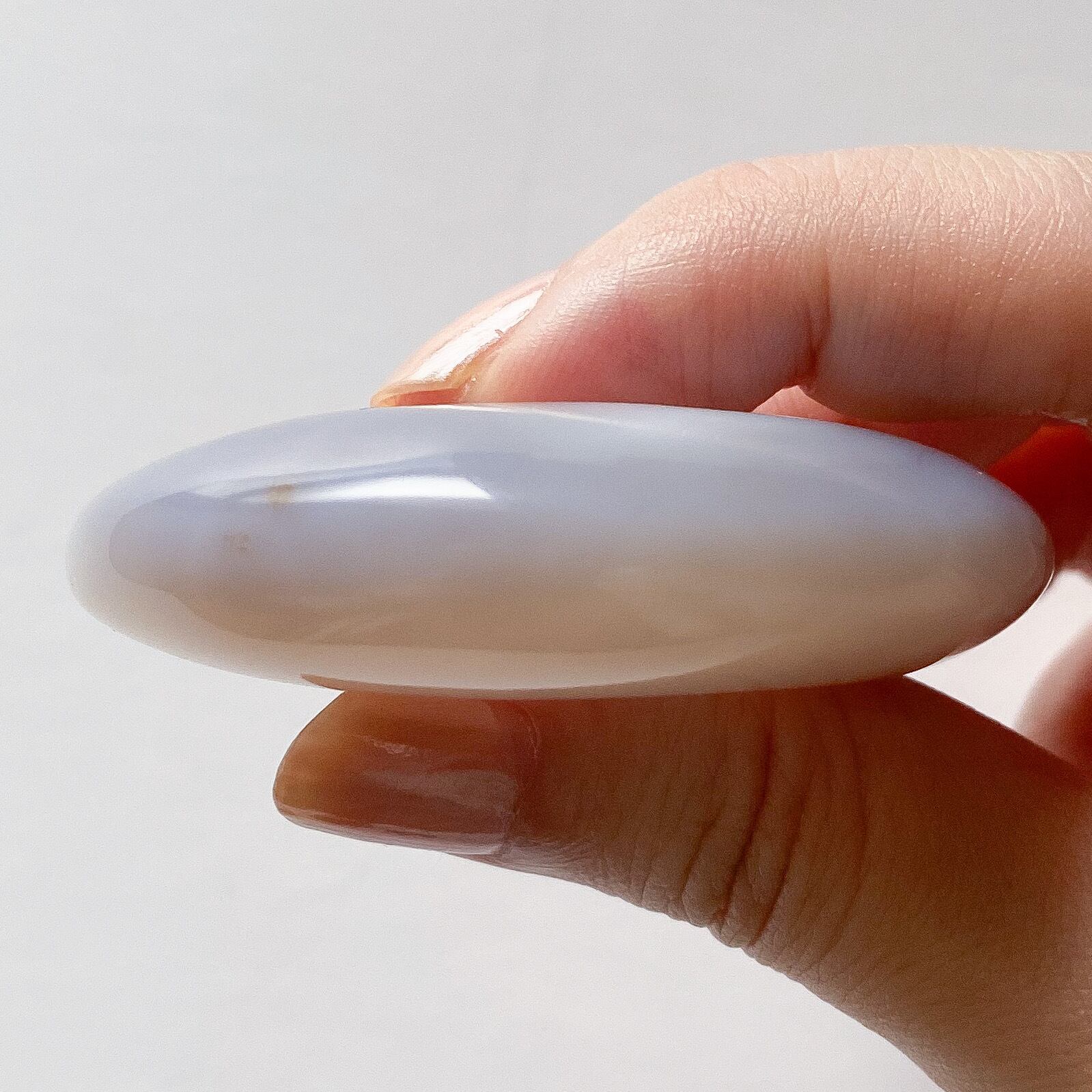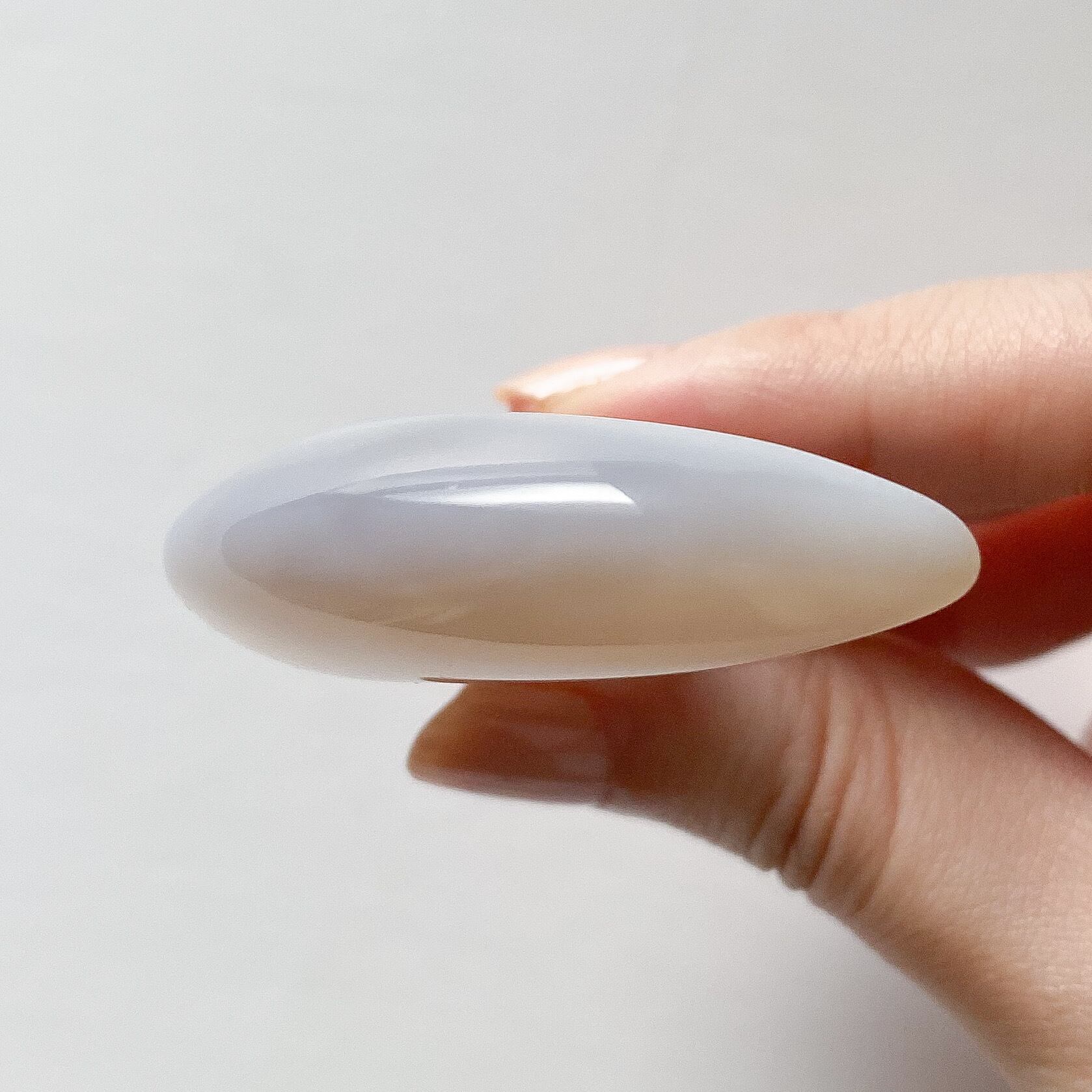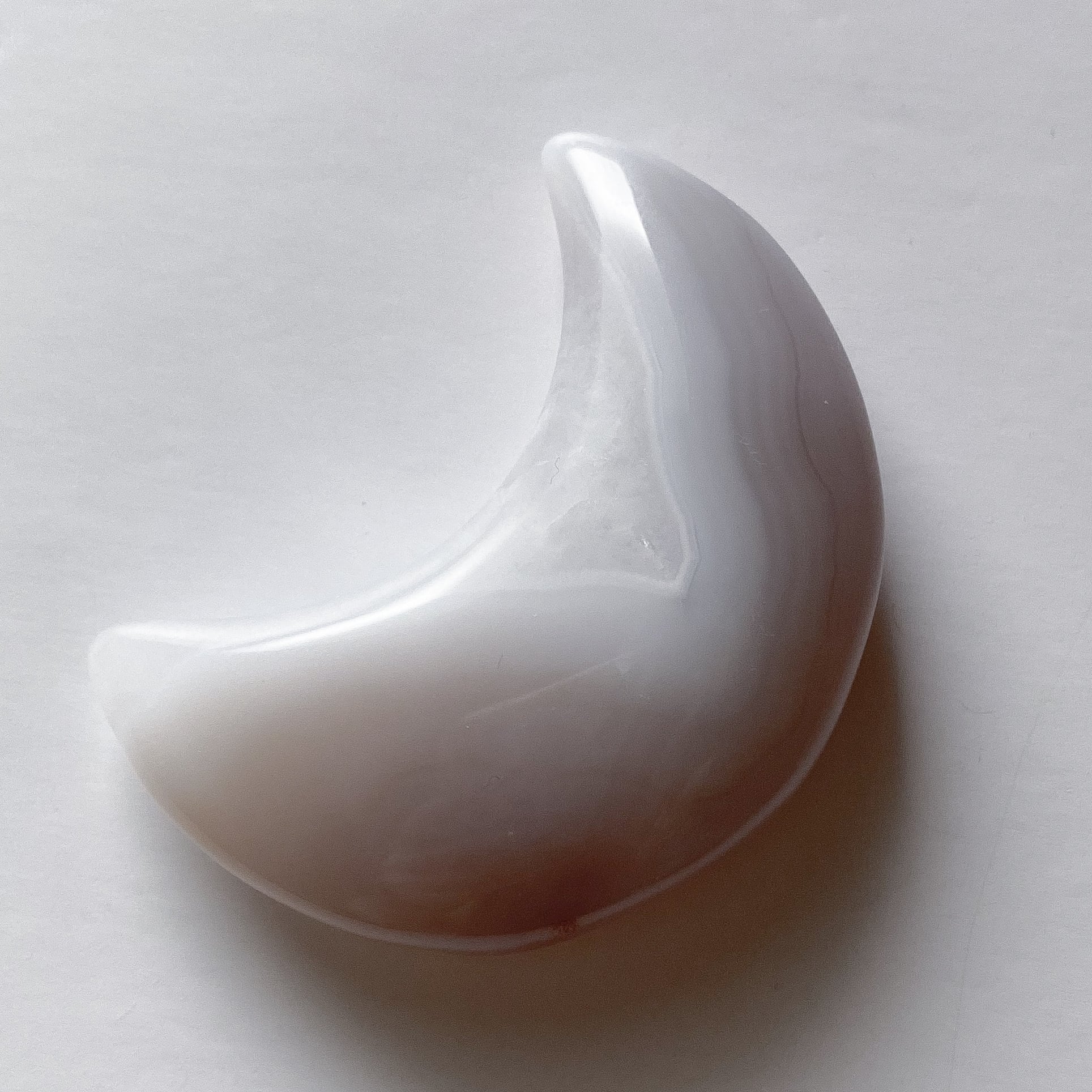 月の内側の部分がクォーツ化しておりクォーツの部分はホワイトの結晶です。外側は包み込むような柄のグレーカラーの瑪瑙となっています。光に透かすとこちらもグレー味が飛び淡いベージュ〜ホワイトカラーのお月様になります。