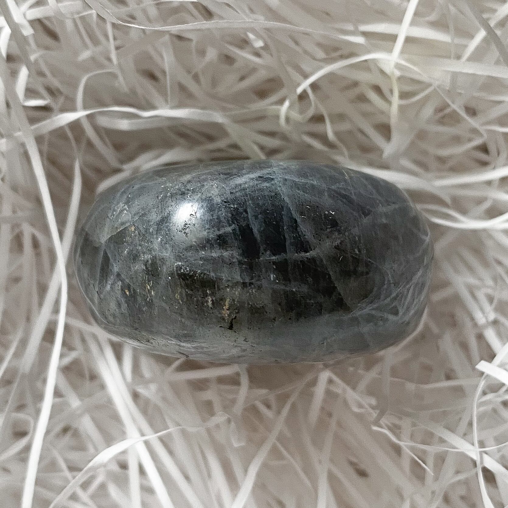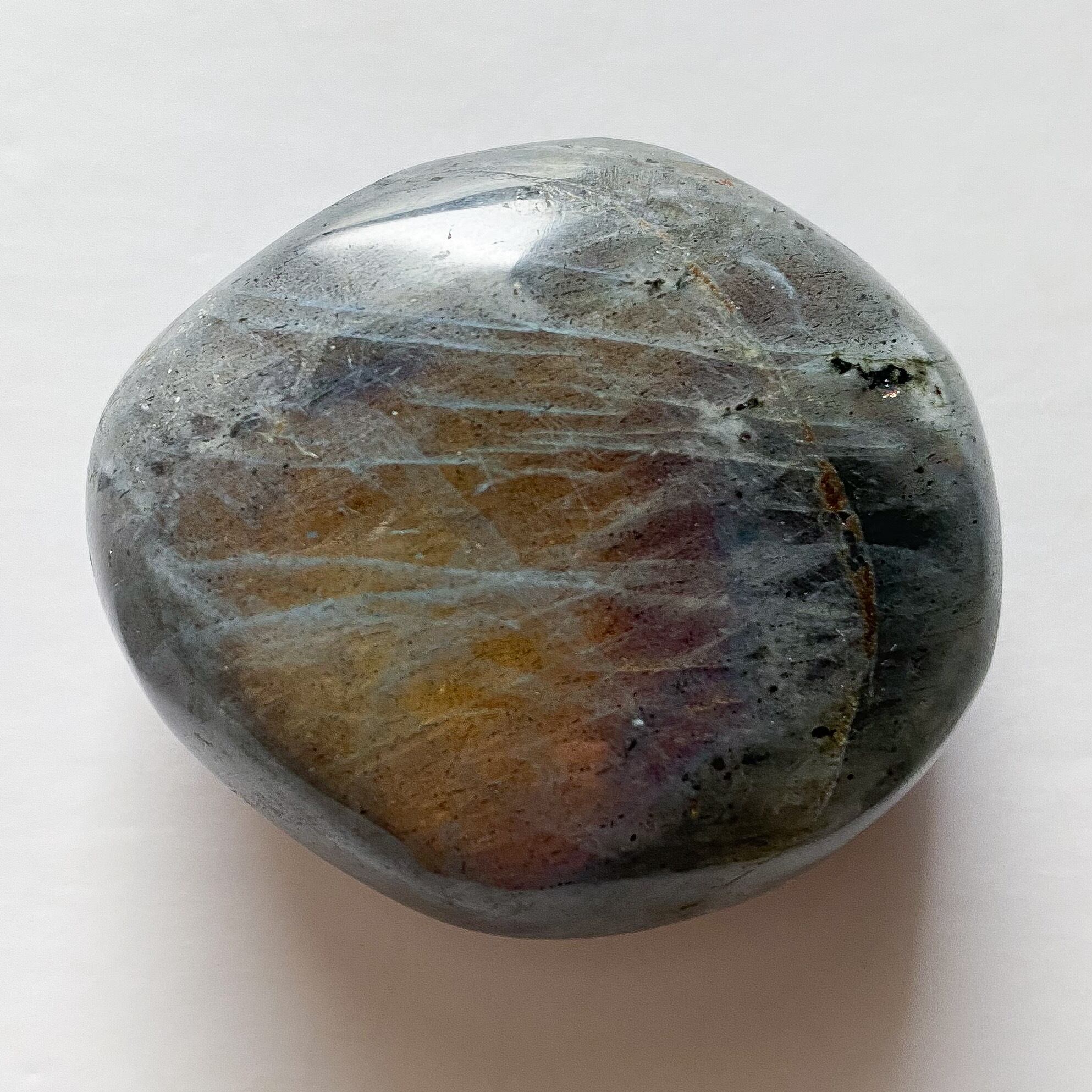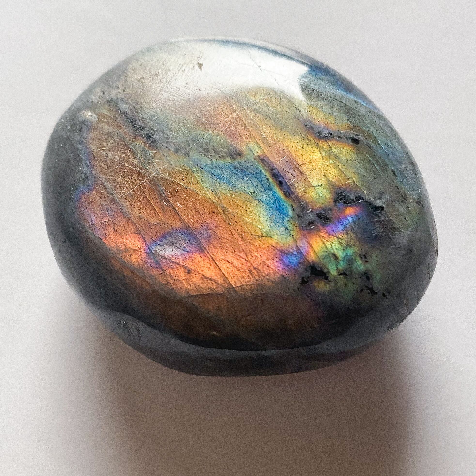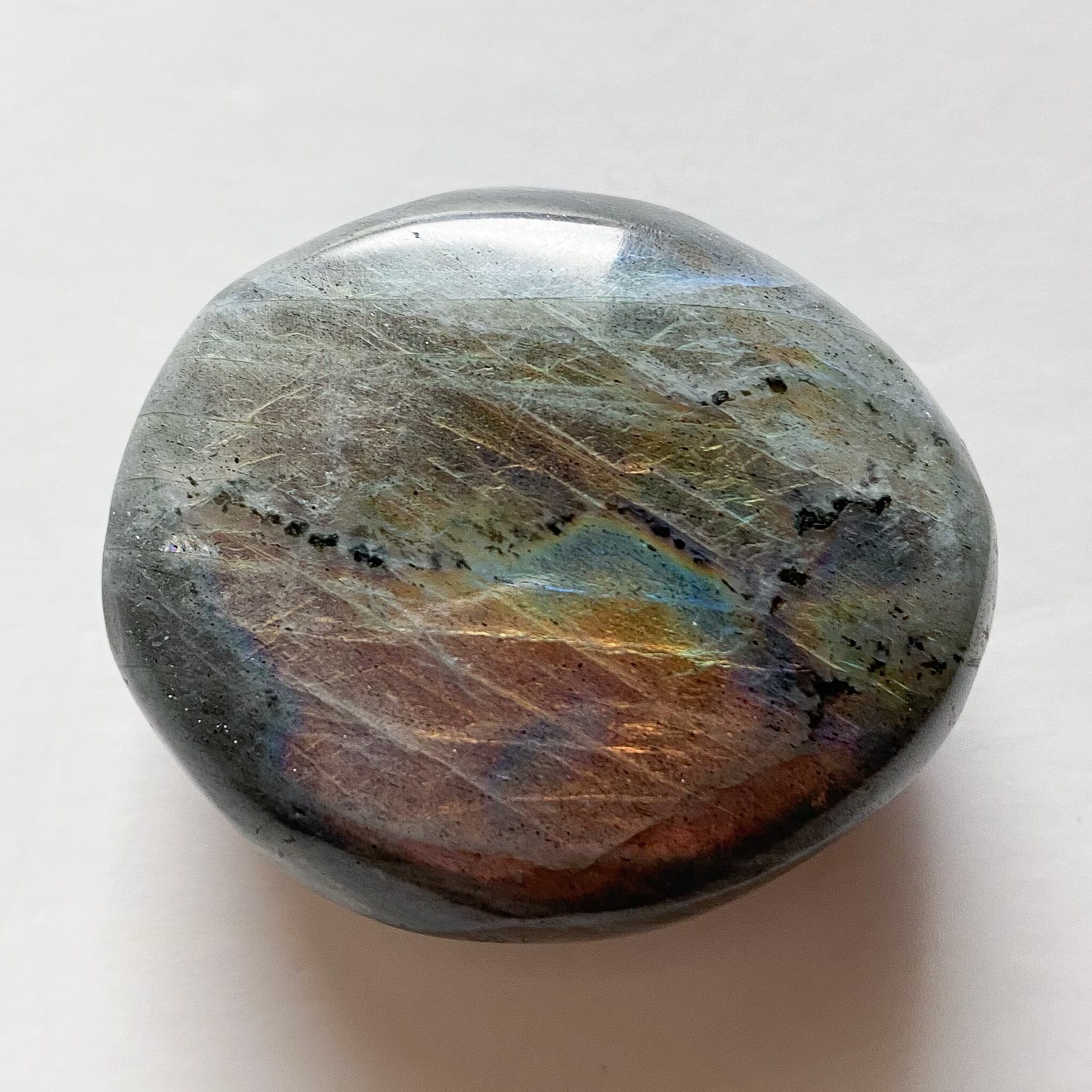地色が灰〜黒色で、内部にラブラドレッセンスと呼ばれるシラーの層を持ちます。シラーの色は多彩で青色、虹色、ピンク、紫と様々です。