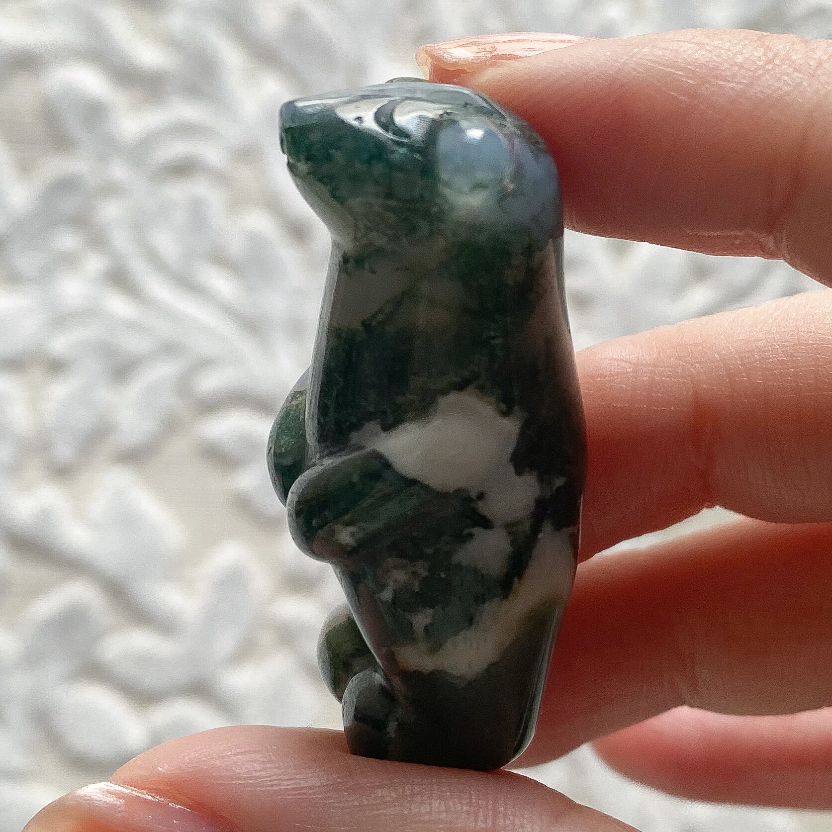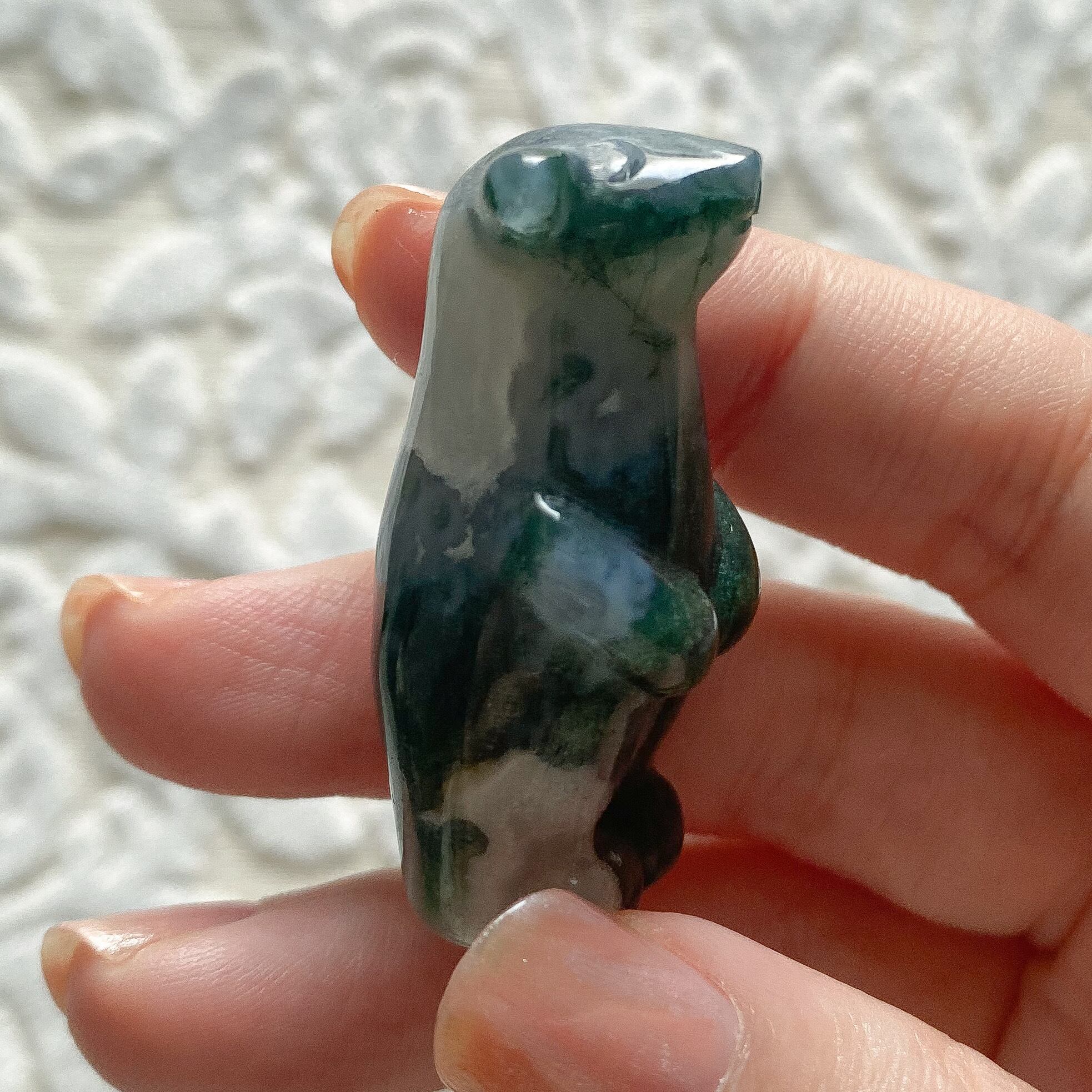 クマさんは深いグリーンカラーの中にクォーツの白、瑪瑙の淡いブルーなどが入っています。
