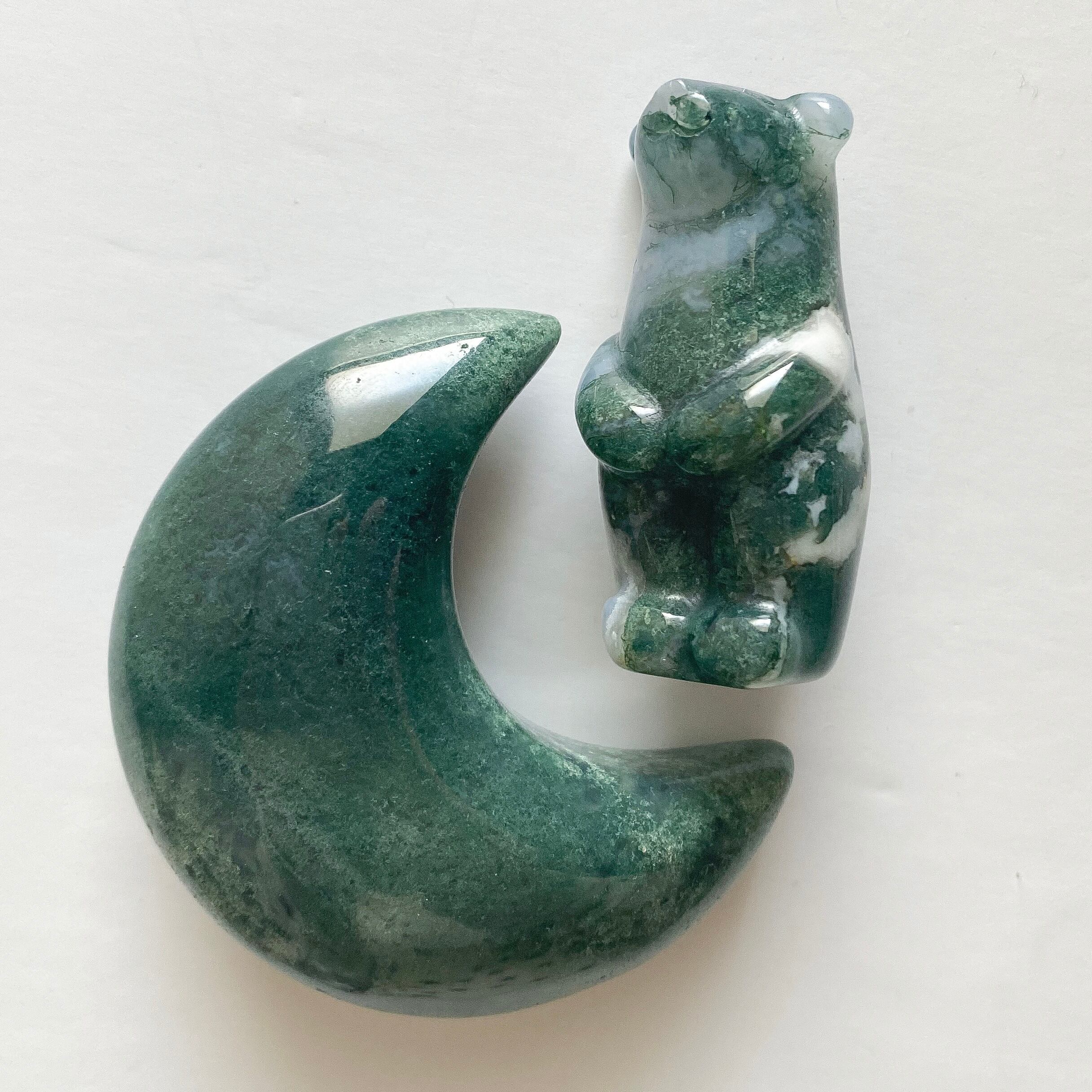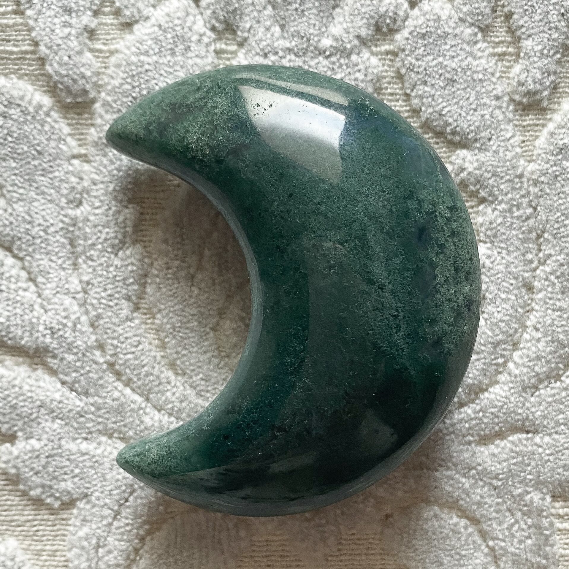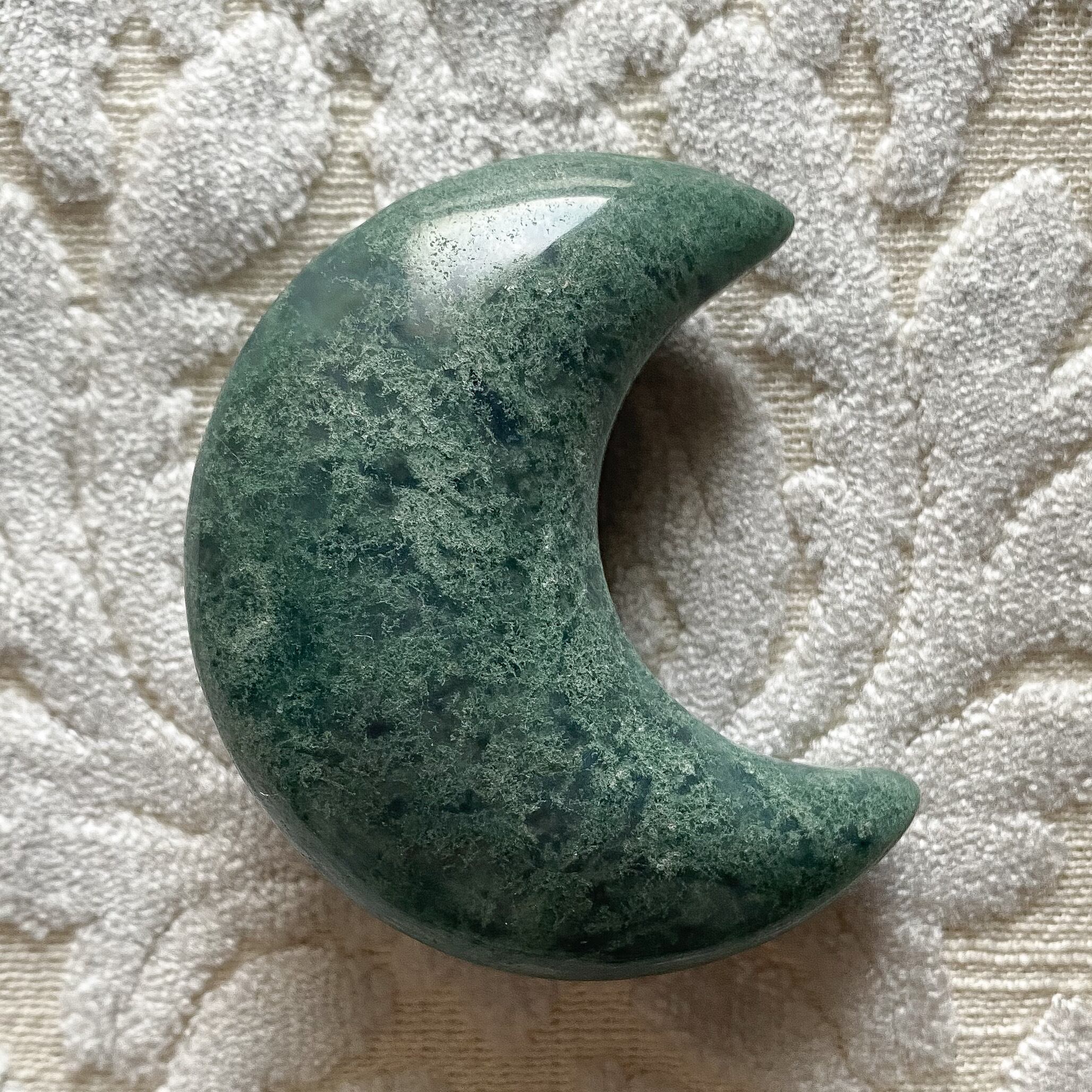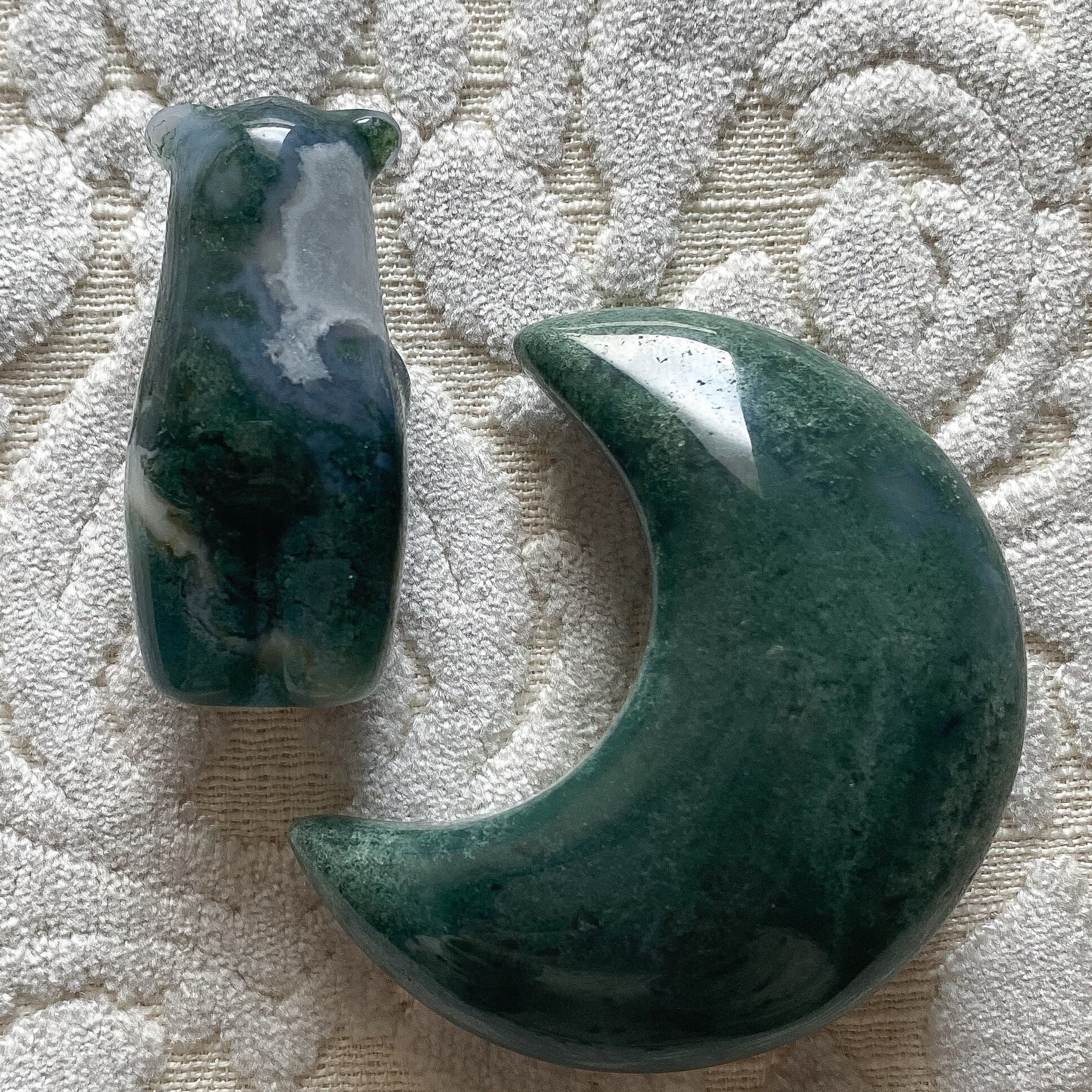 お月様は濃淡のあるグリーンのクローライトがぎゅっと詰まった、瑪瑙とクローライトだけの世界です。瑪瑙の艶感とクローライトのグリーンカラーが優しく癒しを運んでくれそうです。