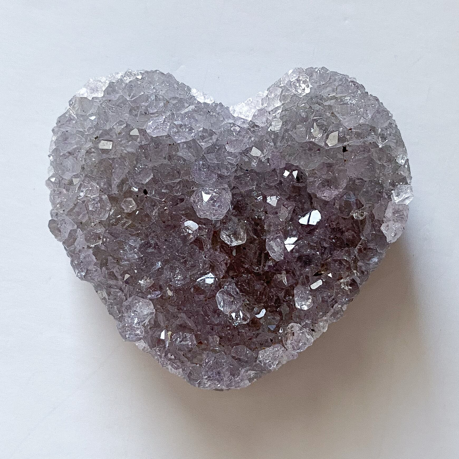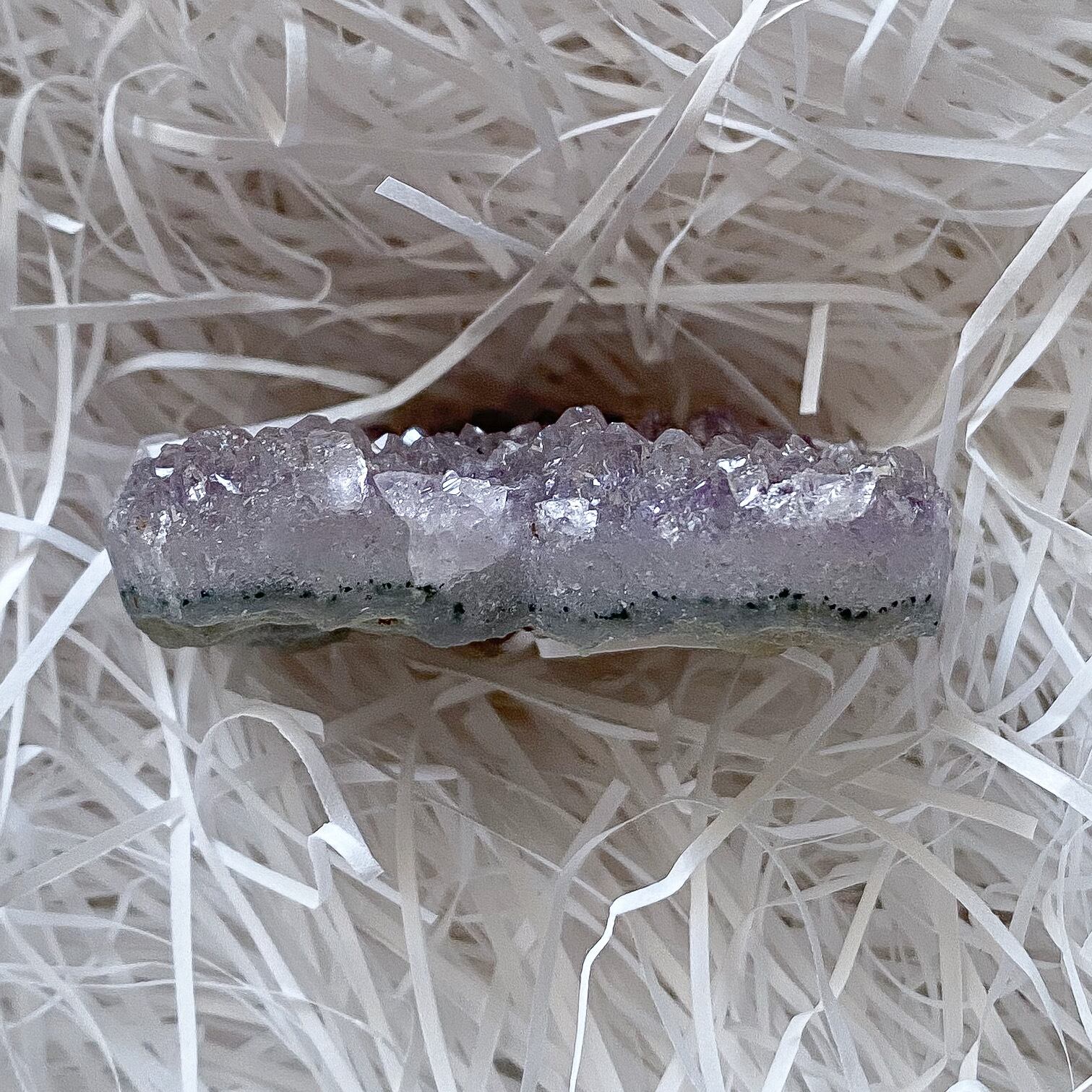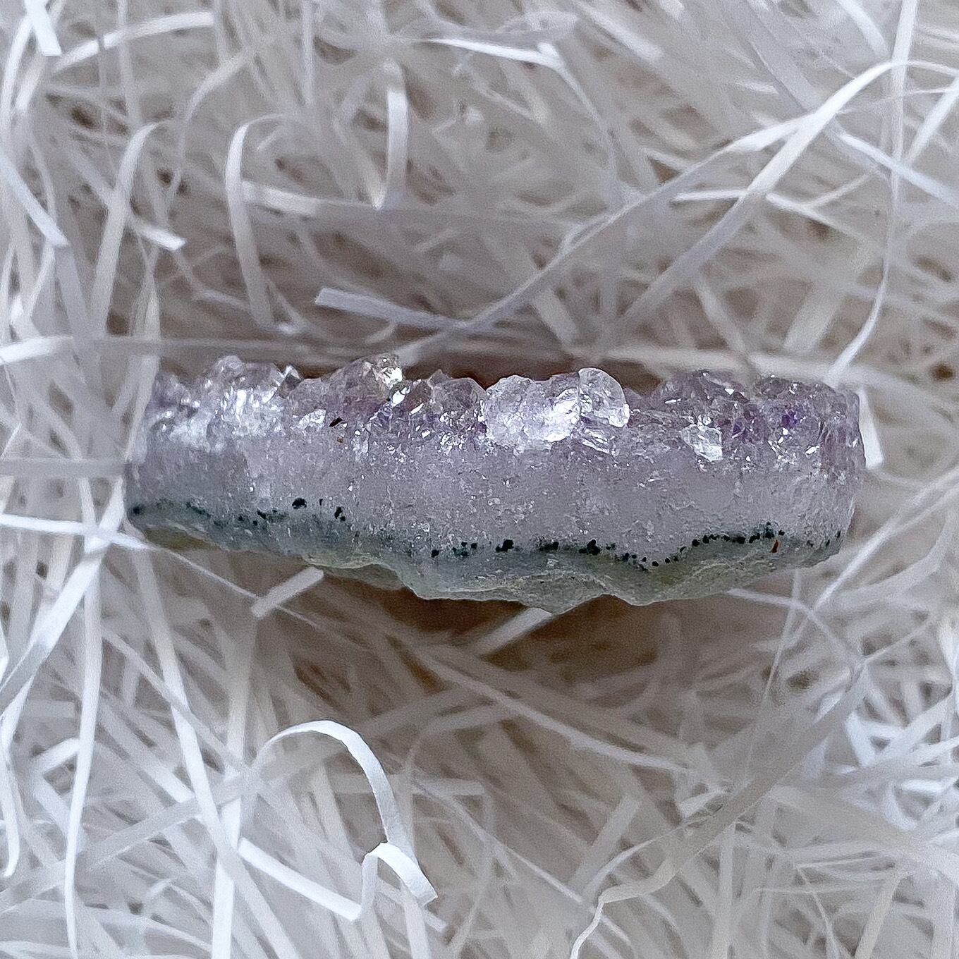 アメジストクラスターは少しグレー味のあるラベンダーパープルカラーで母岩の部分も瑪瑙化していて光を通します。