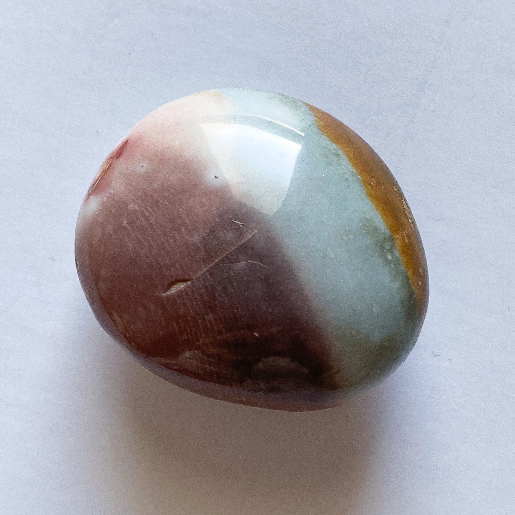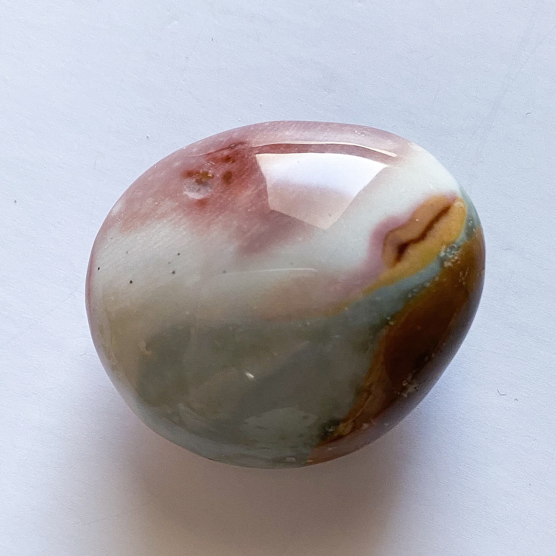 ポリクロームジャスパーは全体的にミルキーカラーでブラウン、ホワイト、ブルーなど様々な色合いが両面に見られます。