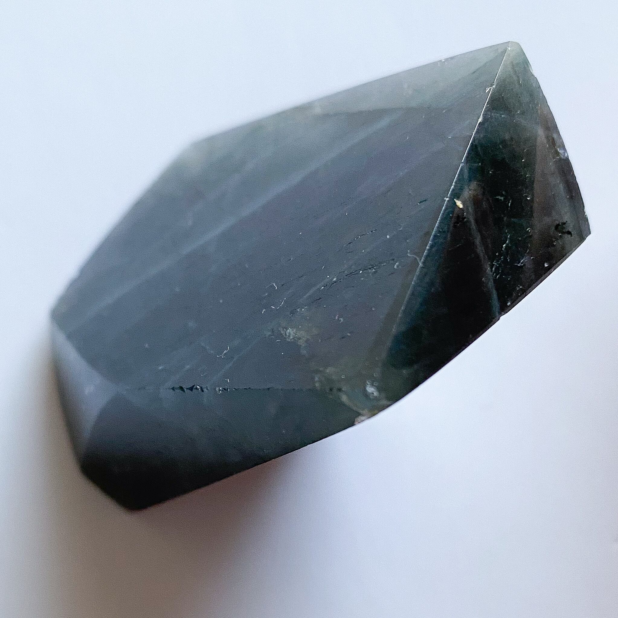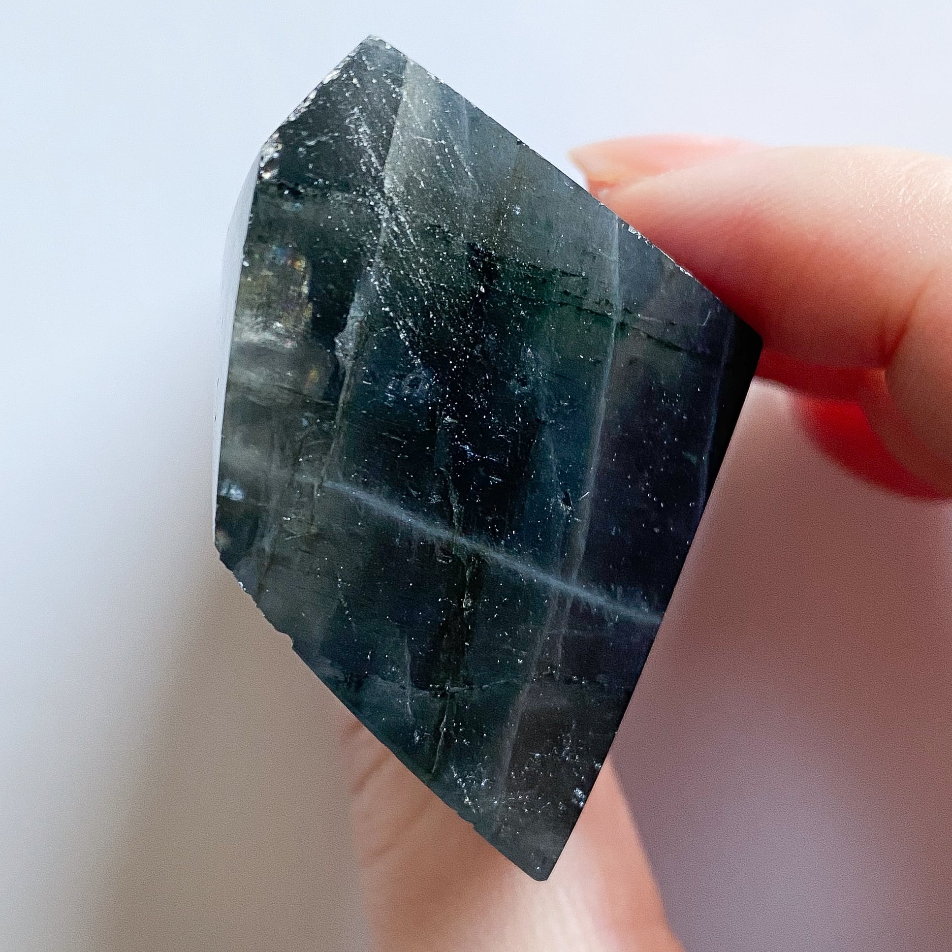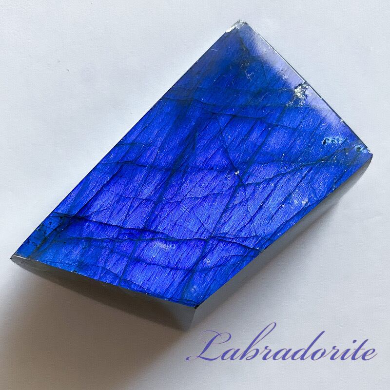 カットの関係でシラーが良い角度で出る面が写真の一面のみとなりますが、ラブラドライトの黒い地色や地色の中に現れるラメのような煌めきも美しいフリーフォームです。